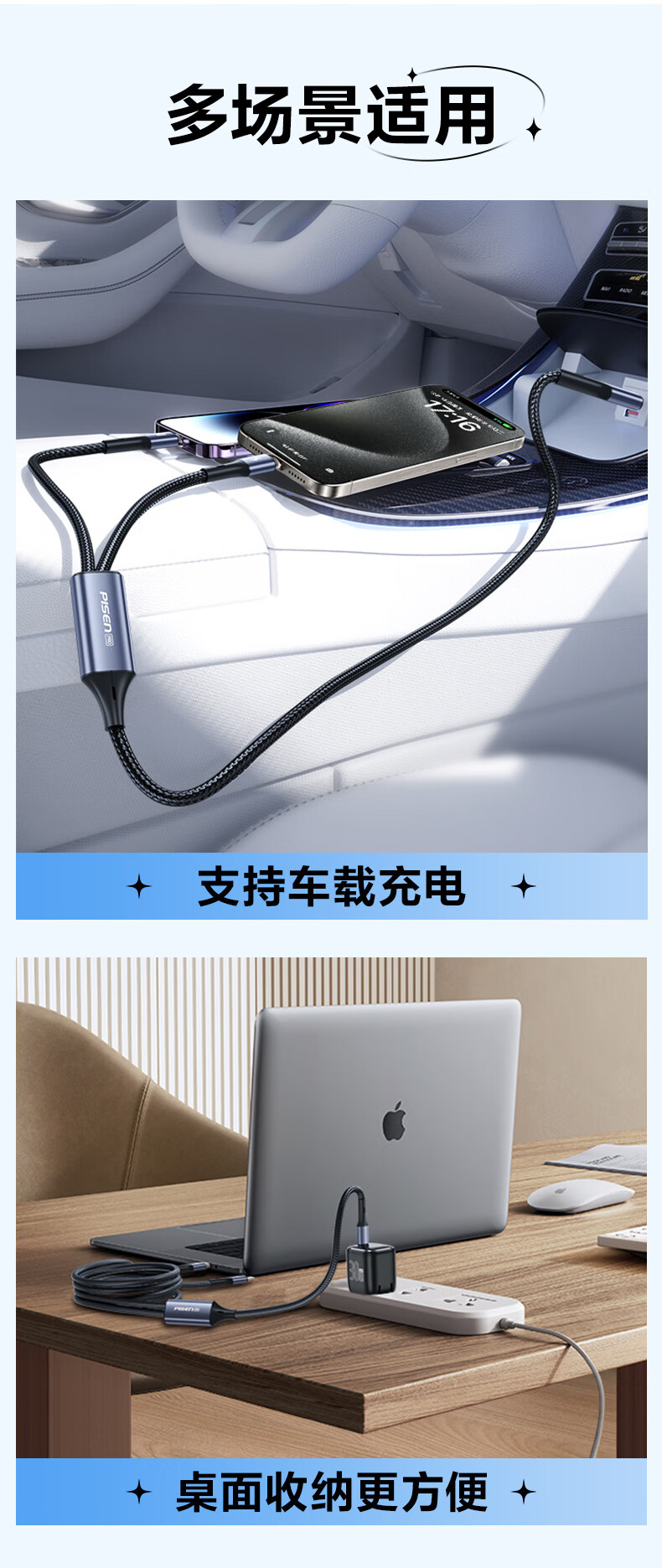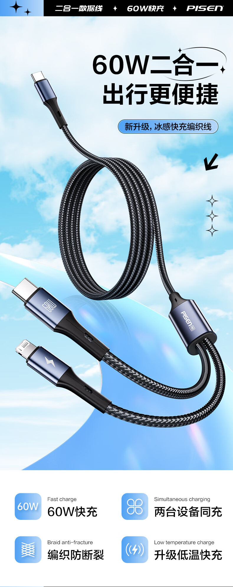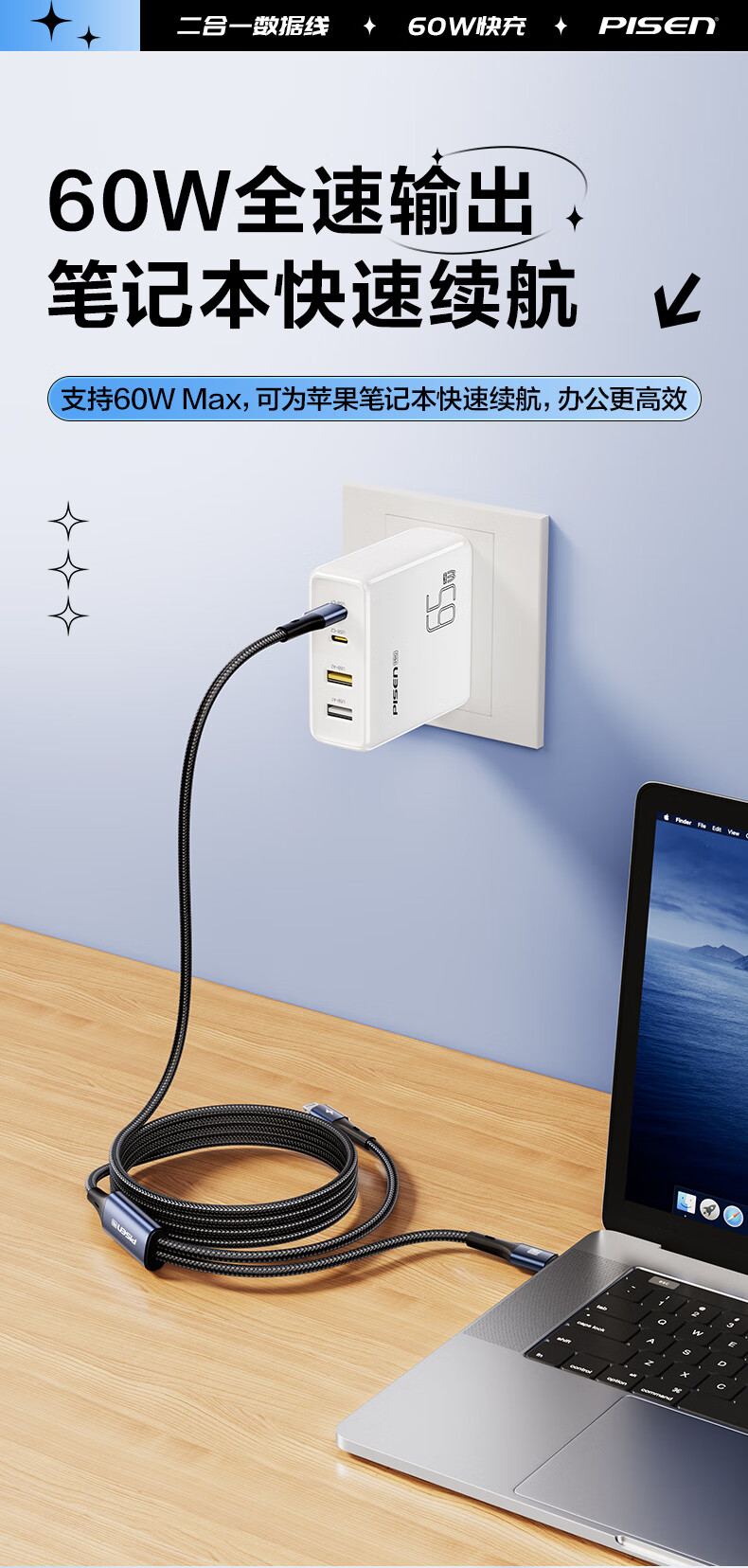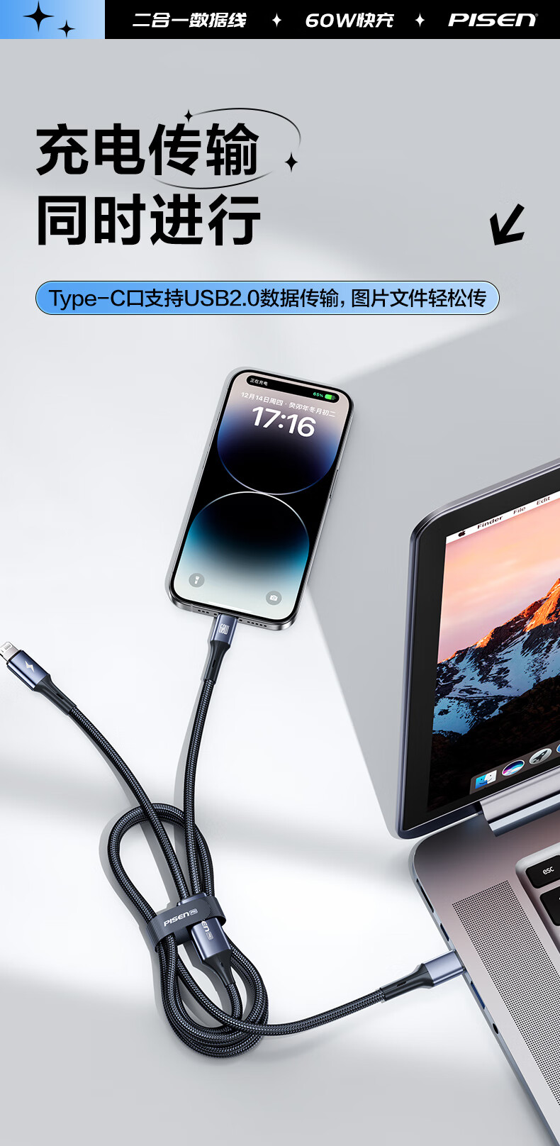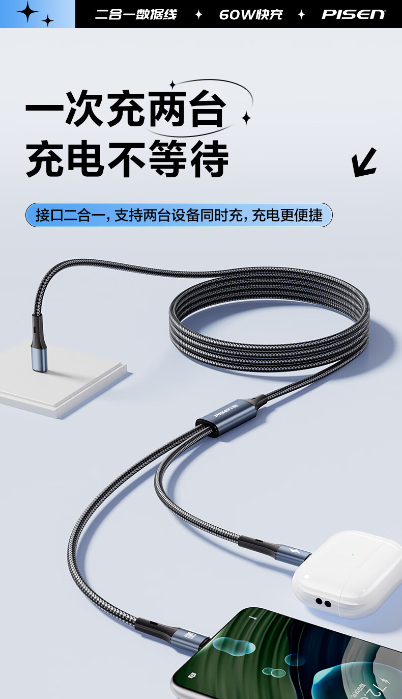 品胜苹果17充电线双Type-C数据线二合一PD60W一拖二车载适用iPhone16/15/14手机华为p70小米笔记本ipad