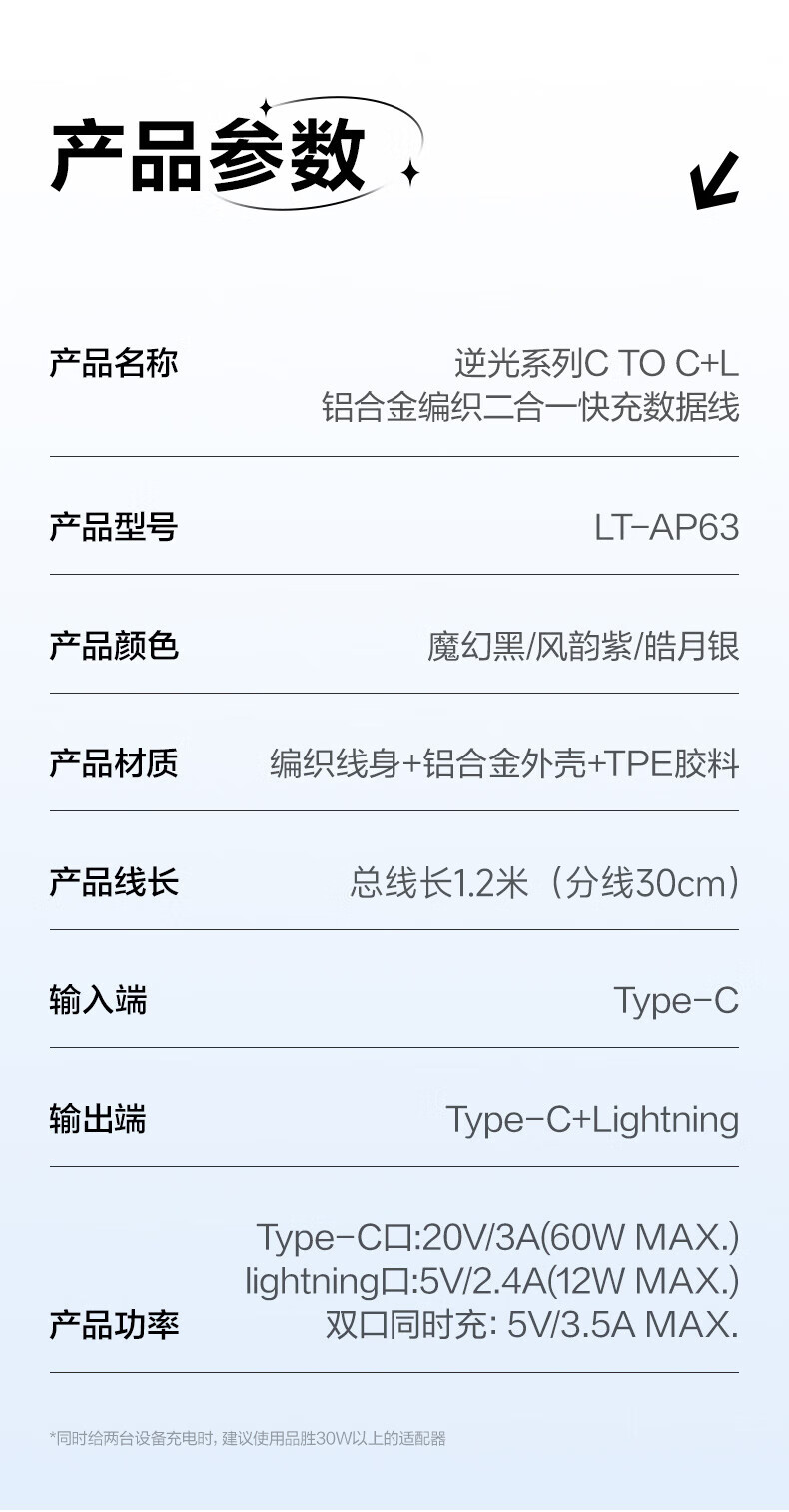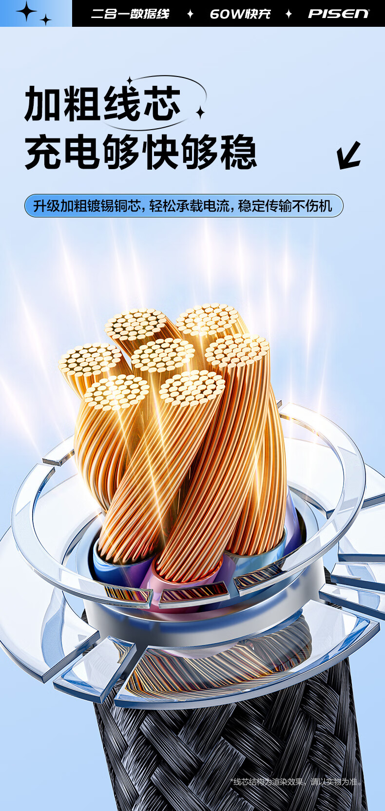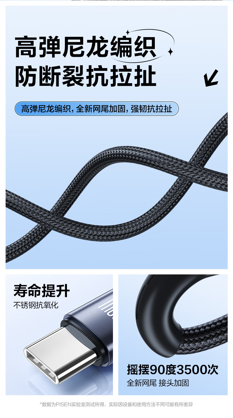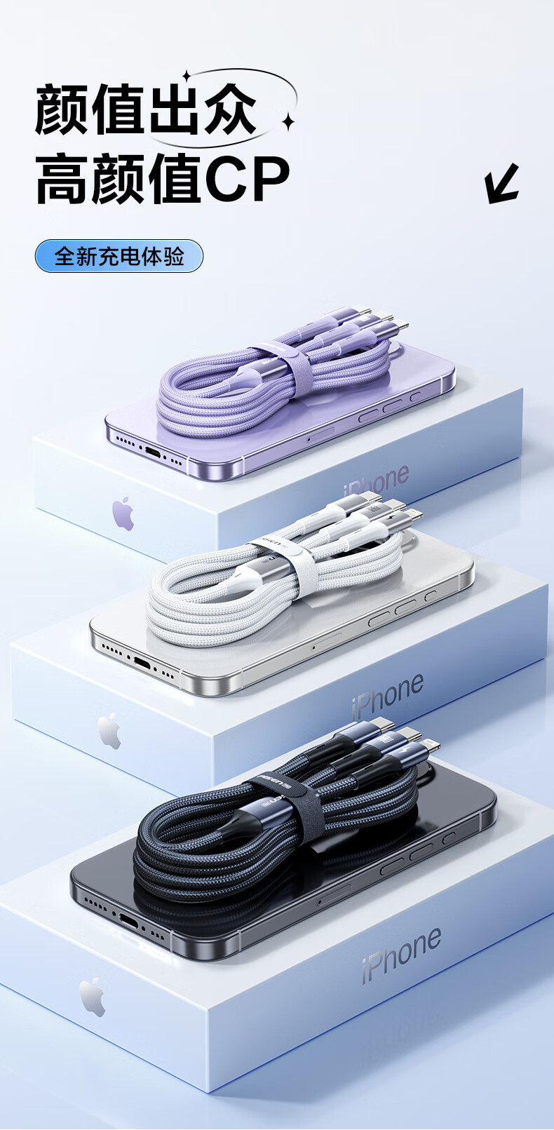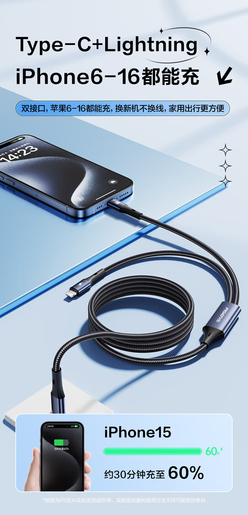 品胜苹果17充电线双Type-C数据线二合一PD60W一拖二车载适用iPhone16/15/14手机华为p70小米笔记本ipad