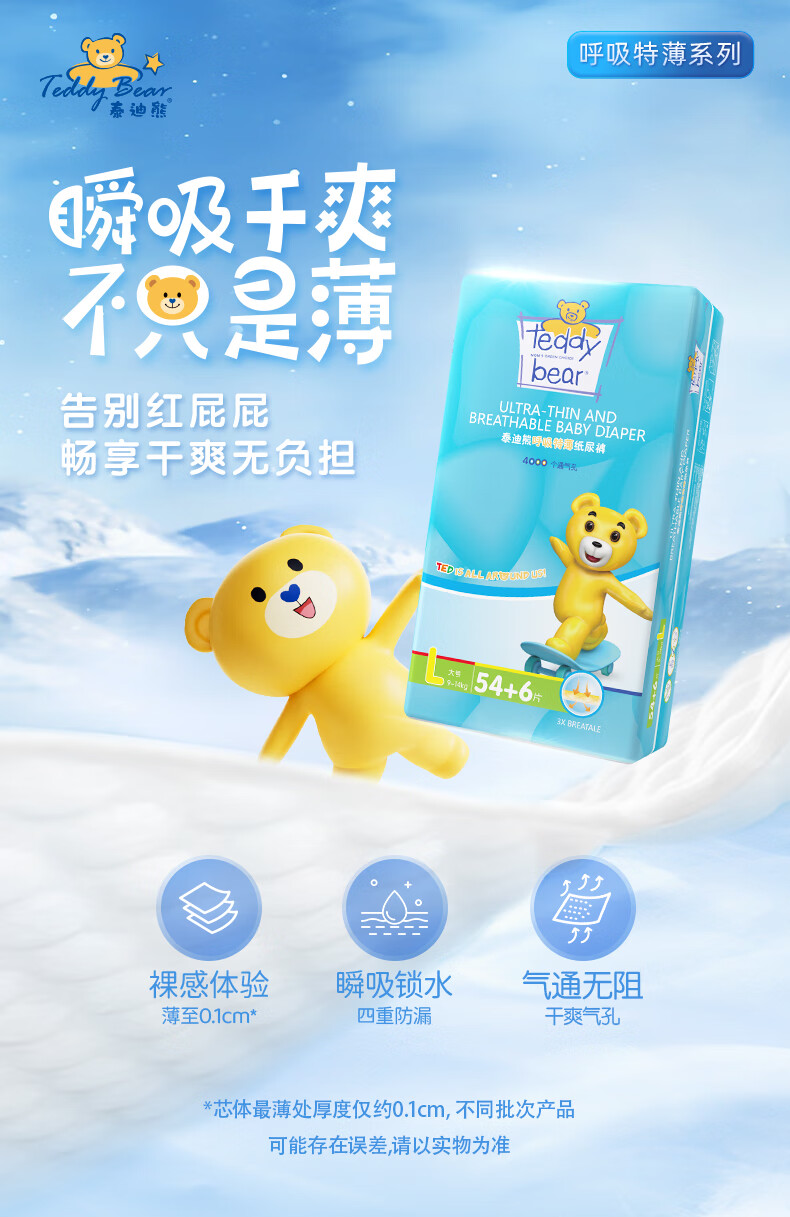 泰迪熊(Teddy Bear)呼吸特薄纸尿裤超薄透气干爽婴儿宝宝尿不湿尿裤 XL50片*2包 推荐23~32斤