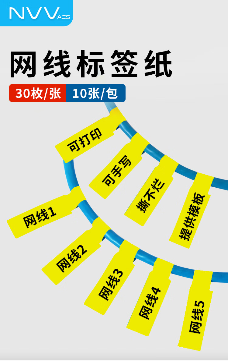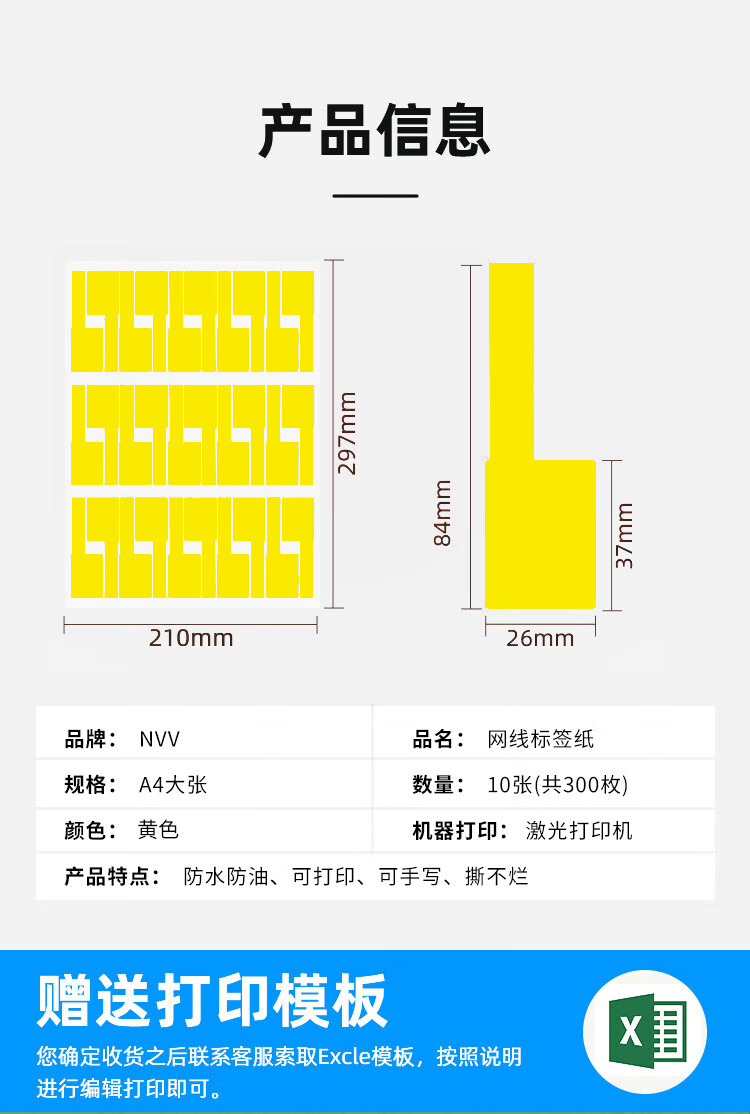 NVV 网线标签贴纸 A4网络布线不干胶充电线贴纸 通信机房线缆标签打印纸 P型分类贴打印BQ-P10黄300枚