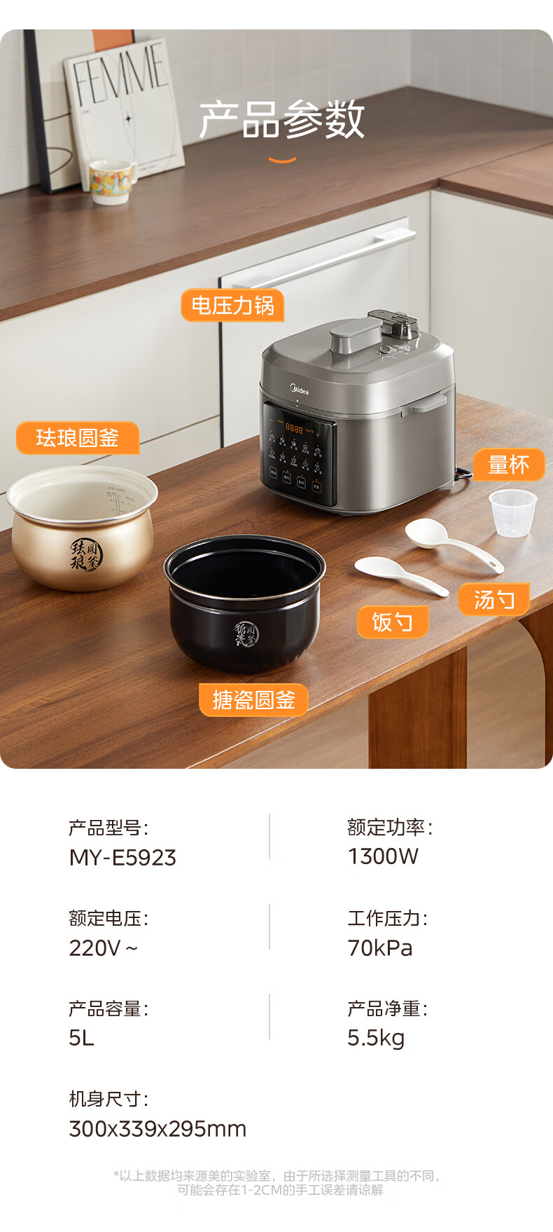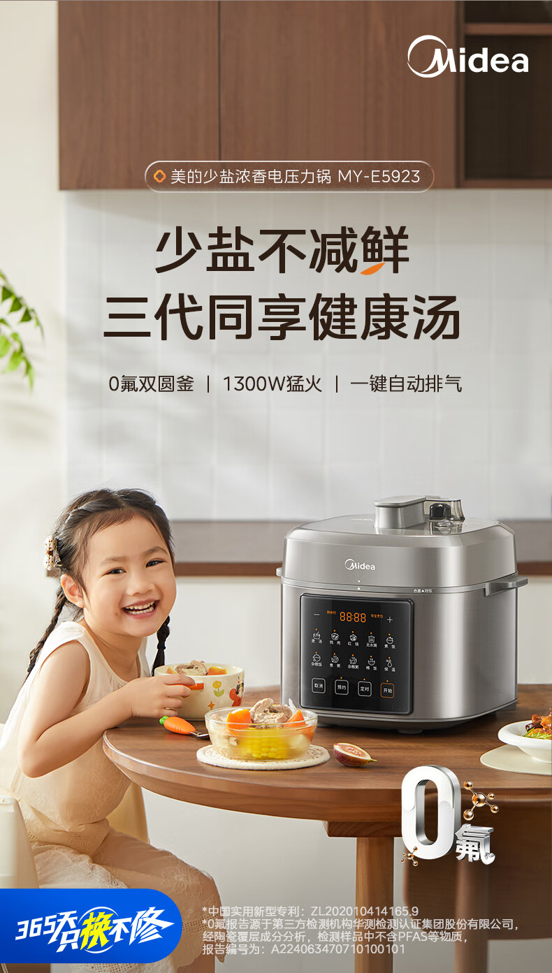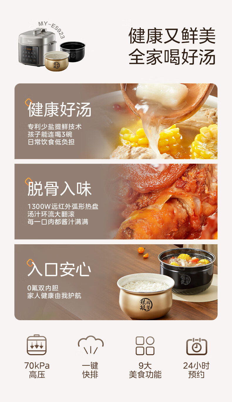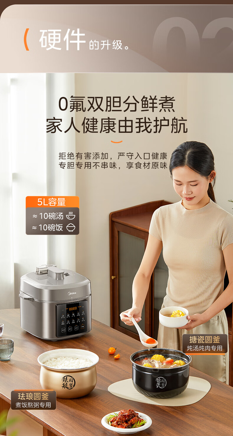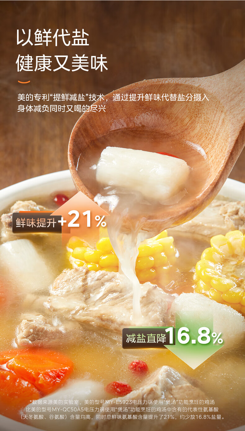 美的(Midea)电压力锅少盐浓香系列0氟内胆电高压锅电压锅双胆 电饭煲稳定控压技术高压汤锅电炖锅电饭锅 【0氟浓香】少盐提鲜 5L 【新上市】E5923