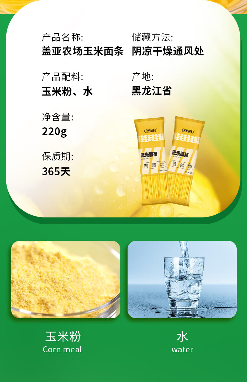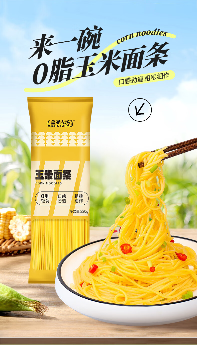 盖亚农场东北玉米面条220g 挂面粗粮低脂肪 杂粮面速食爽滑面条 玉米面条 220g*6袋 【2026年3月31日到期 介意慎拍!】