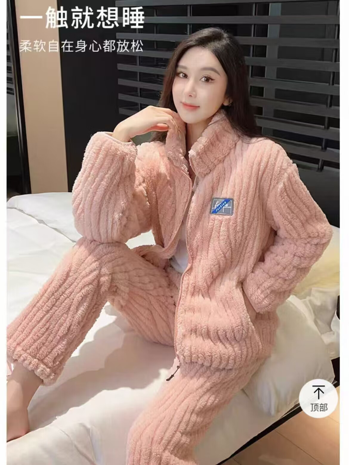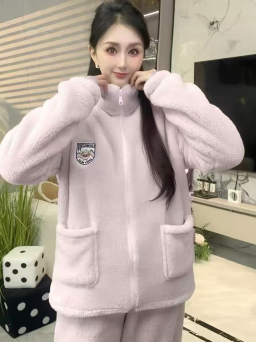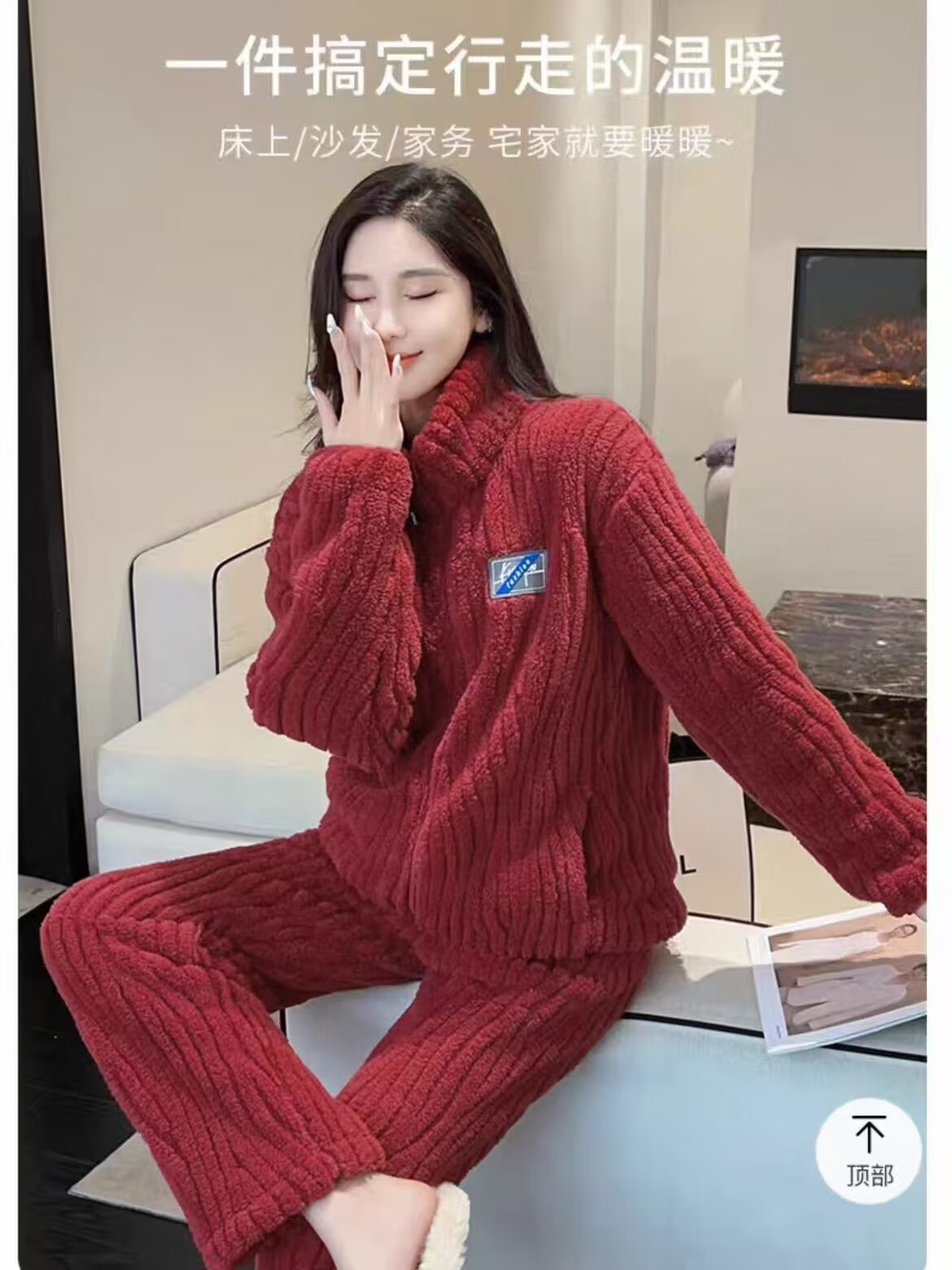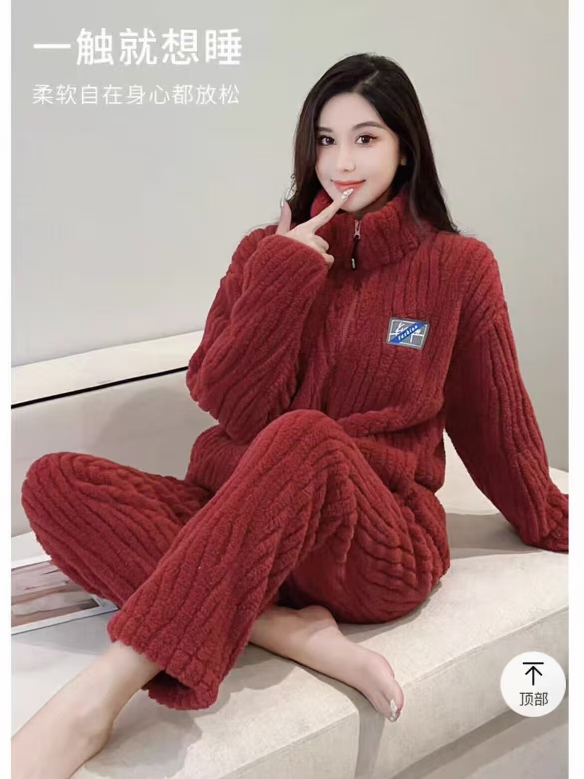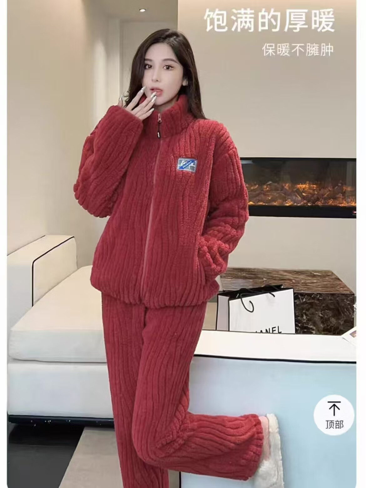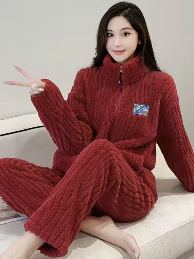 秋冬立领女睡衣拉链加绒加厚舒适柔软珊瑚绒休闲可外穿家居服套装 大红色(CR2035小方标) L (110-130)