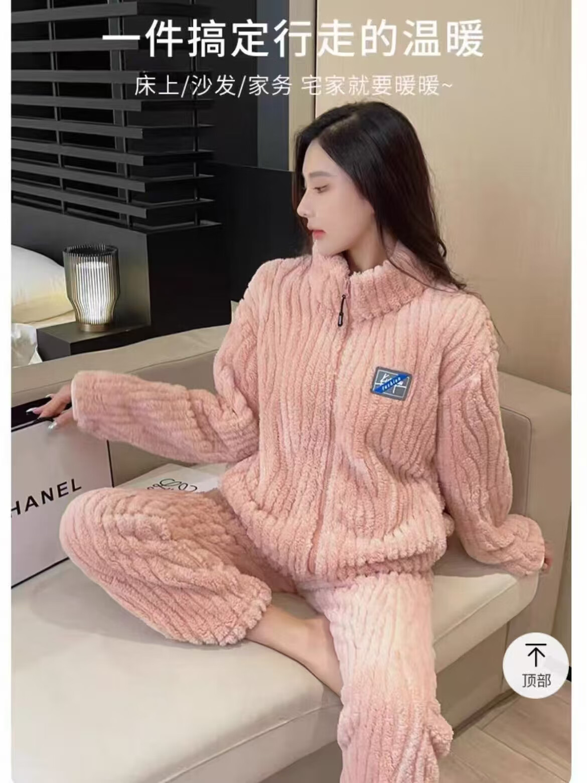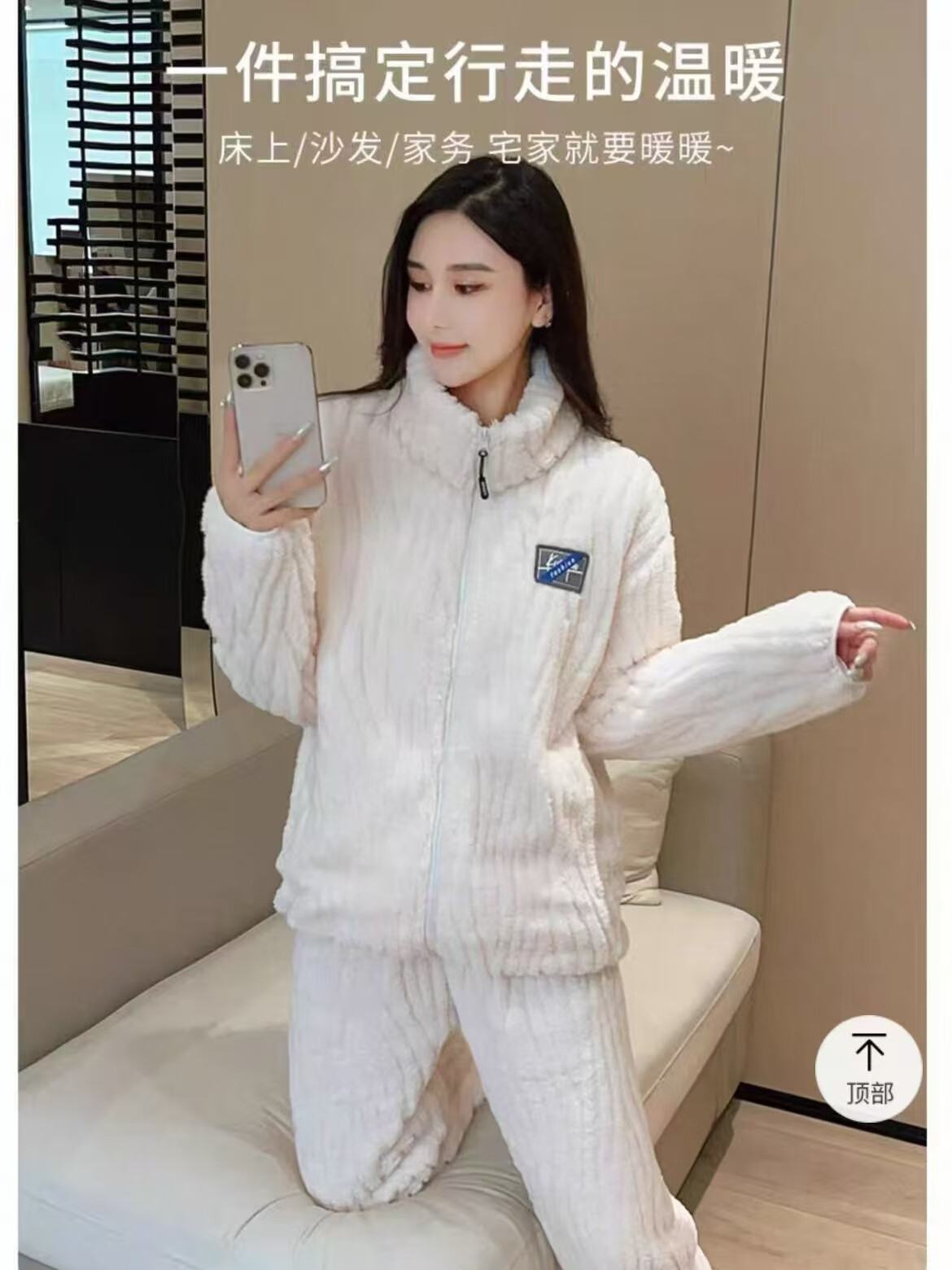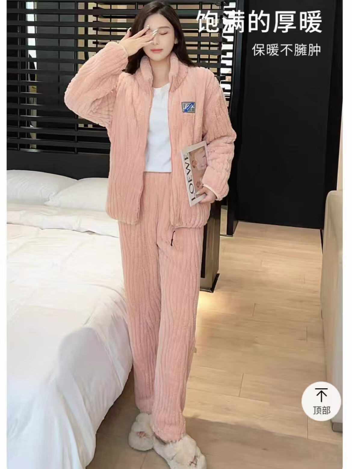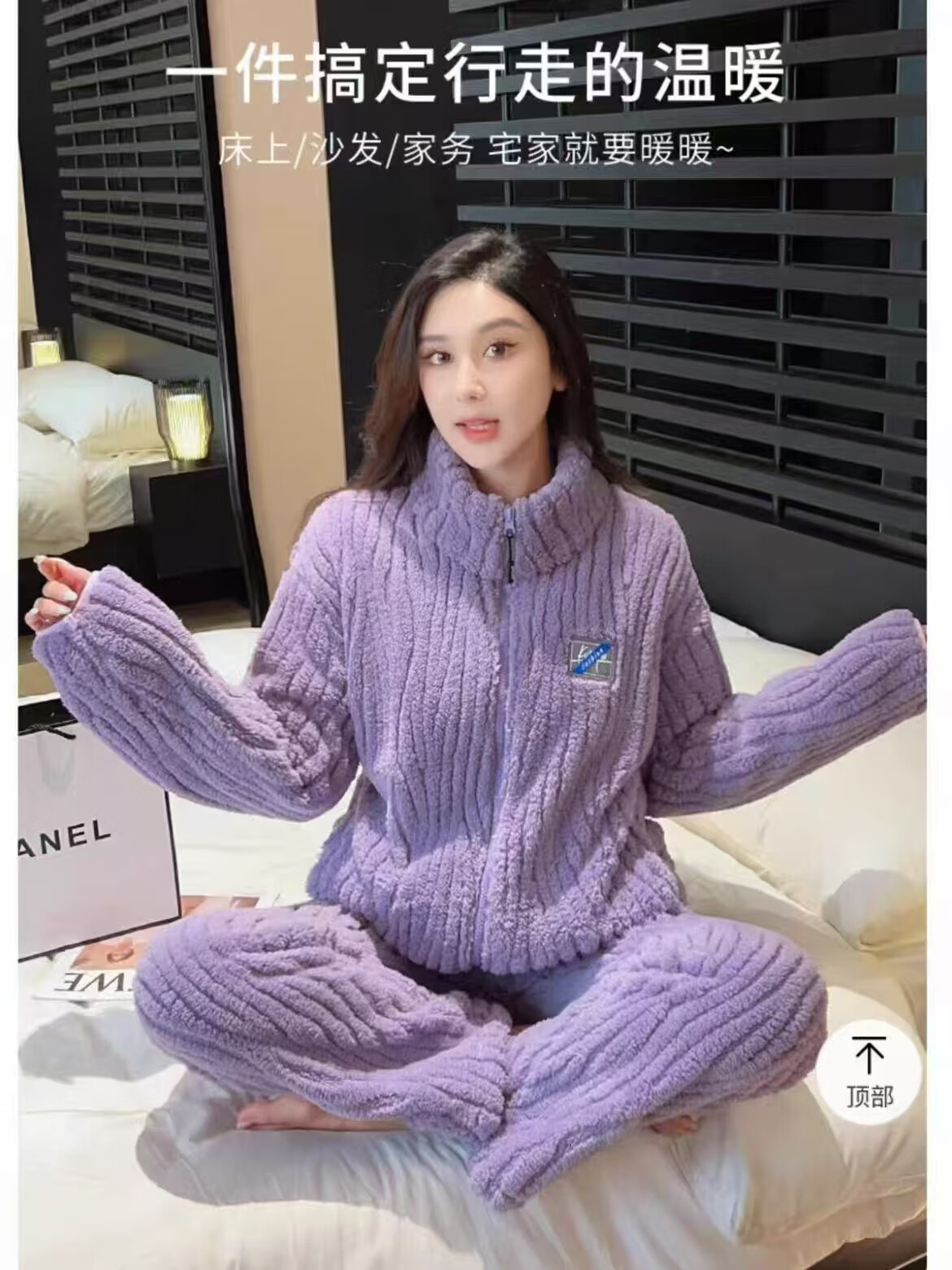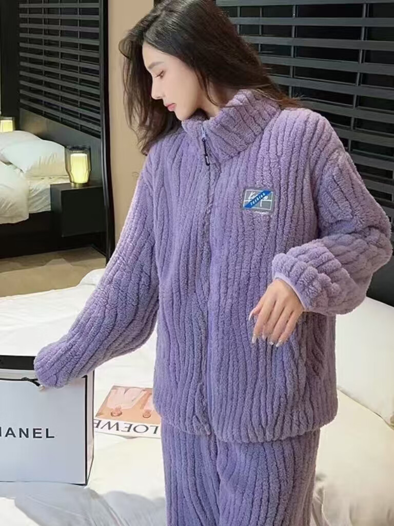 秋冬立领女睡衣拉链加绒加厚舒适柔软珊瑚绒休闲可外穿家居服套装 大红色(CR2035小方标) L (110-130)