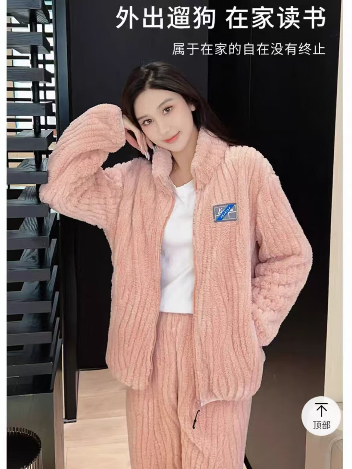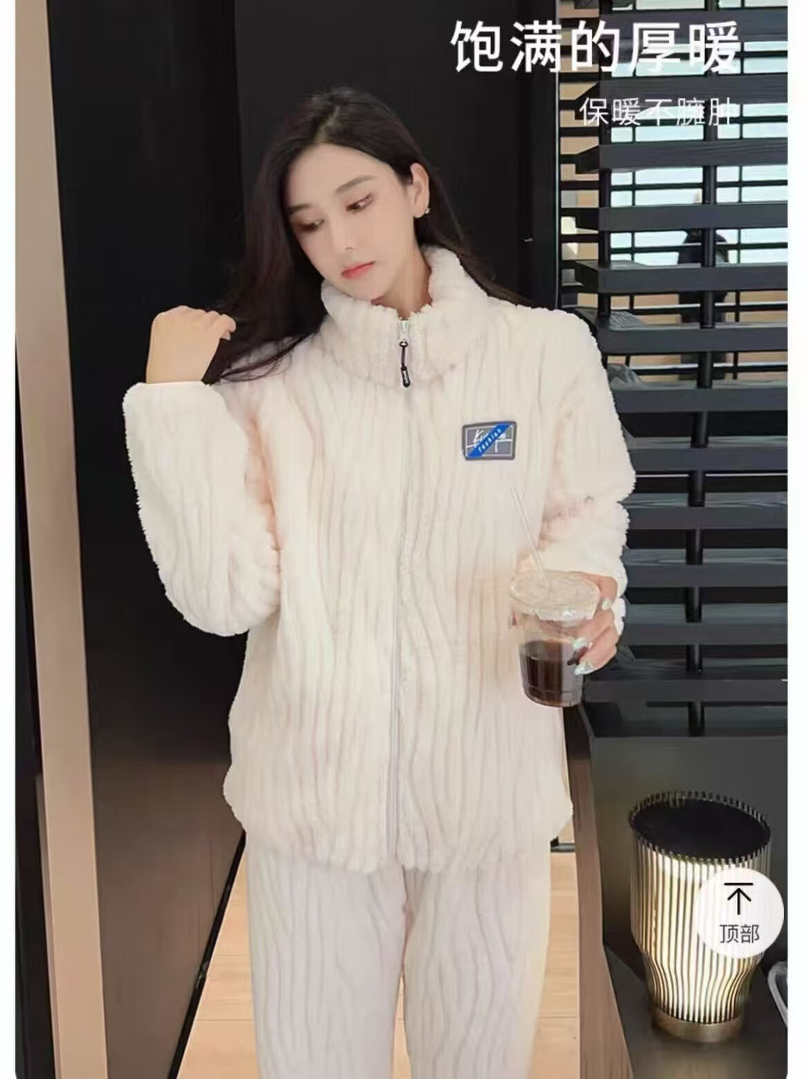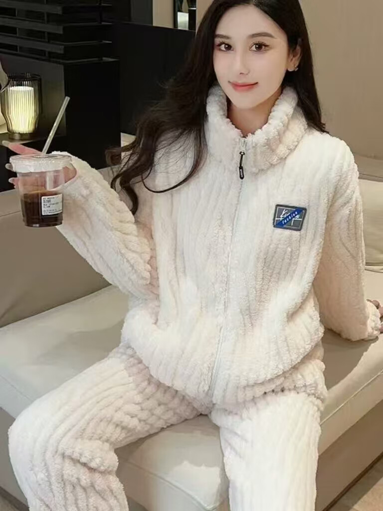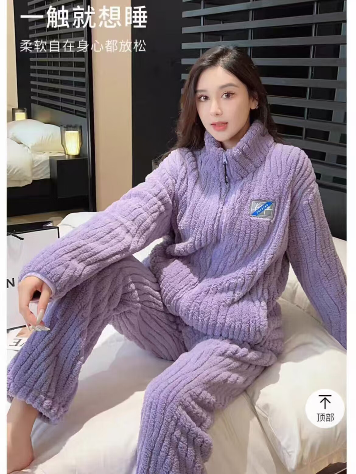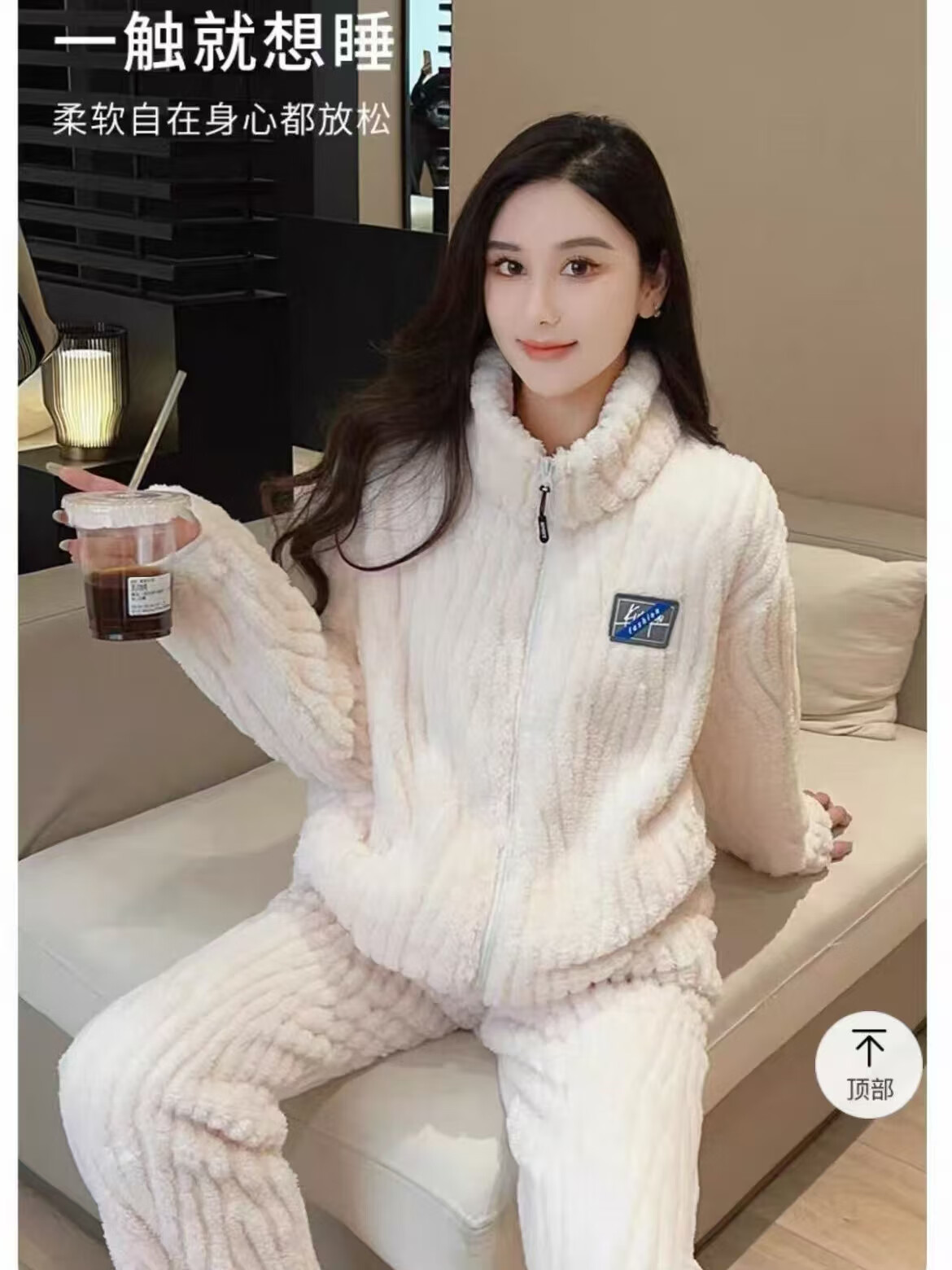 秋冬立领女睡衣拉链加绒加厚舒适柔软珊瑚绒休闲可外穿家居服套装 大红色(CR2035小方标) L (110-130)