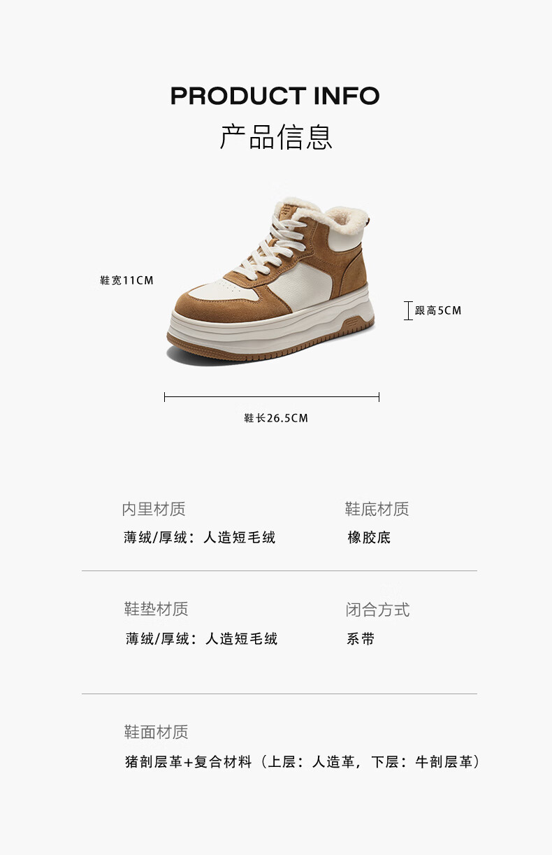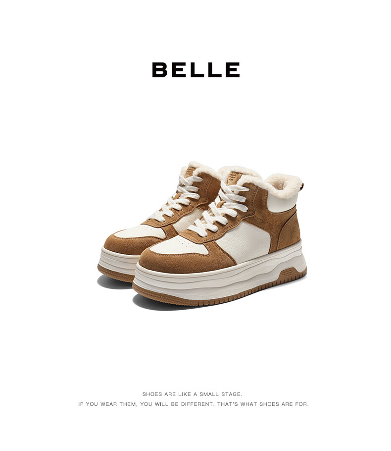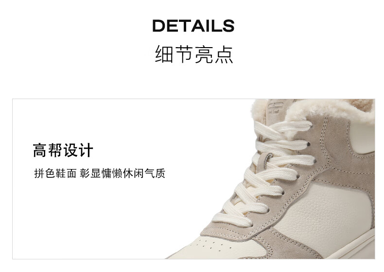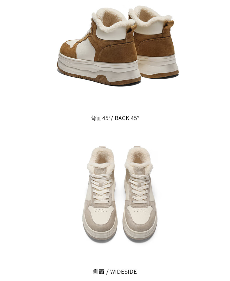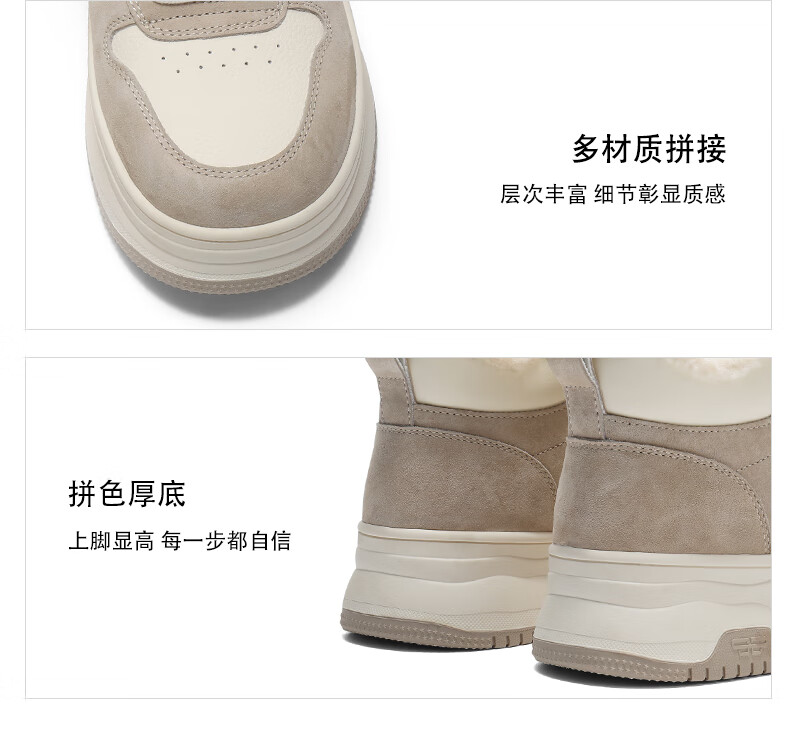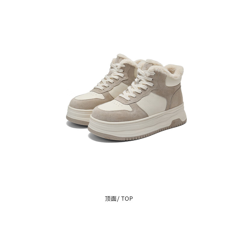 百丽(Belle)撞色高帮鞋女2025冬新商场同款厚底增高加绒休闲板鞋E6T1DDD5 米色/灰-厚绒 36 (230mm)