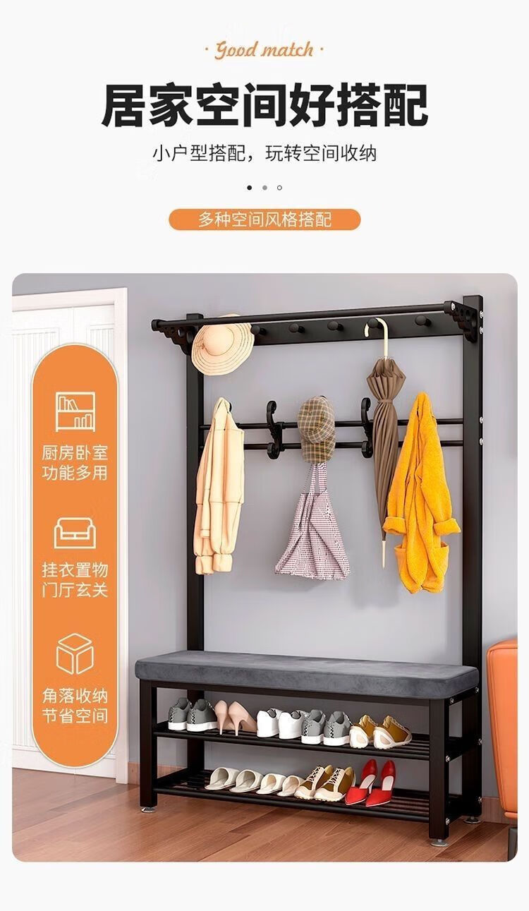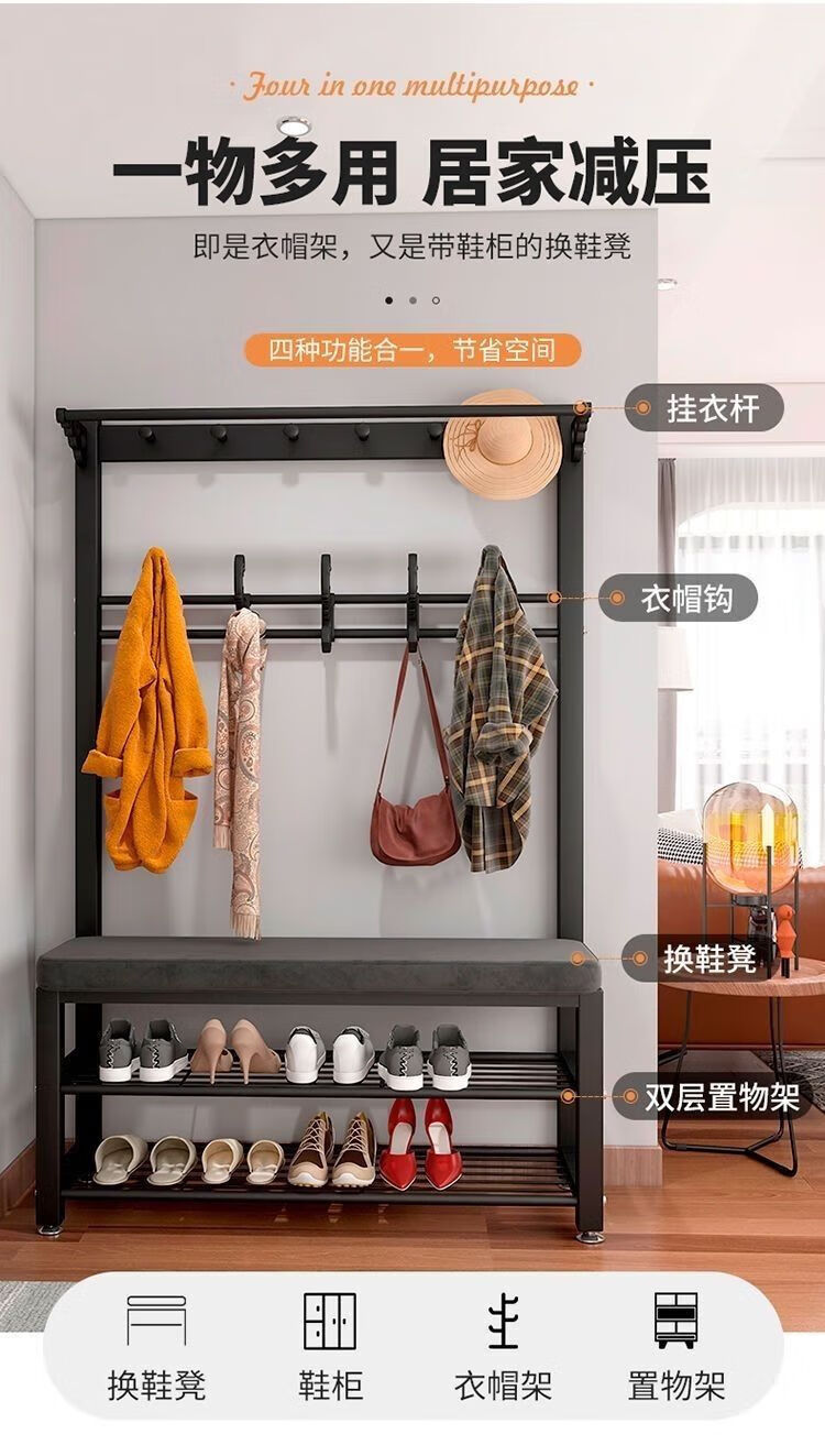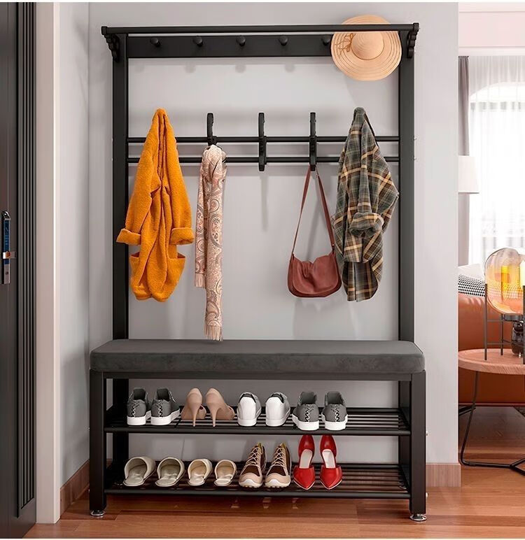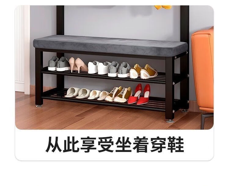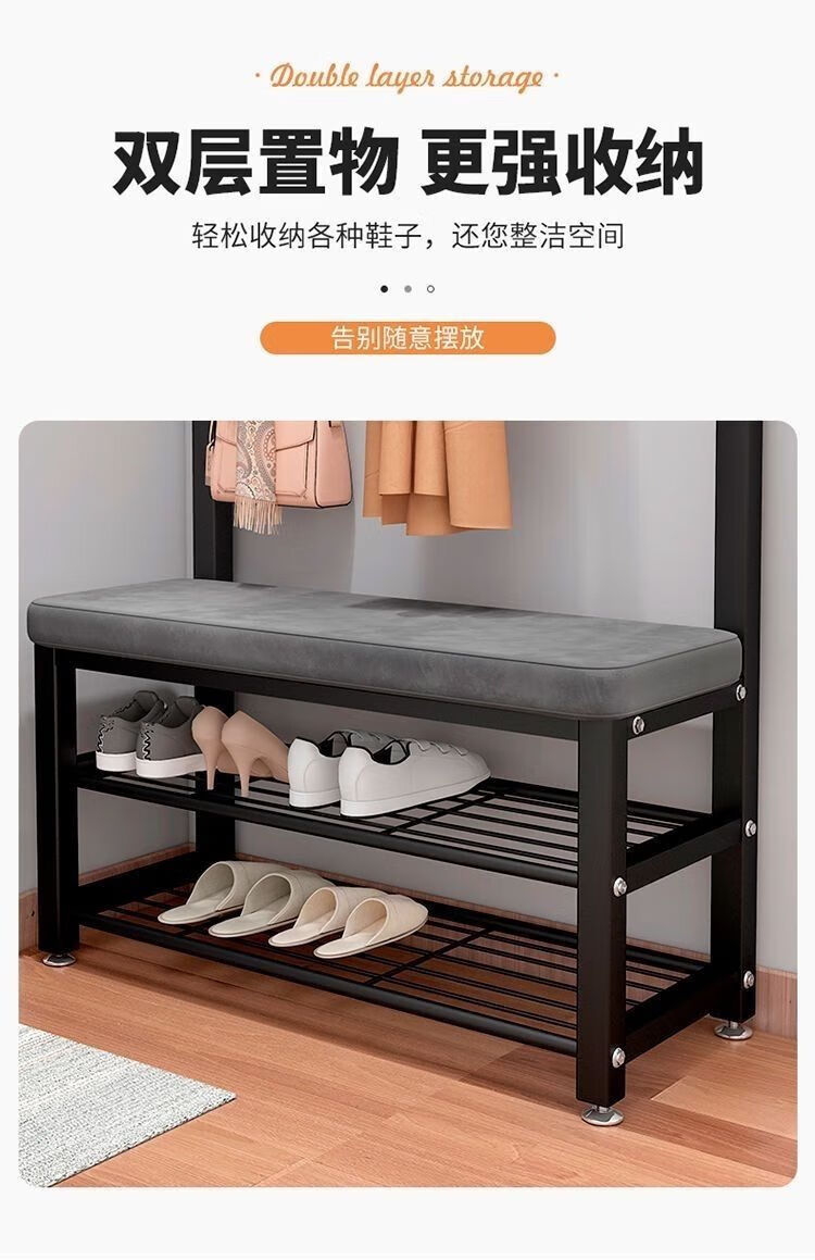 倘然之家换鞋凳家用简易多功能衣帽架玄关置物架衣架落地立式门口可坐鞋凳 黑灰绒布-50cm【鞋凳+无衣帽架】
