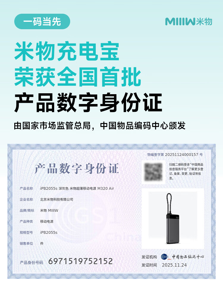 MIIIW米物【3C认证可上飞机】20000mAh 55W/40W快充自带线充电宝 适用于华为荣耀苹果17系列 M320Air 灰