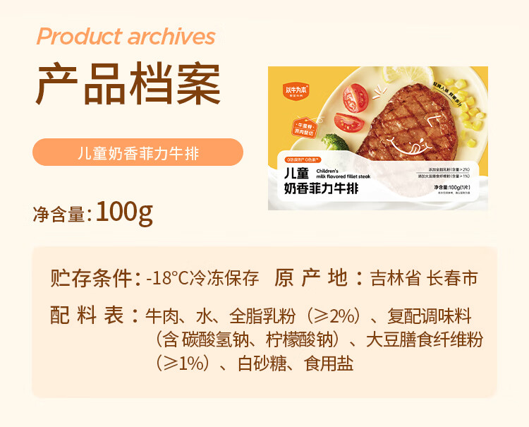 以牛为本认养一头牛 儿童菲力牛排奶香100g*5袋 原肉整切牛肉排 儿童辅食