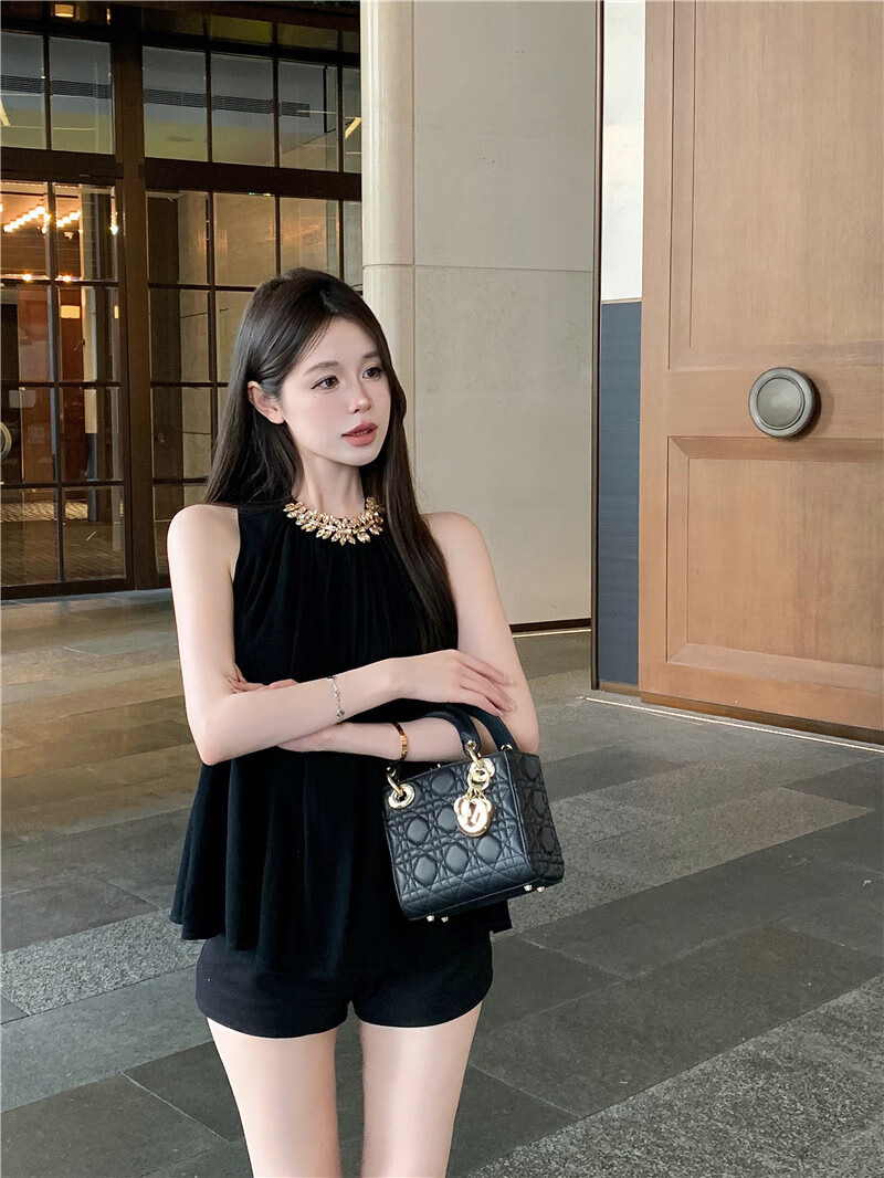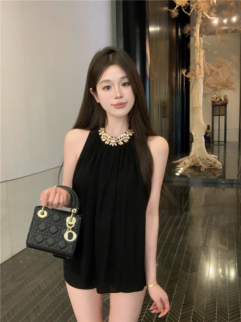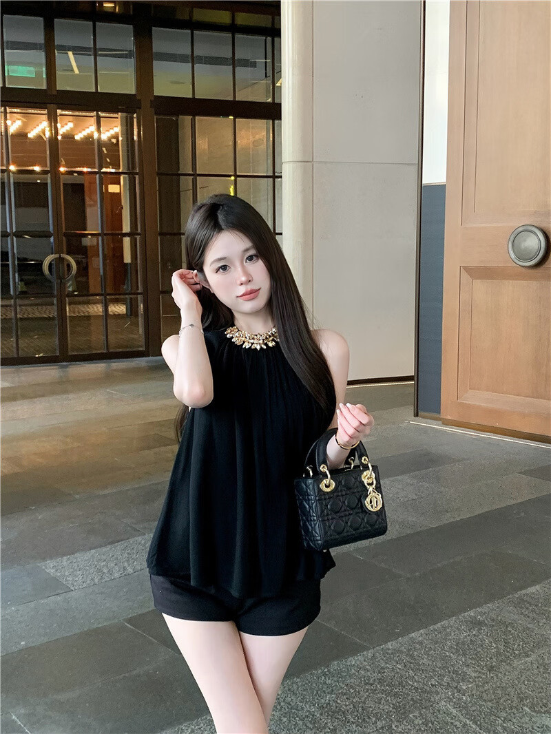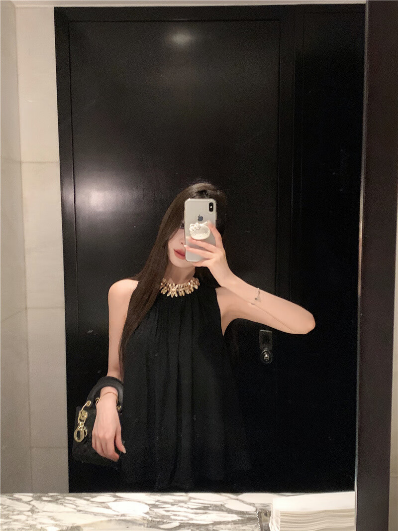 【现货现发】黑色挂脖无袖雪纺衫女夏季新款重工钻链宽松显瘦小衫 黑色雪纺衫 M