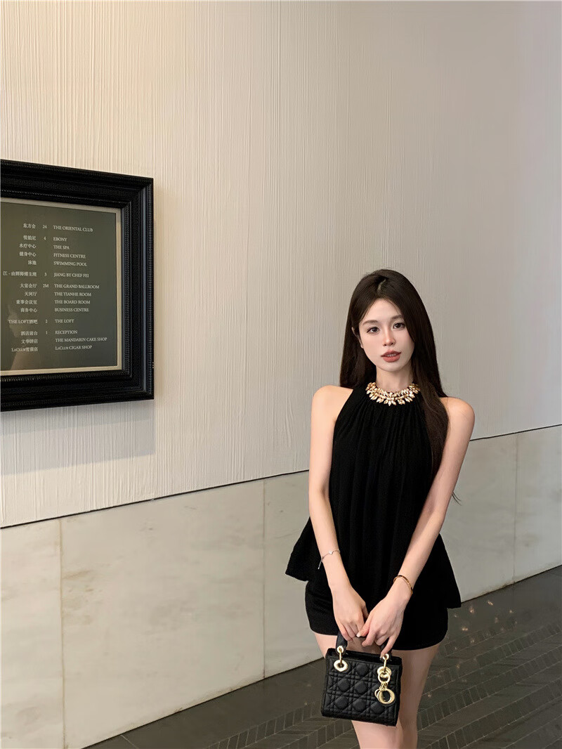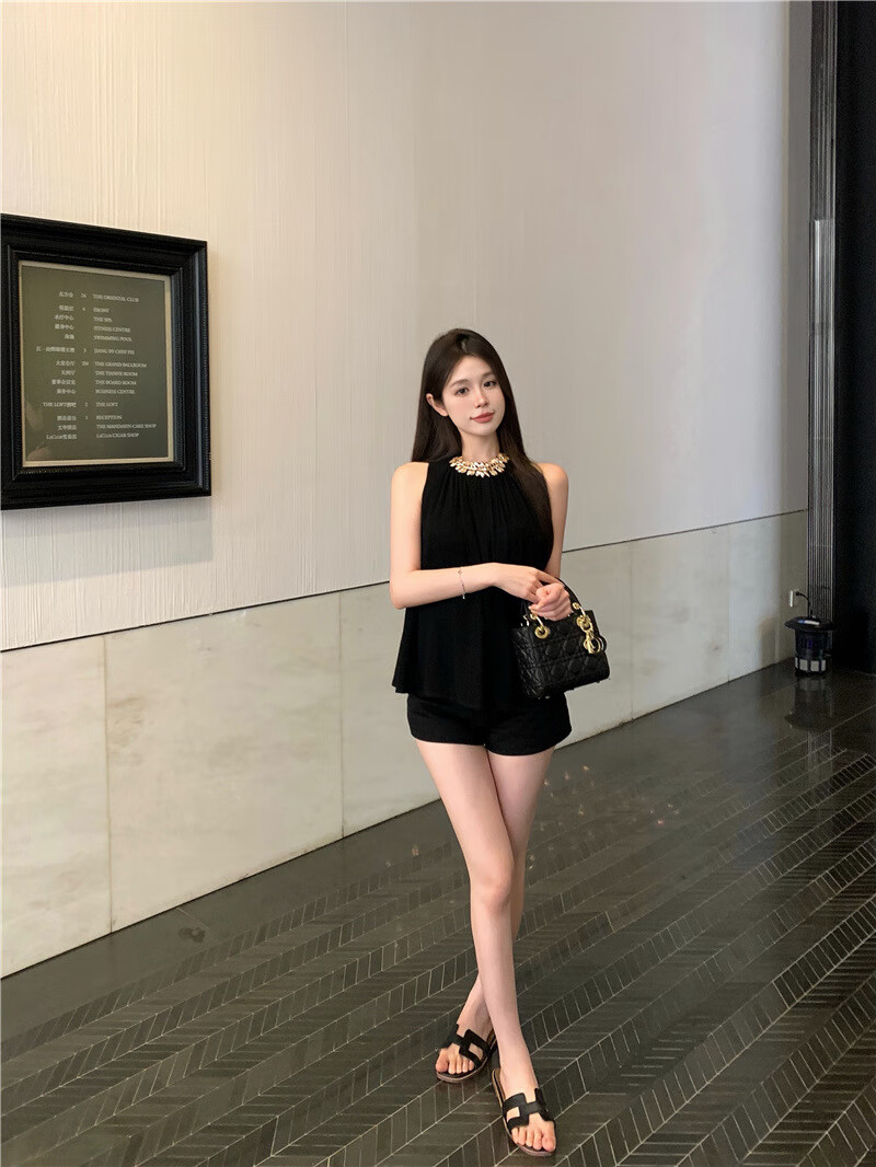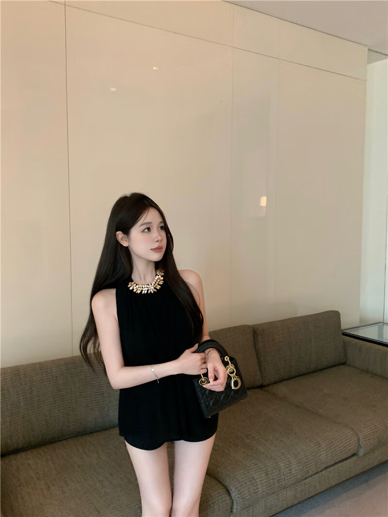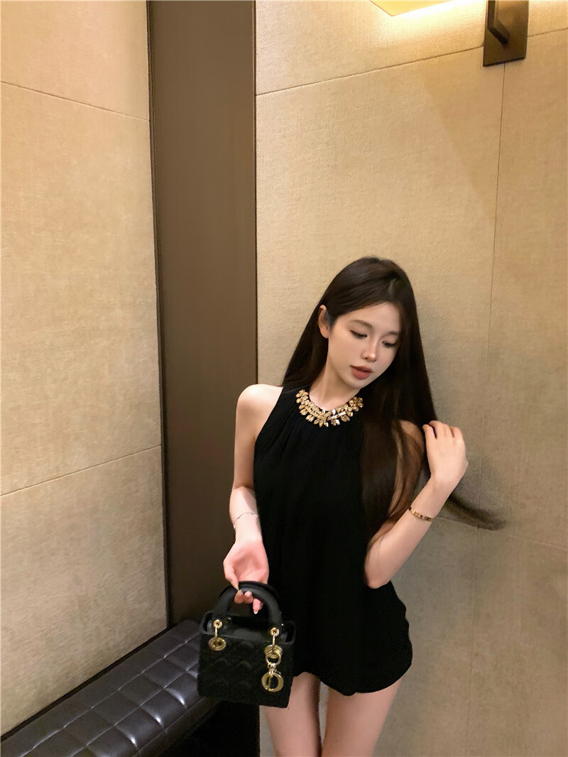 【现货现发】黑色挂脖无袖雪纺衫女夏季新款重工钻链宽松显瘦小衫 黑色雪纺衫 M