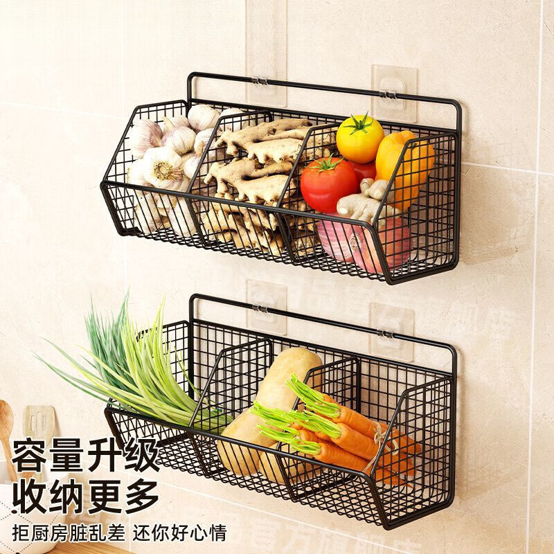花沐禧葱姜蒜置物架挂墙上多功能厨房免打孔收纳盒壁挂式菜篮子 钛黑单格