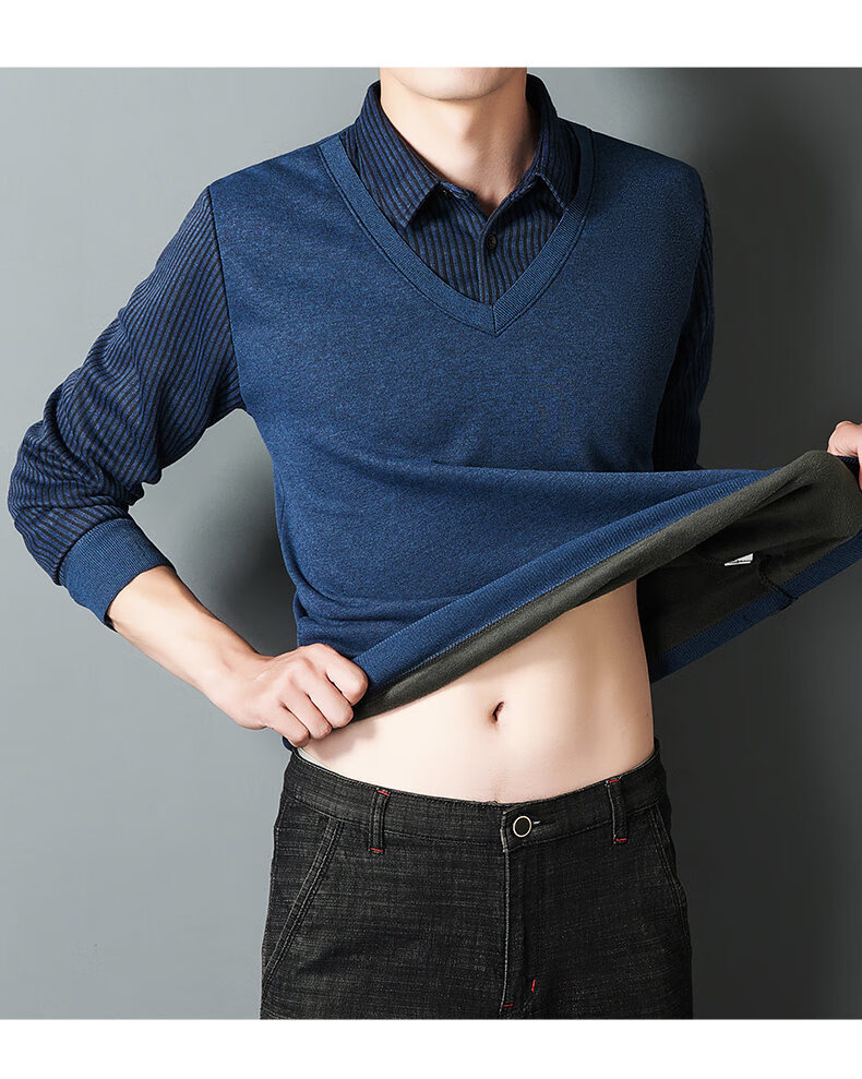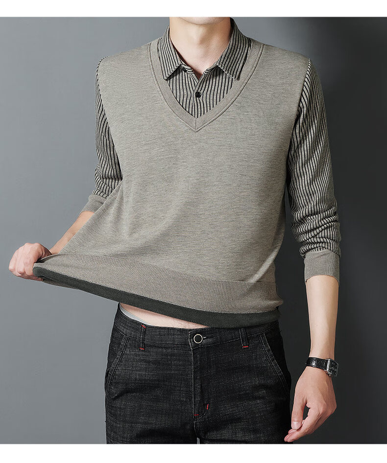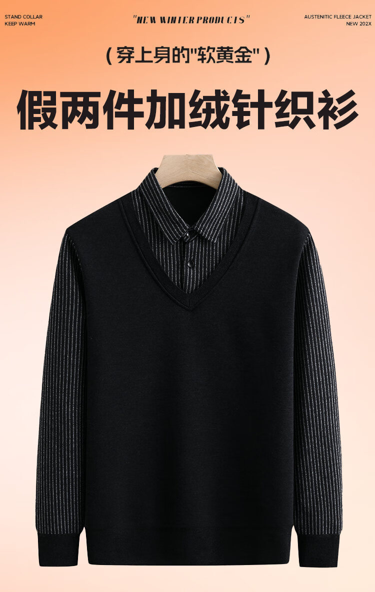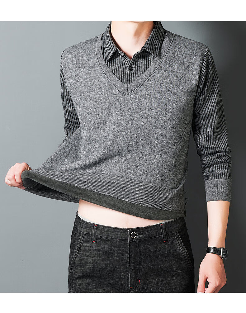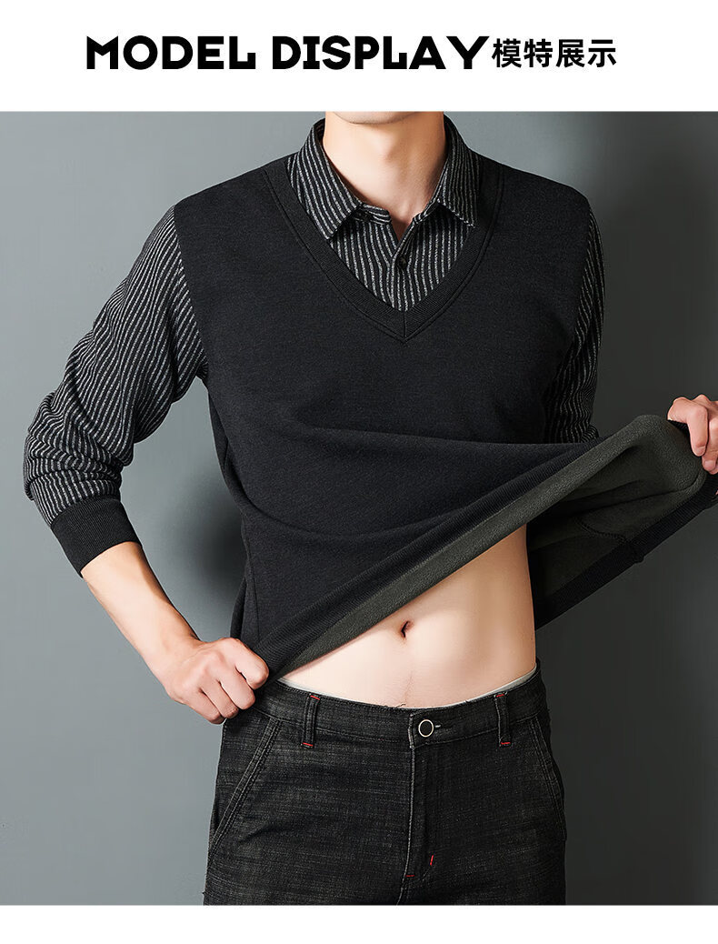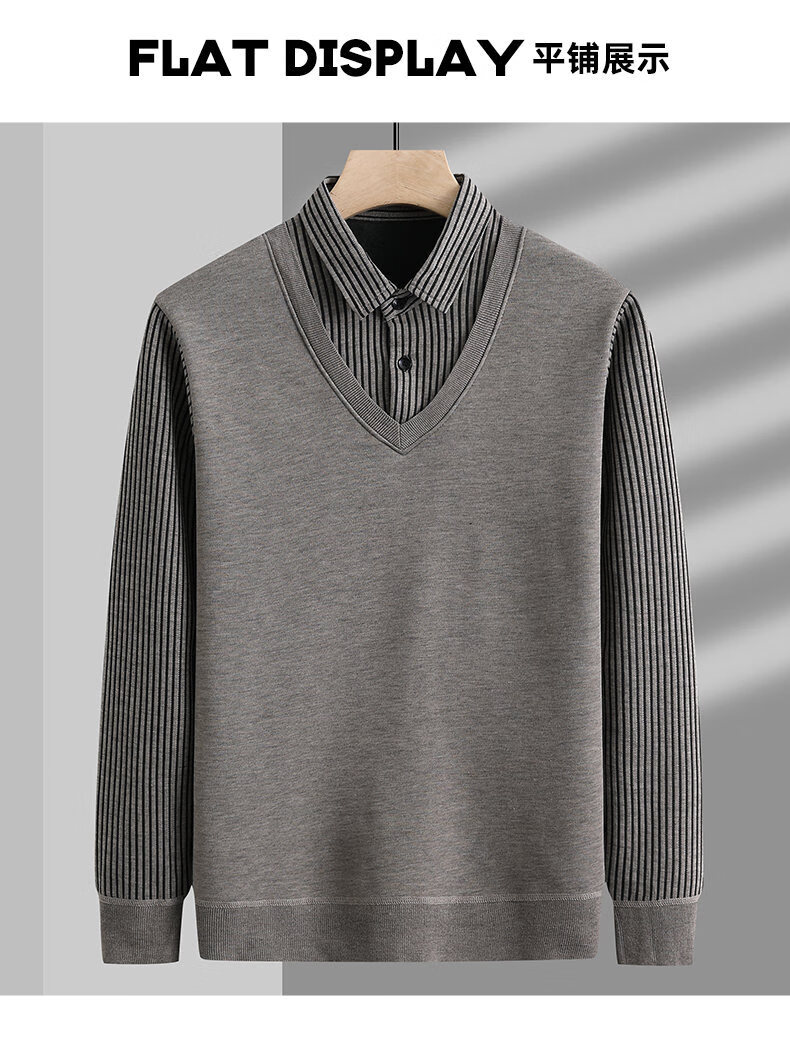 CronetKcnsy男士假两件毛衣男衬衫领针织衫男冬季加绒加厚线衣中老年衣服男装 深灰色 3XL 推荐165-180斤
