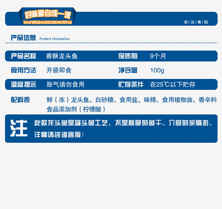 深生都安达香酥龙头鱼袋装即食海鲜休闲办公室零食龙头鱼干鱼仔舟山特产 香酥龙头鱼100g 酥软口感