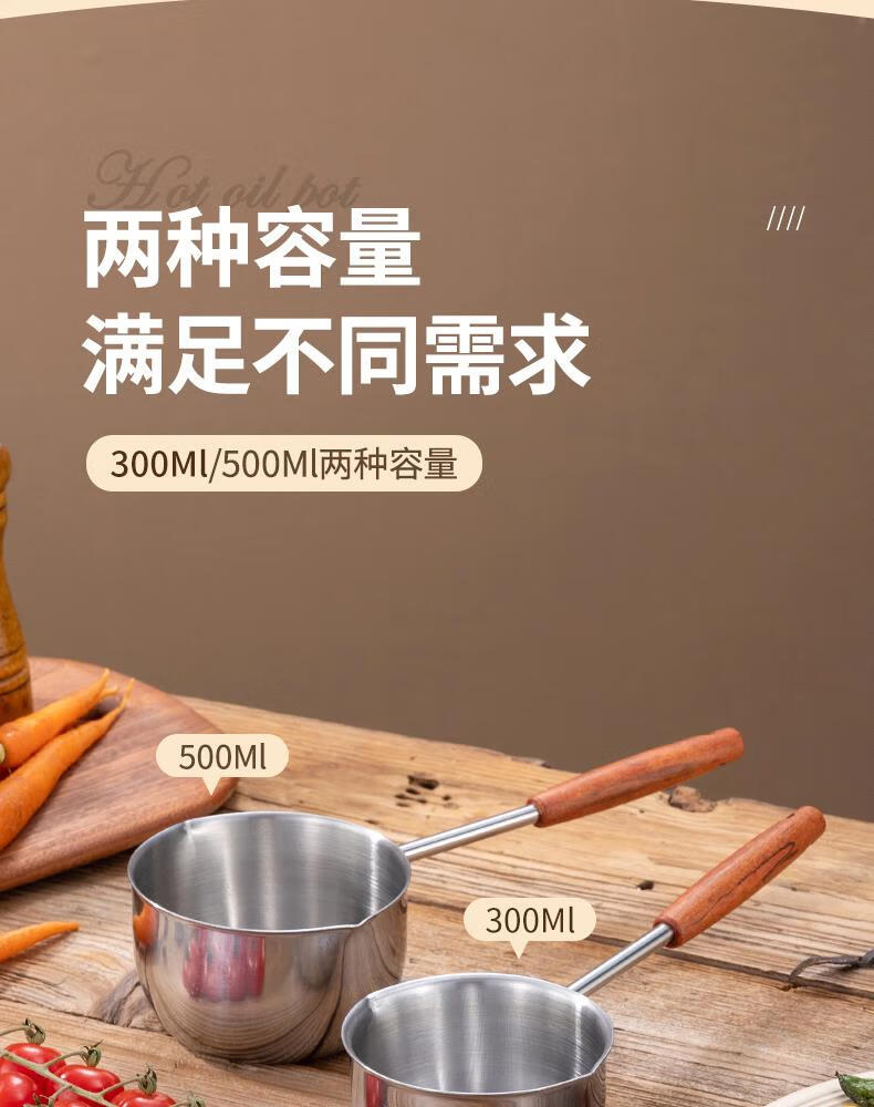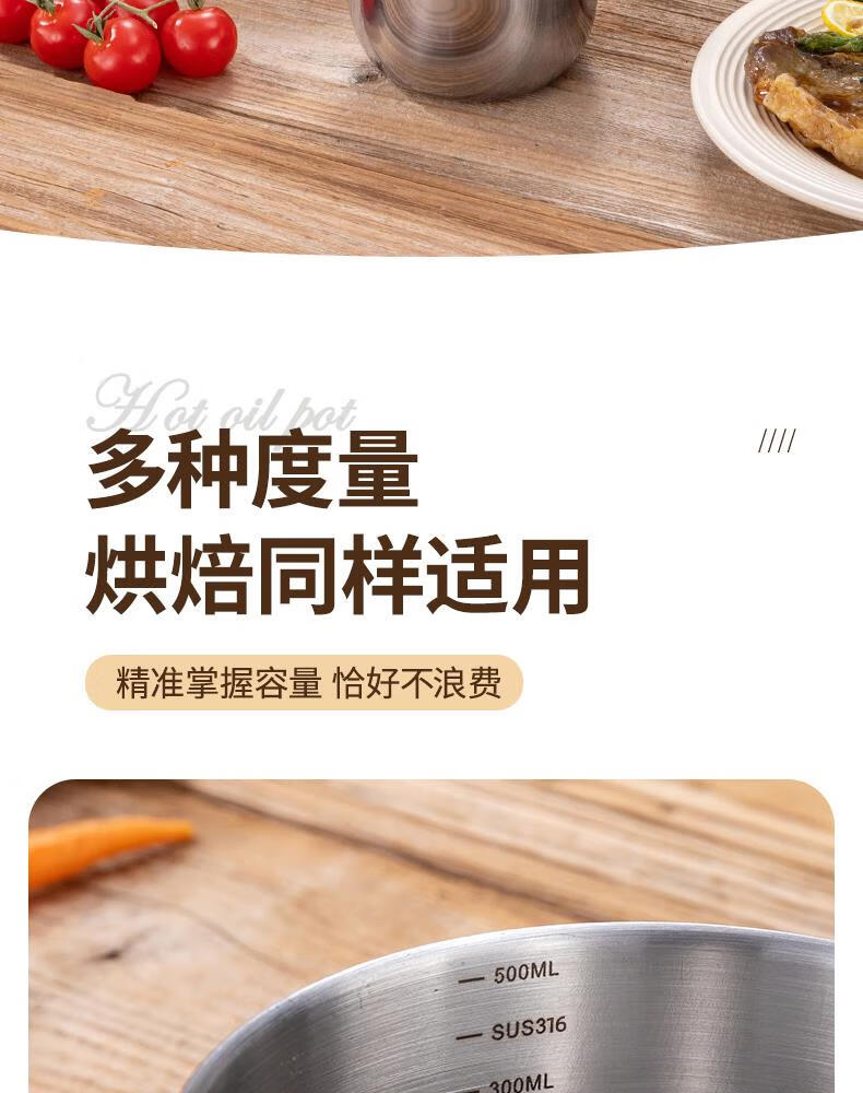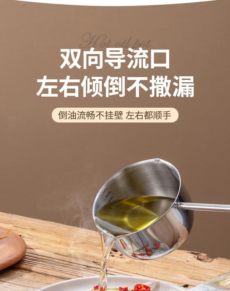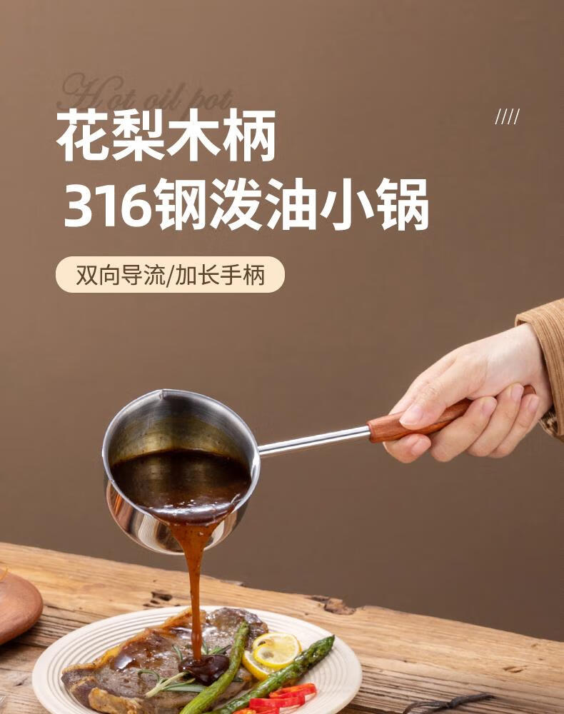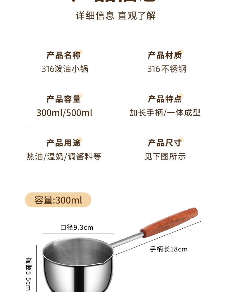 胖东来同款泼油锅316不锈钢加长柄热油专用神器厨房浇油烧油家用 316钢L带刻度梨花木柄 300cm