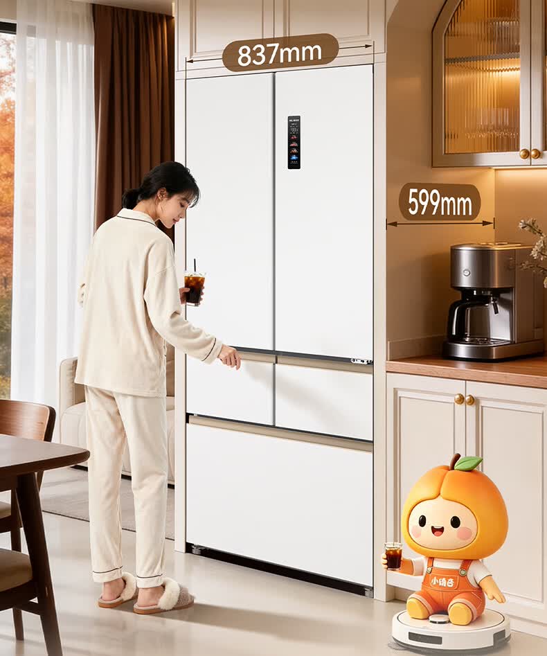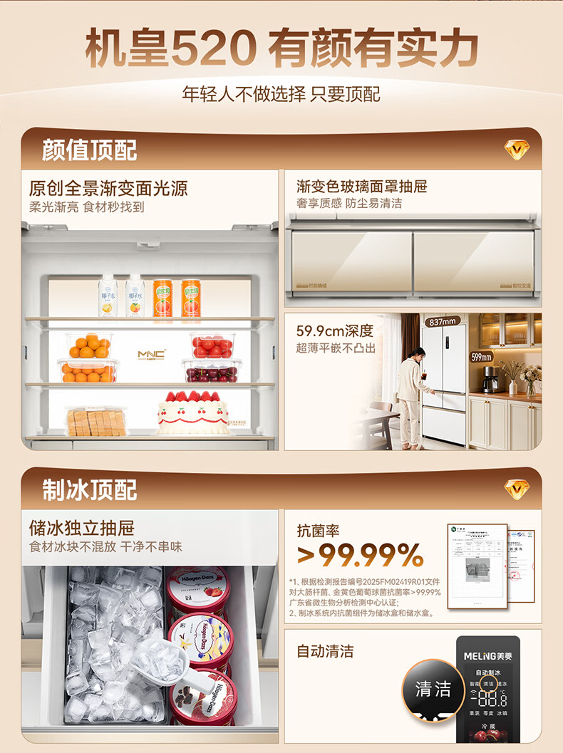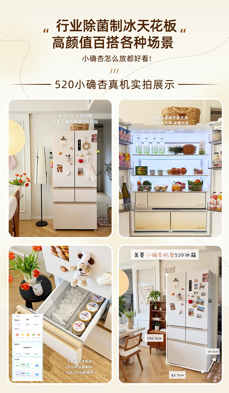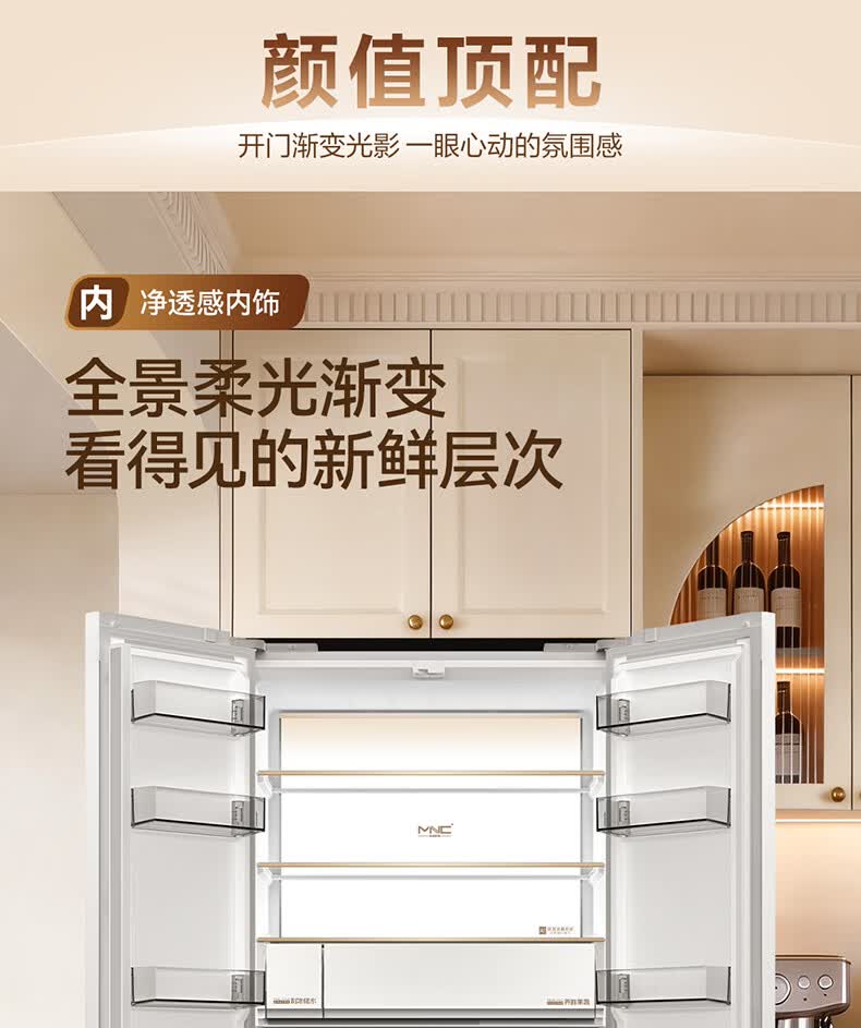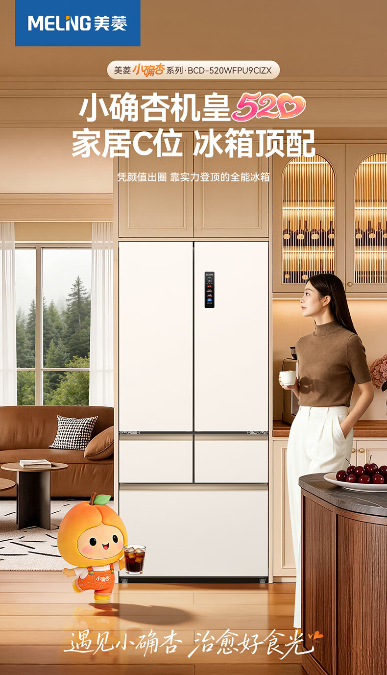 美菱小确杏520L法式多门冰箱双系统主动除菌自动制冰零平嵌入式一级能效风冷BCD-520WFPU9CIZX国家补贴 小确杏·机皇520