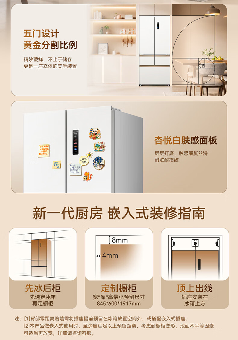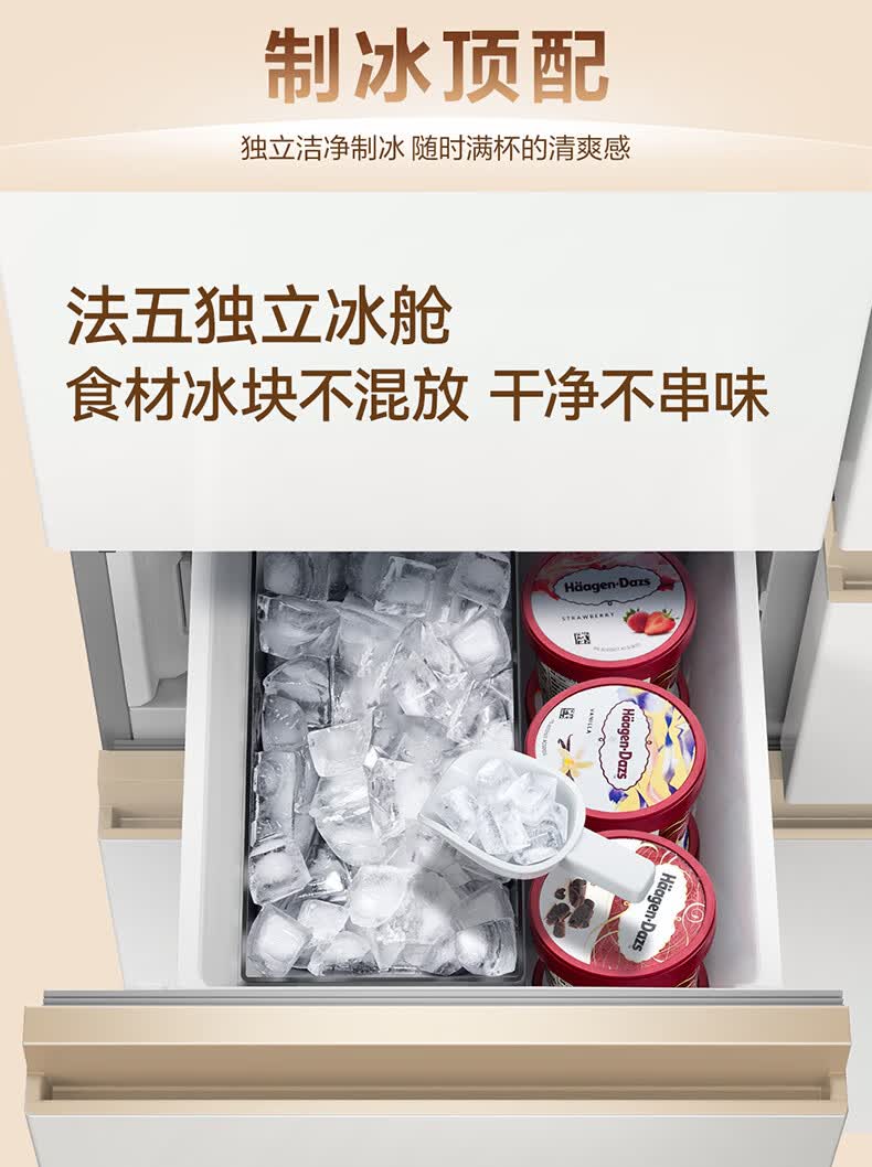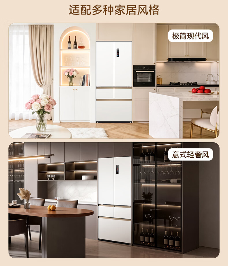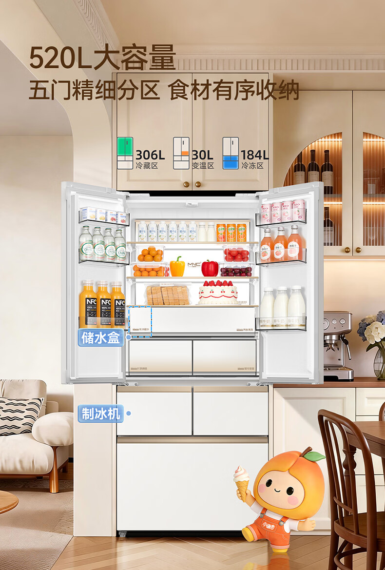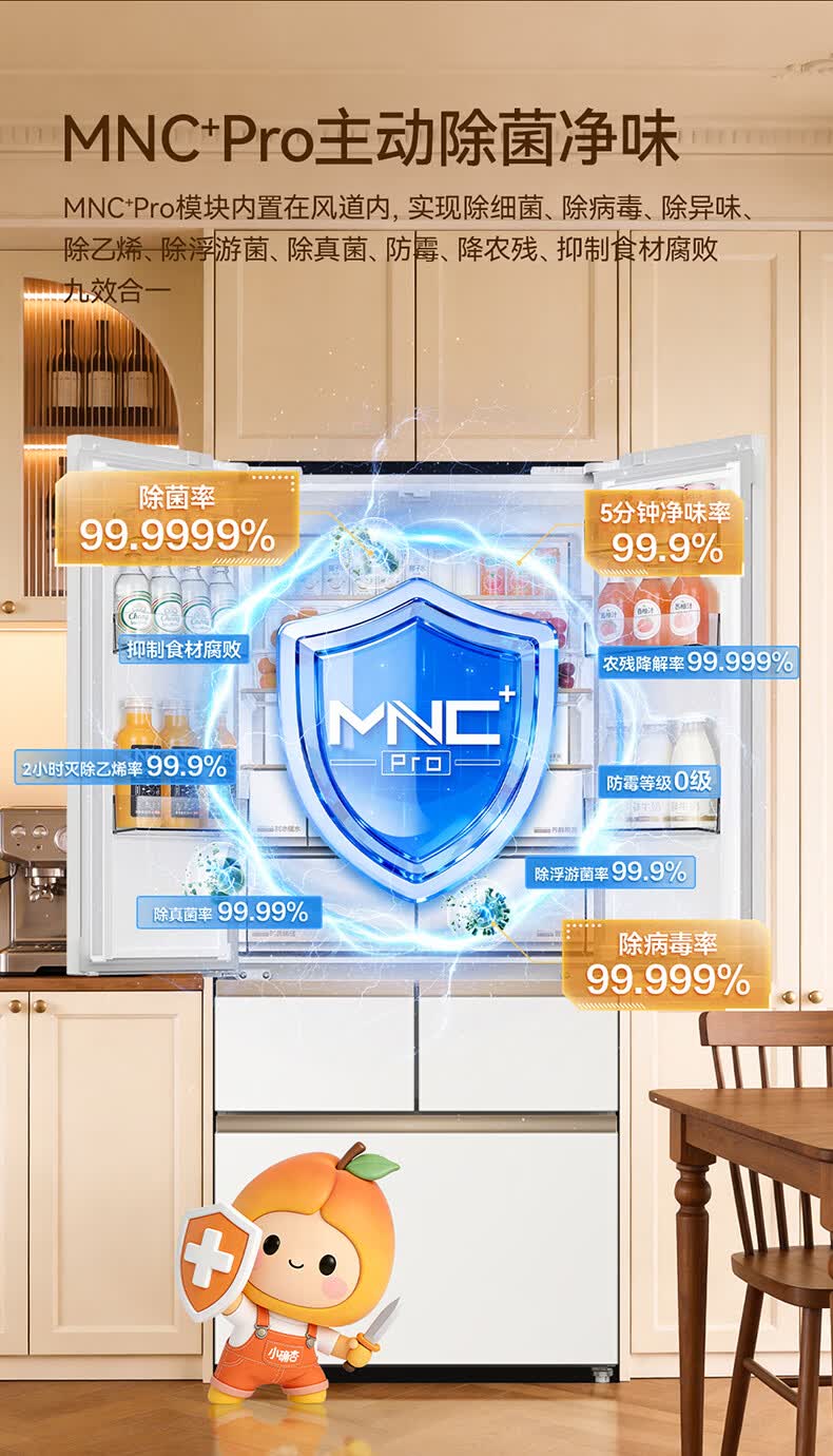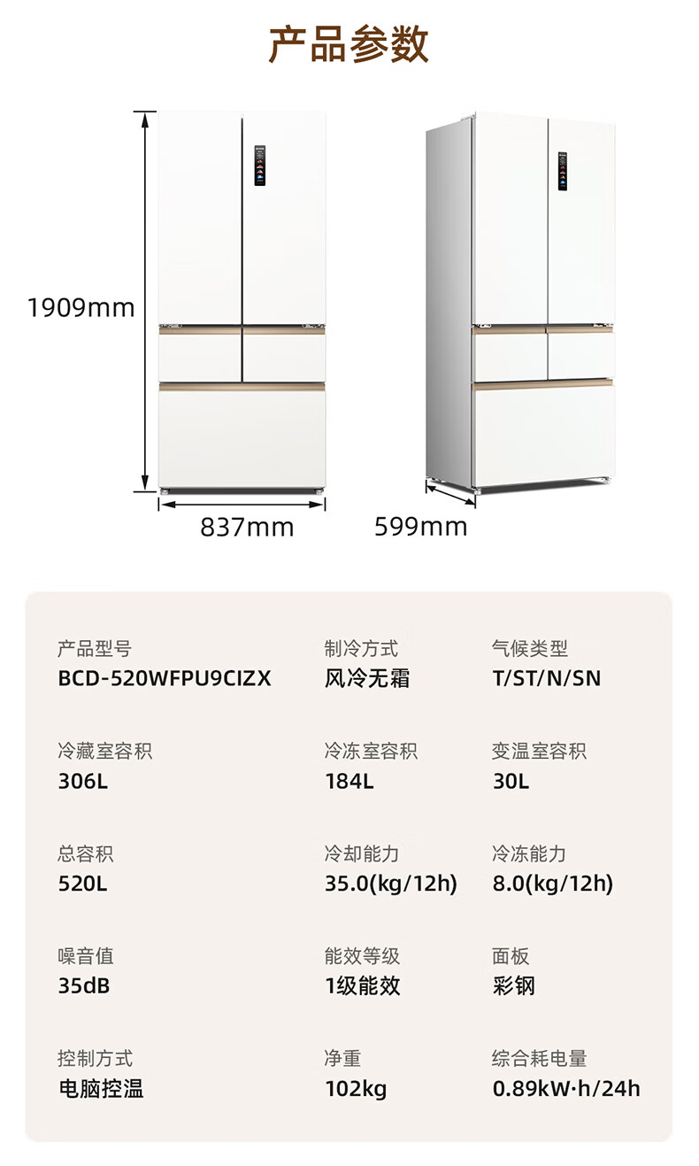 美菱小确杏520L法式多门冰箱双系统主动除菌自动制冰零平嵌入式一级能效风冷BCD-520WFPU9CIZX国家补贴 小确杏·机皇520