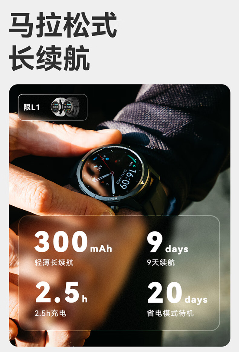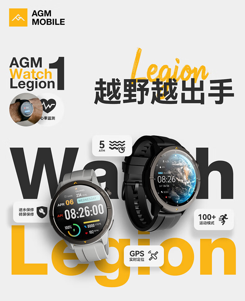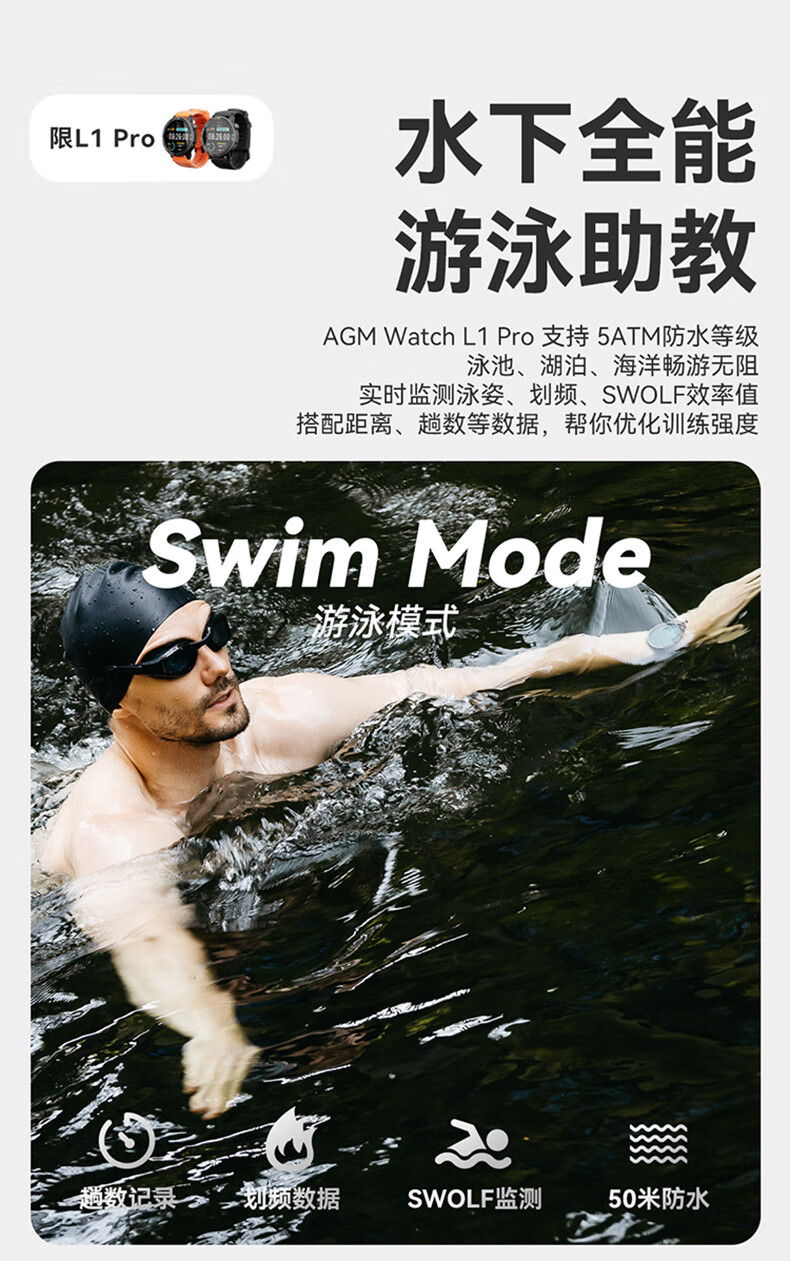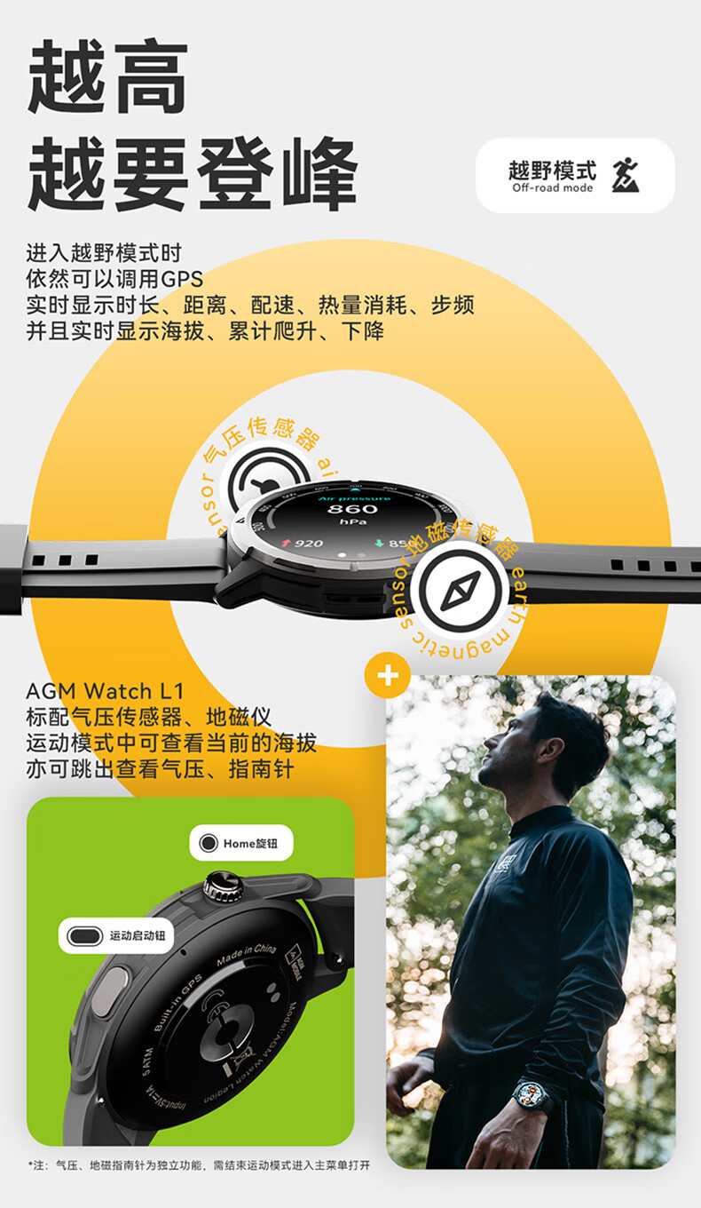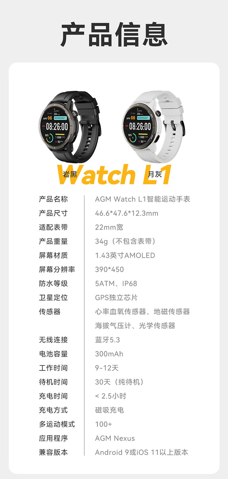 AGM Watch L1 专业运动跑步智能手表马拉松骑行登山GPS配速心率公里数监测50米防水男女通用智能手环 灰色 L1
