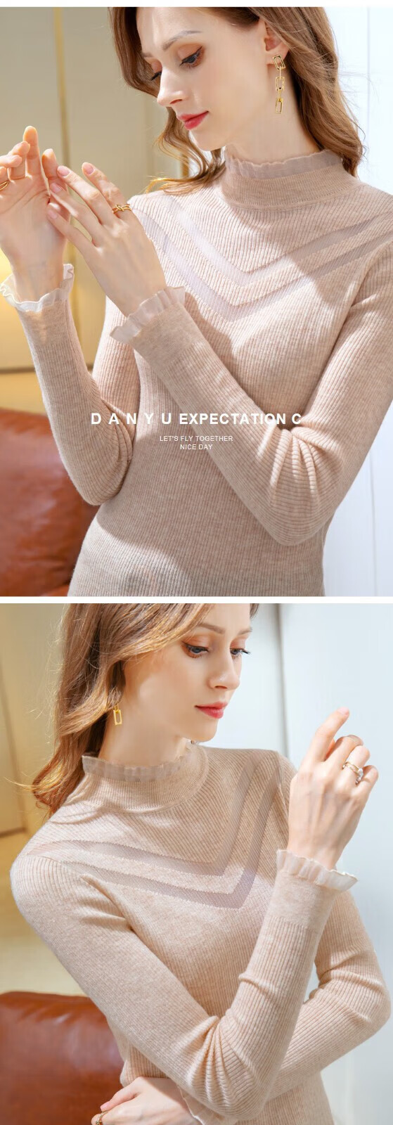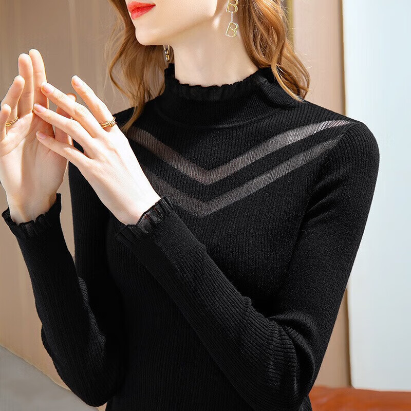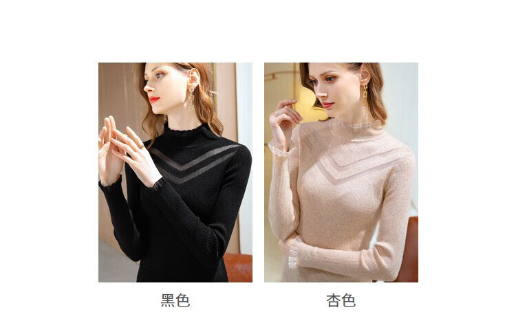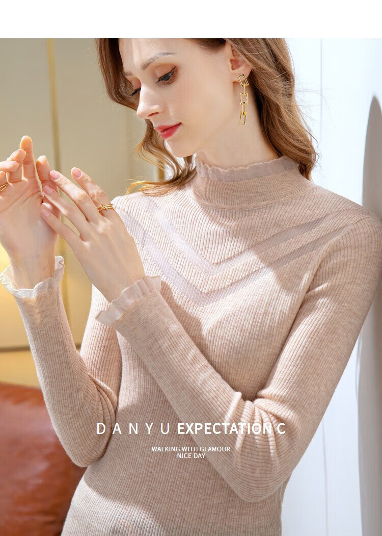 香影芬新款针织衫女半高领蕾丝边打底衫女修身镂空毛衣女洋气内搭上衣女 杏色 XL (建议115-125斤)