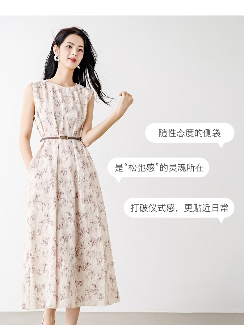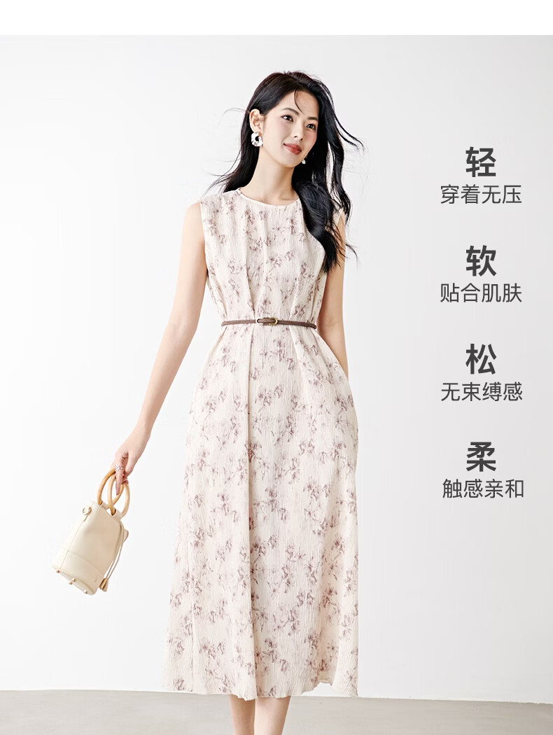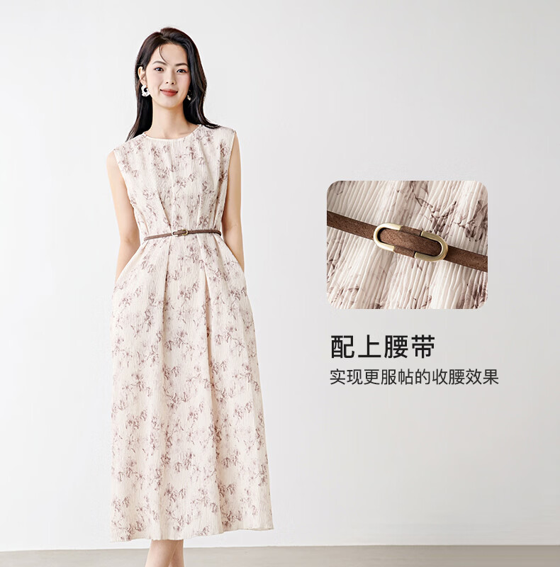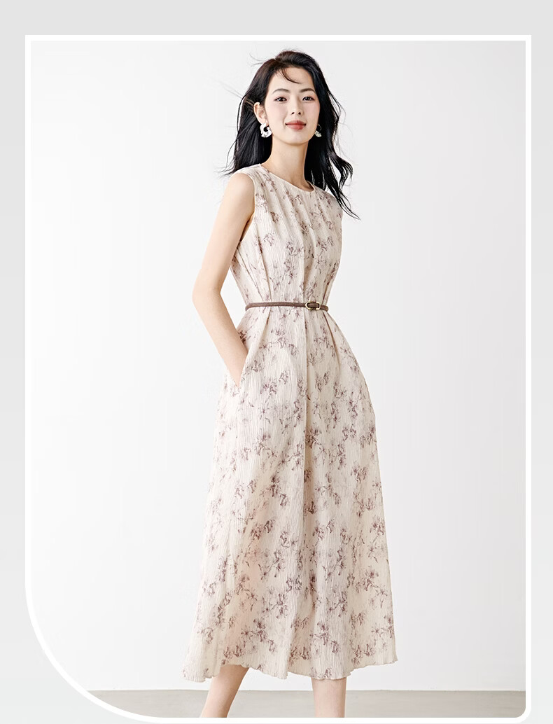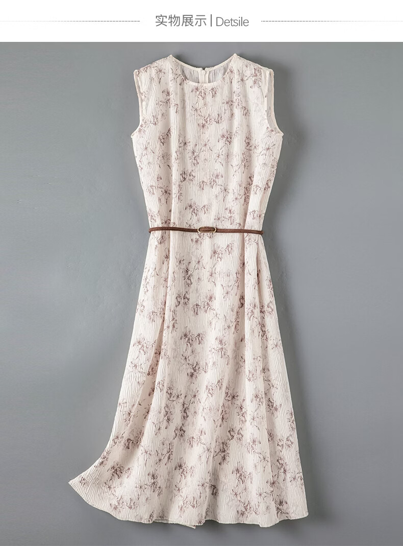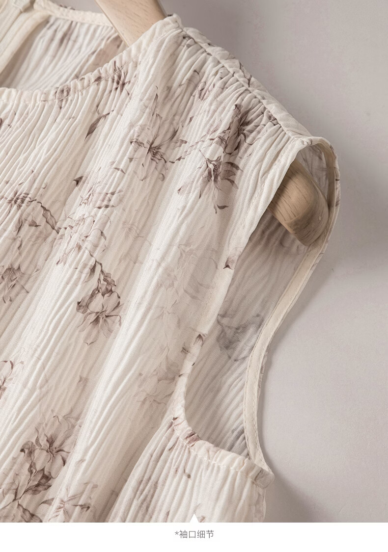 晚白【新品】2026年春款时尚印花裙子轻薄透气褶皱宽松无袖连衣裙 杏色 XL