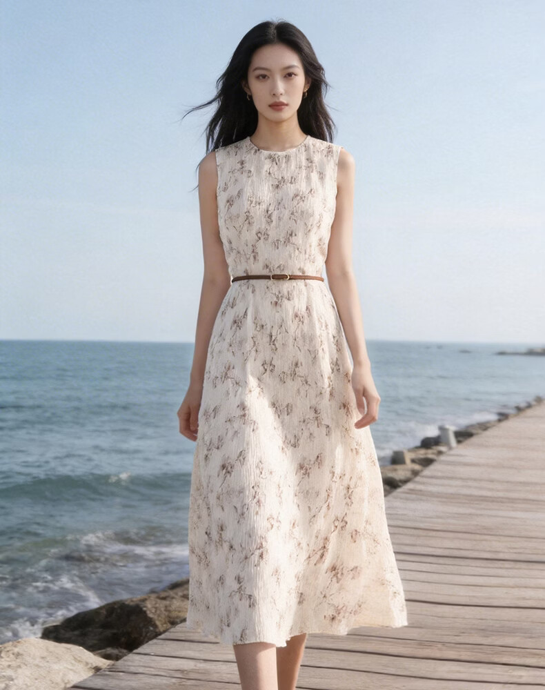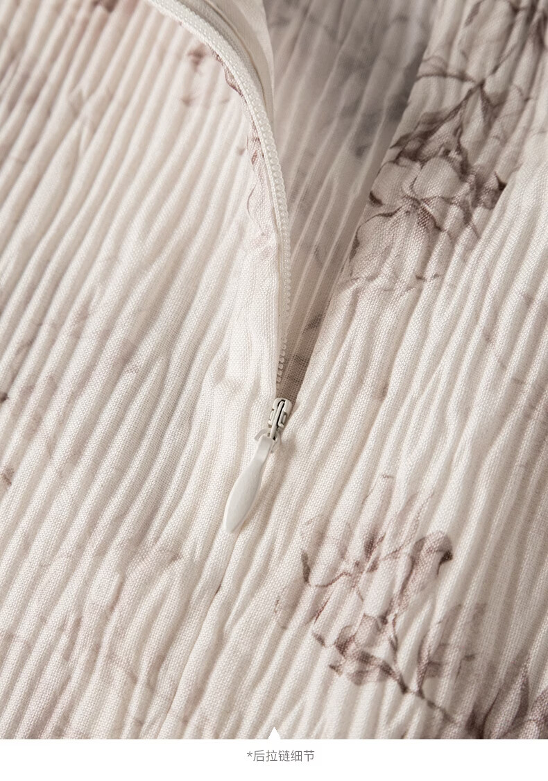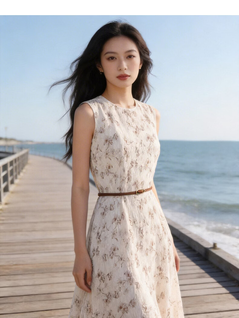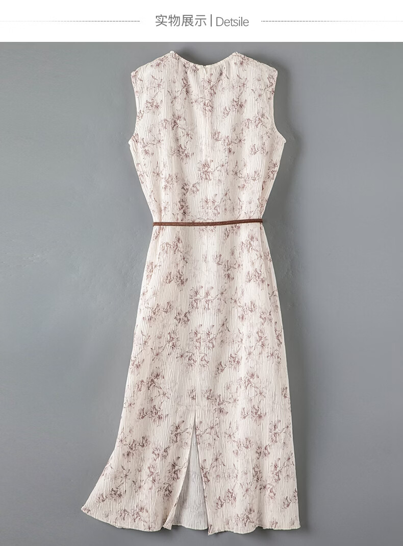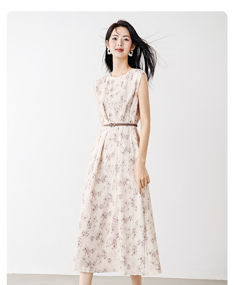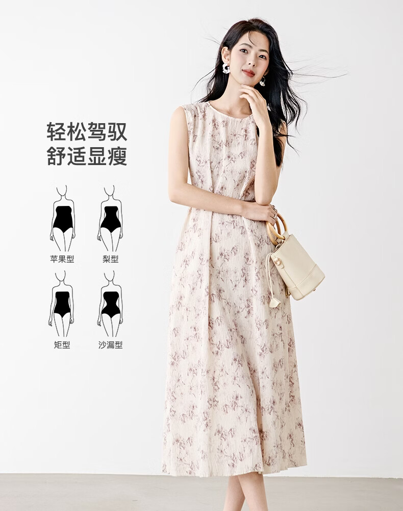 晚白【新品】2026年春款时尚印花裙子轻薄透气褶皱宽松无袖连衣裙 杏色 XL