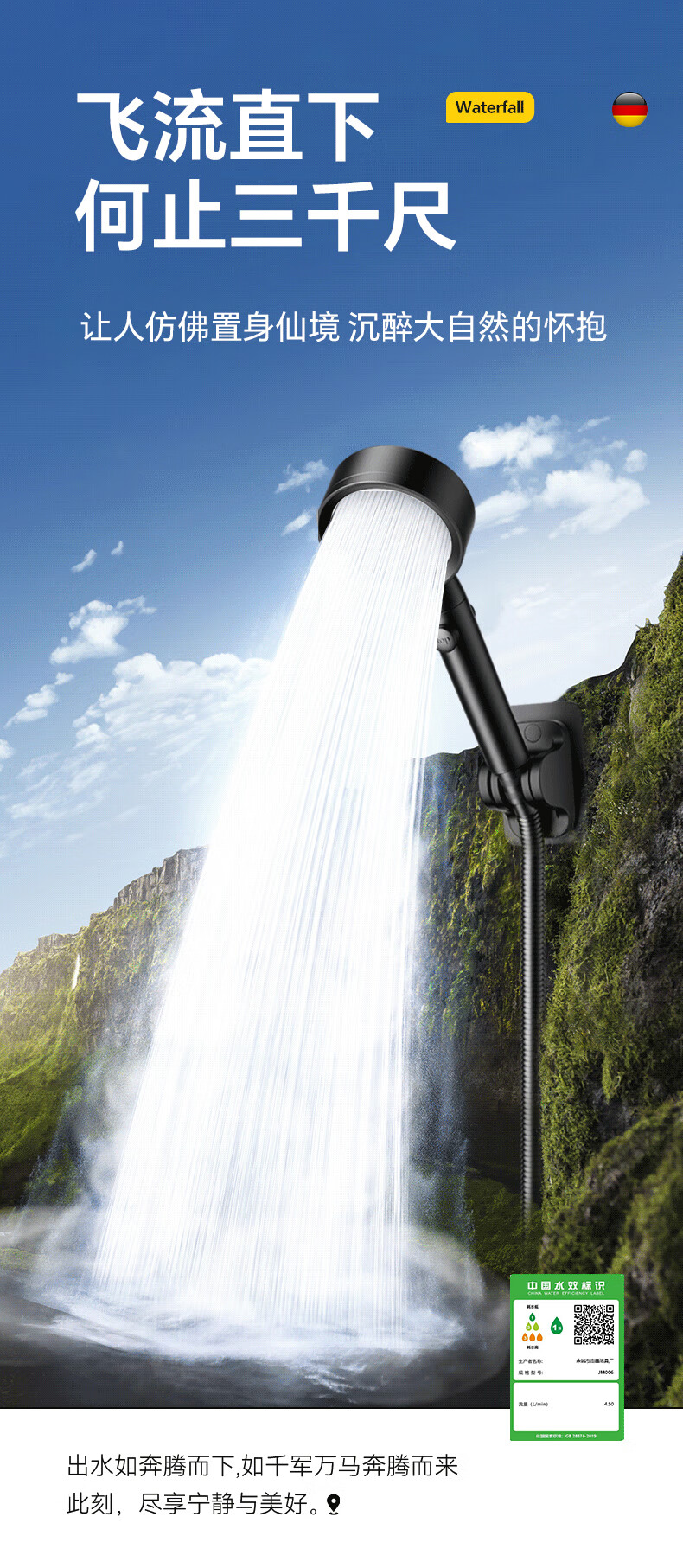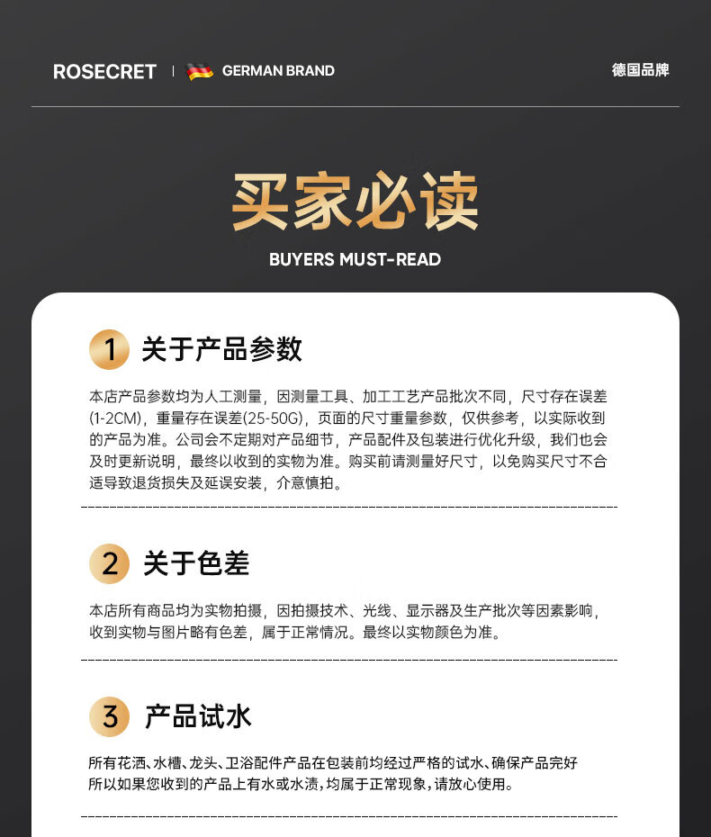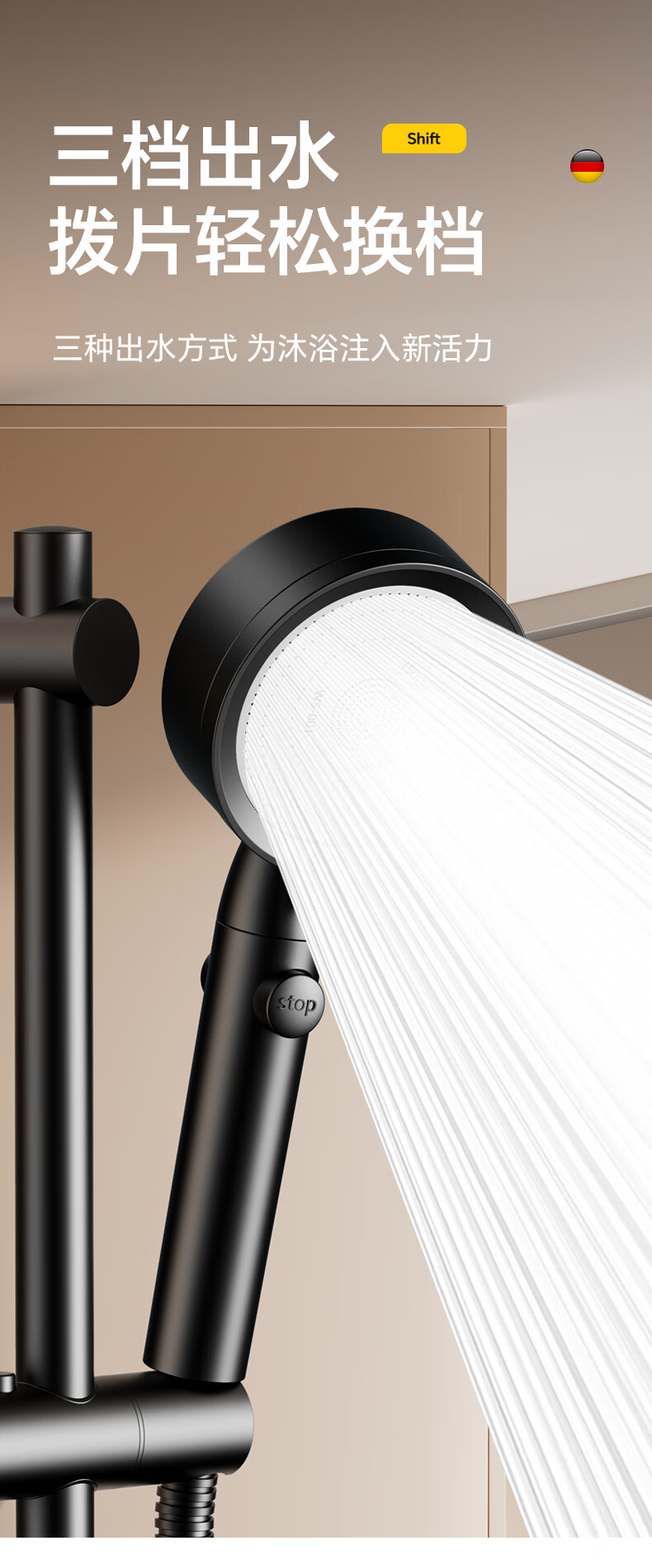 Rosecret【德国】增压淋浴花洒喷头全套家用强劲加压卫生间洗澡手持莲蓬头 不锈钢面板【3档黑色】单喷头 一键止水丨涡轮增压丨大流量出水