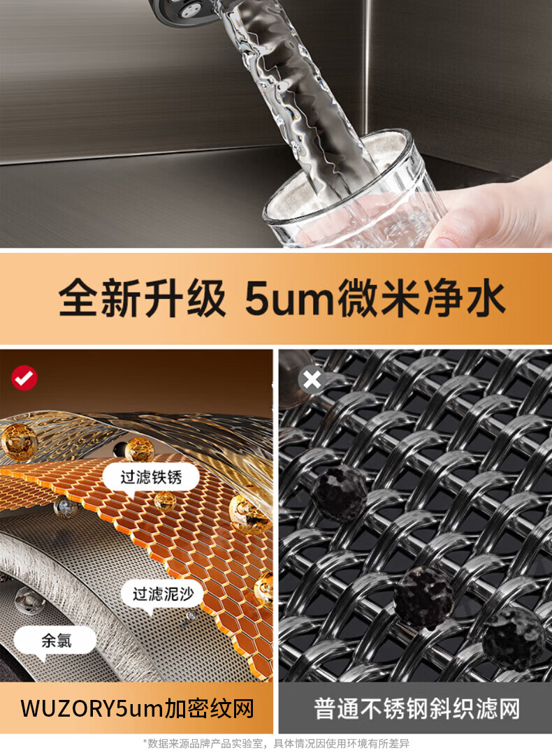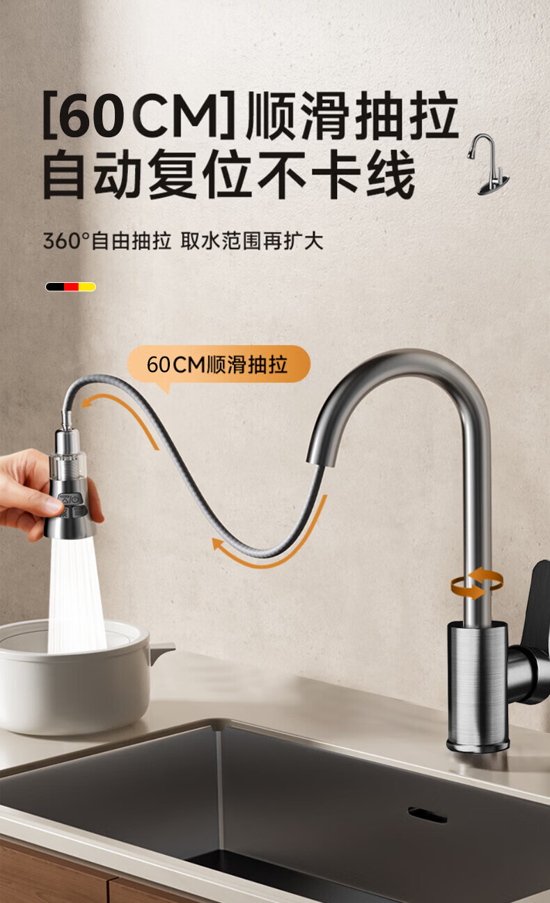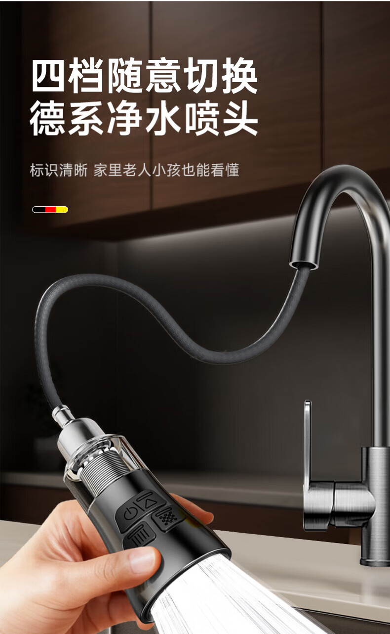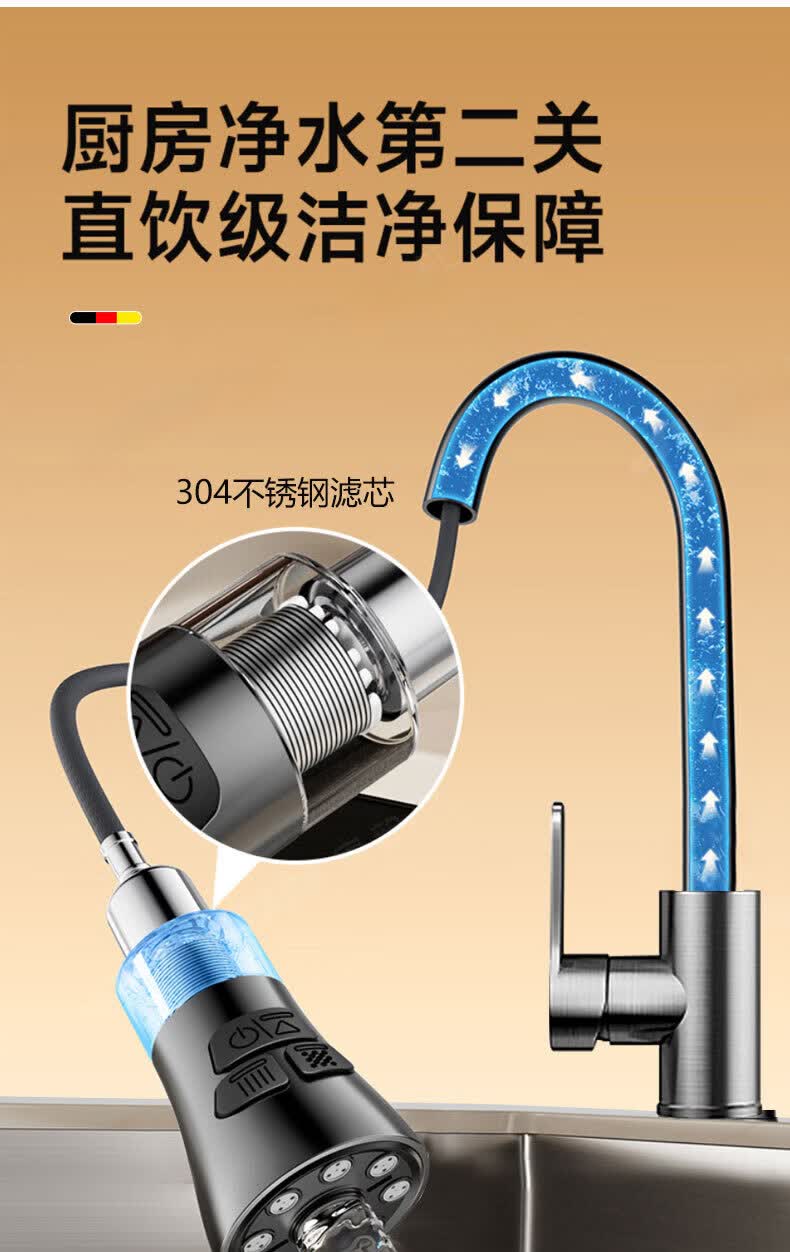 WUZORY【德国】厨房水龙头冷热水二合一洗菜盆抽拉式万向旋转水槽水龙头 【304不锈钢】四档过滤龙头-枪灰 抽拉式设计丨大范围清洗更便捷