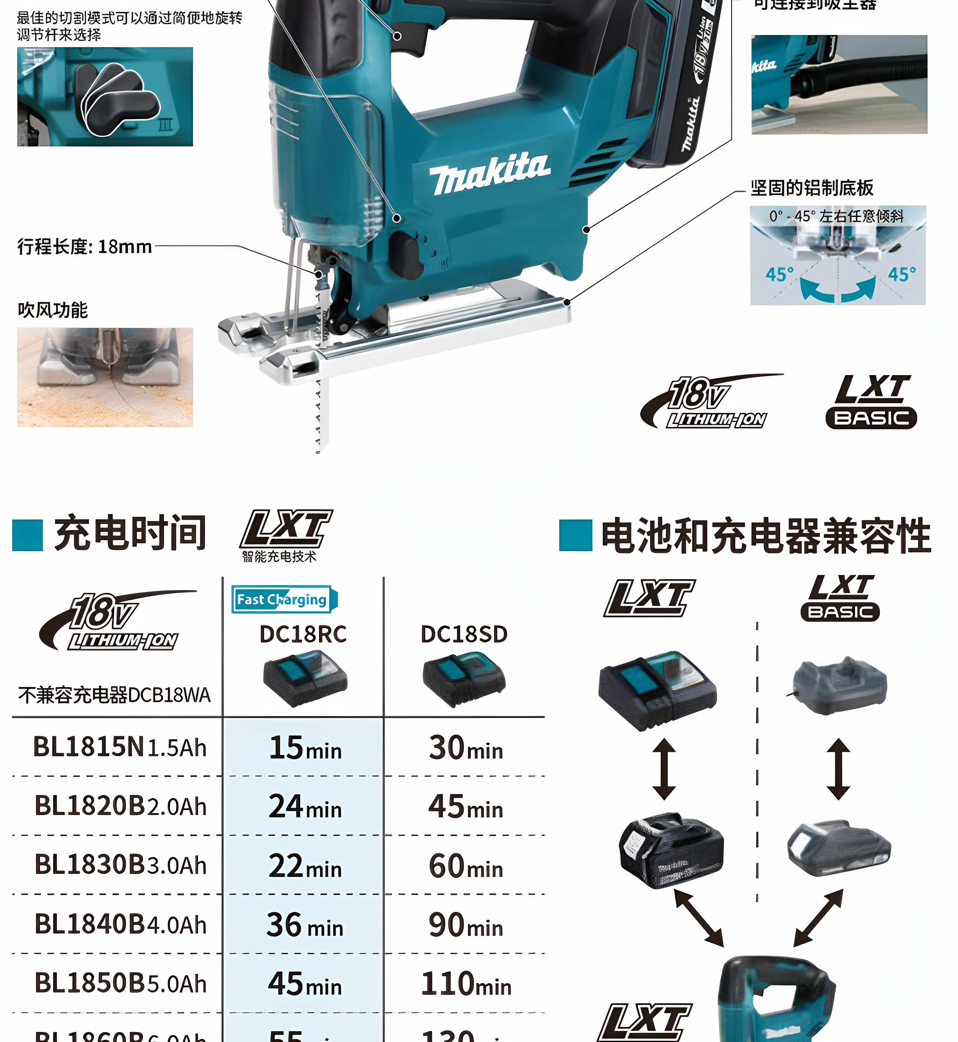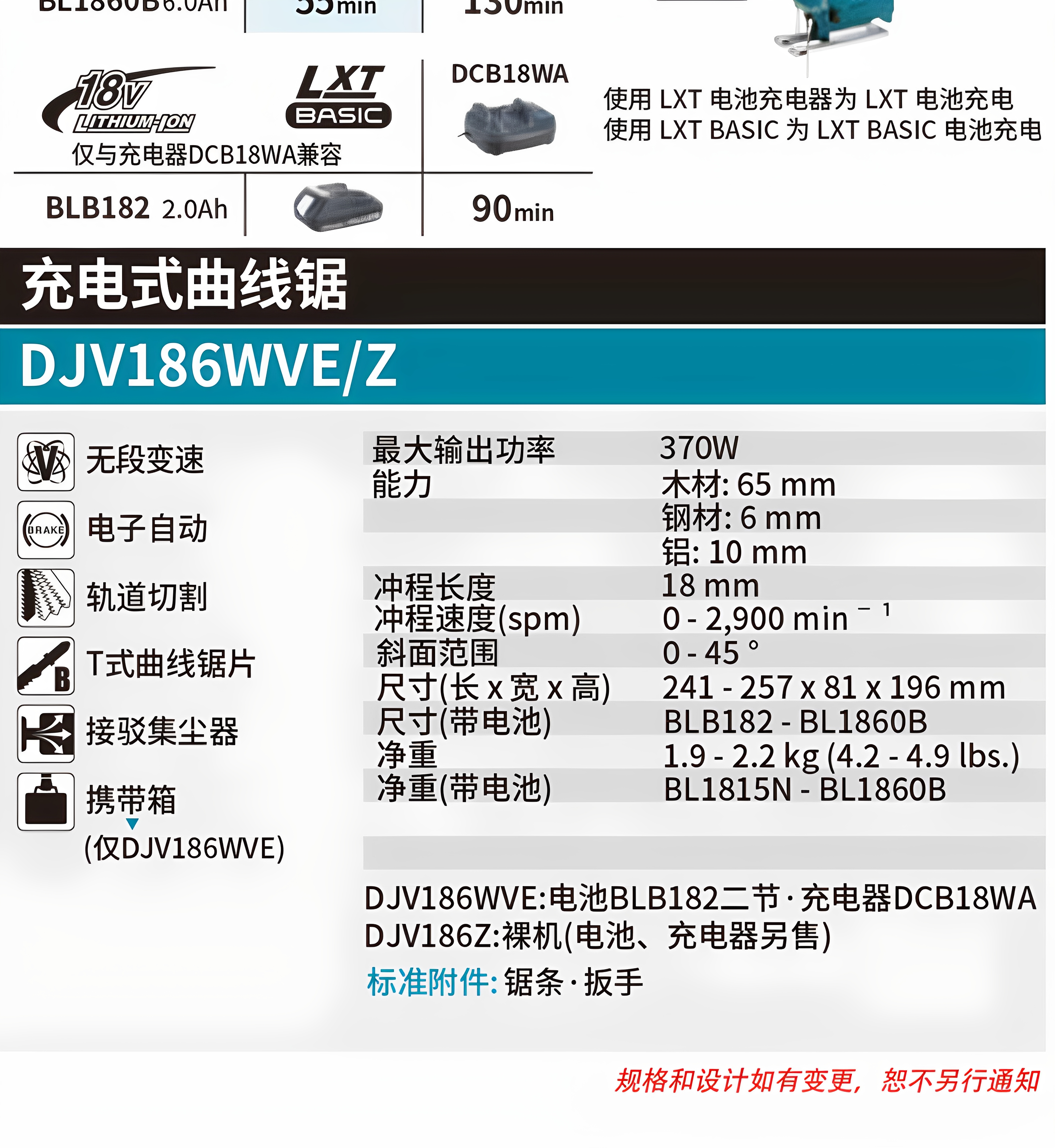 MAKITADJV186充电式曲线锯18V家用小型往复锯木工切割电动工具大功率 DJV186Z 裸机曲线锯