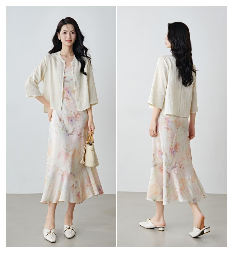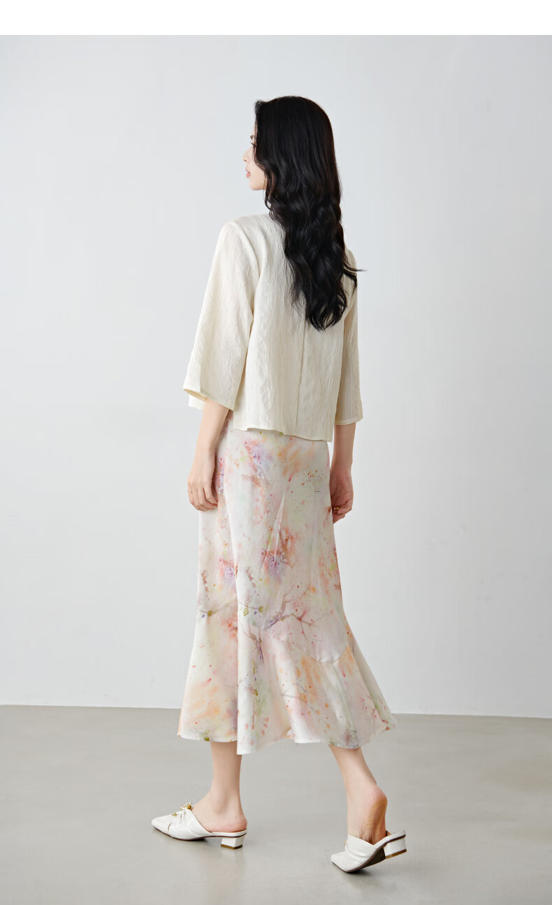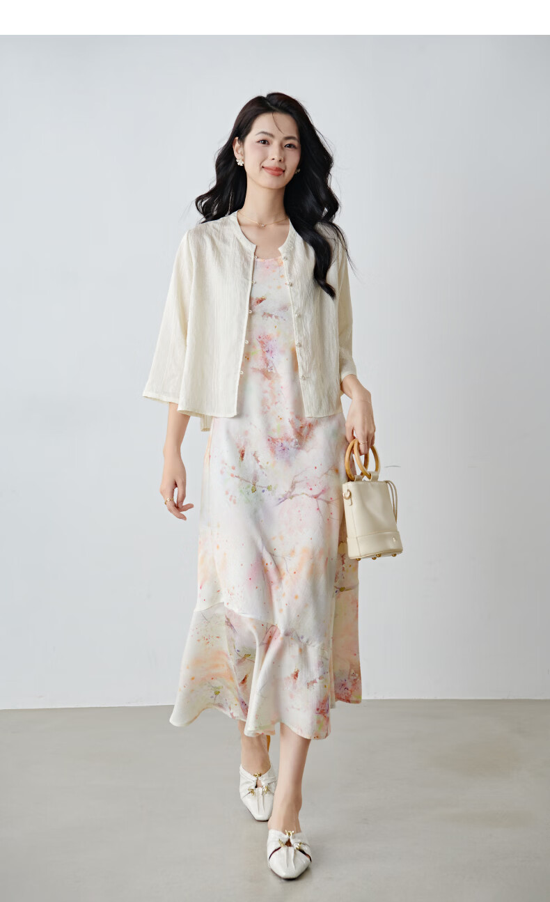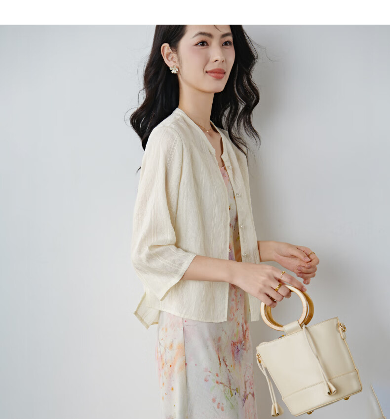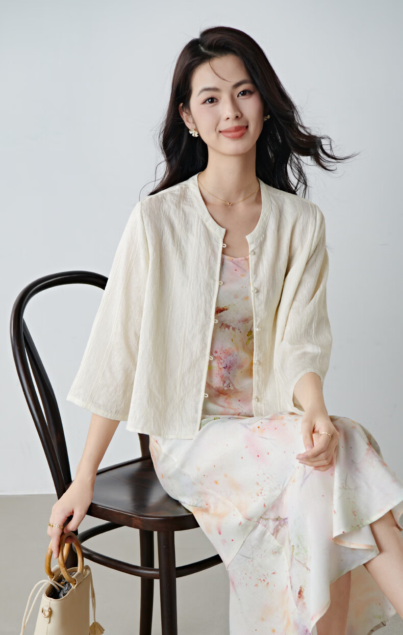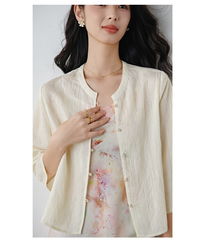 晚白2026春款新中式轻薄绘花麻感上衣宽松廓形古典国风盘扣轻盈衬衫女 米杏色 M