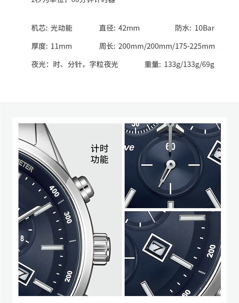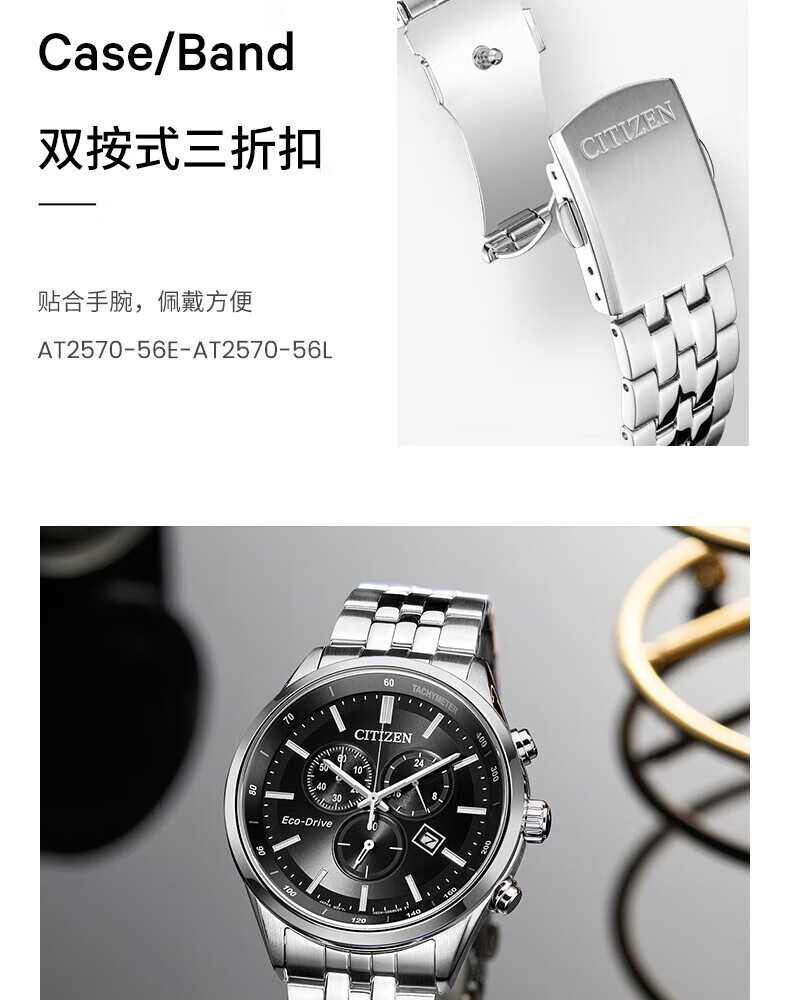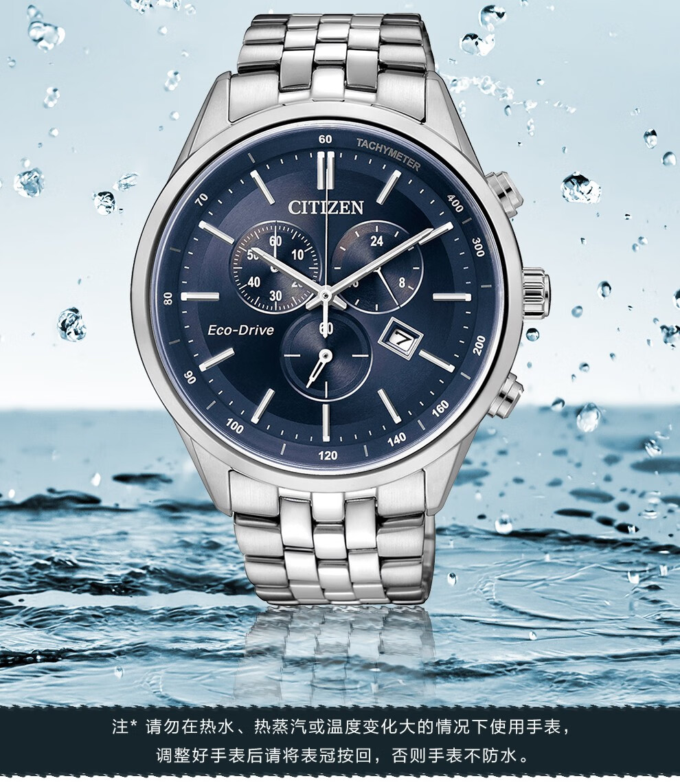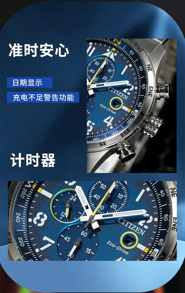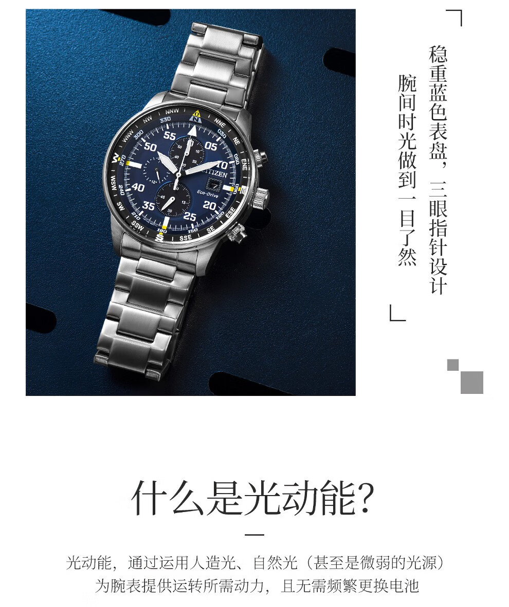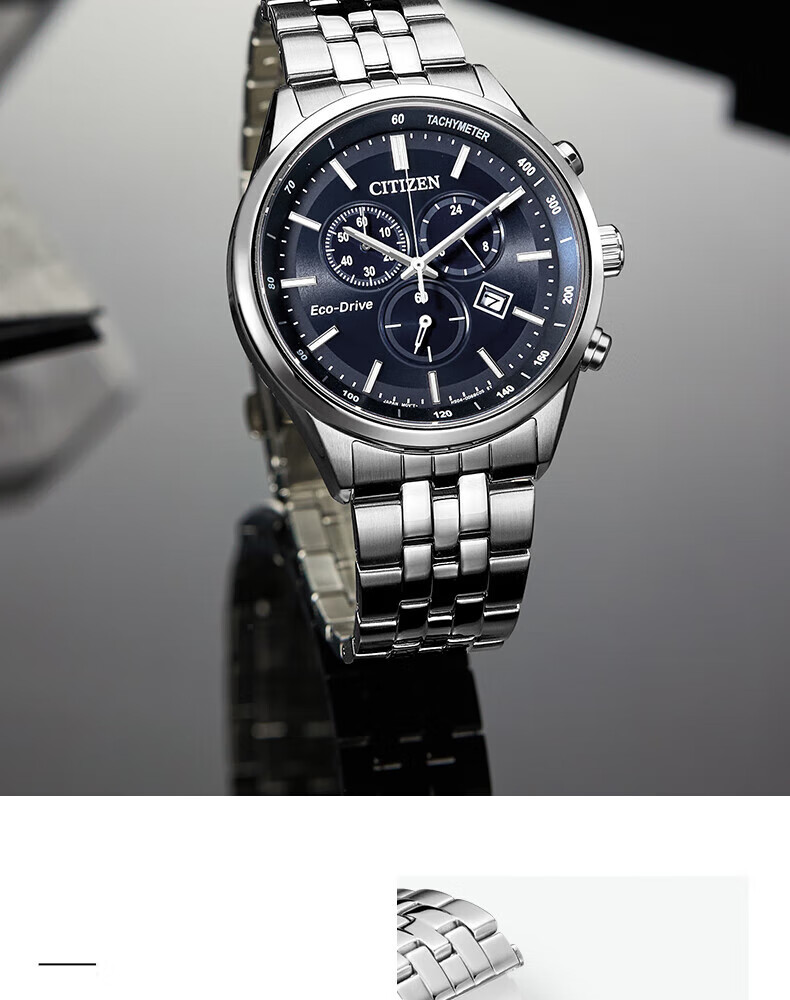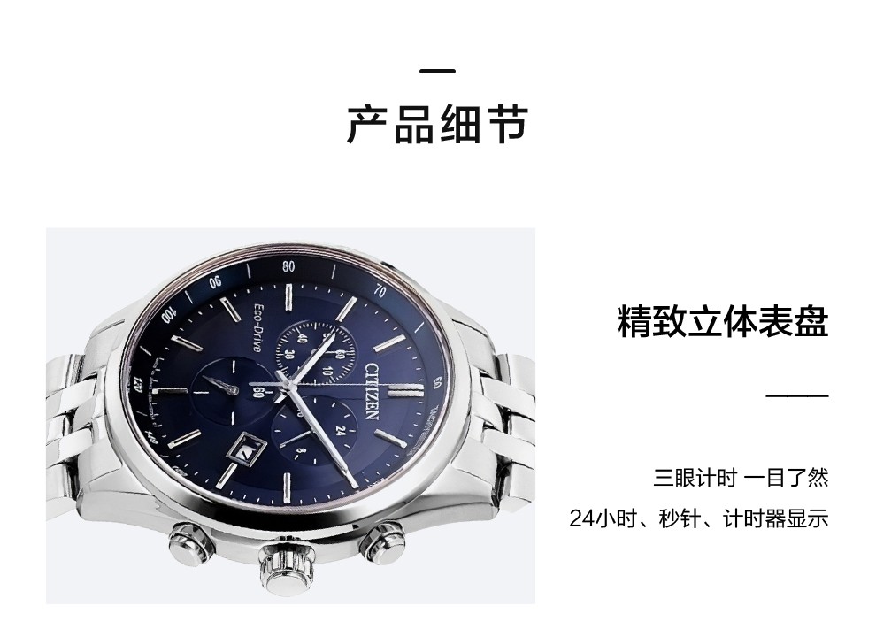 西铁城(CITIZEN)三眼计时防水光动能腕表商务运动休闲钢带/皮带男士手表 新款三眼蓝盘钢带AT2570-56L