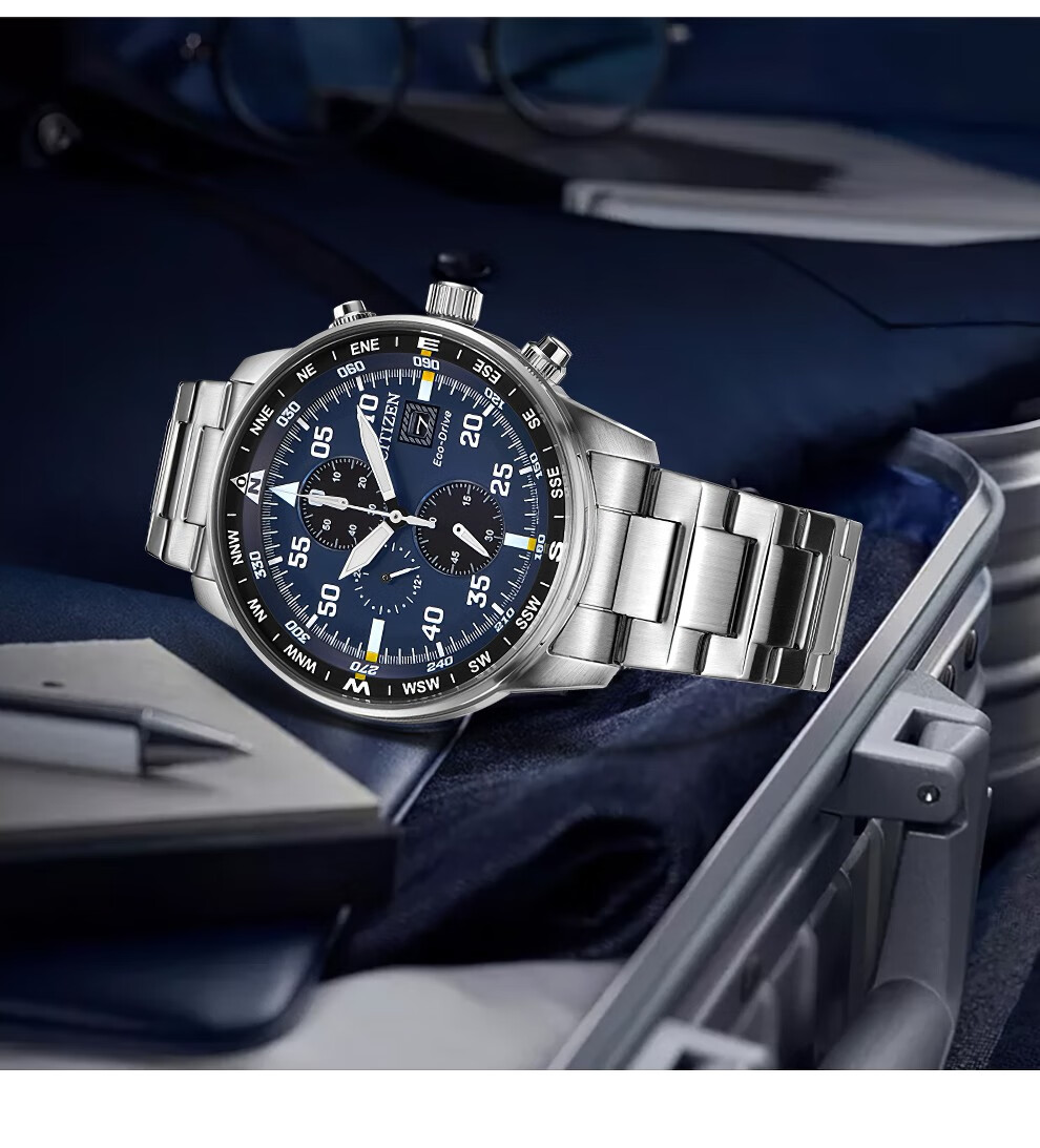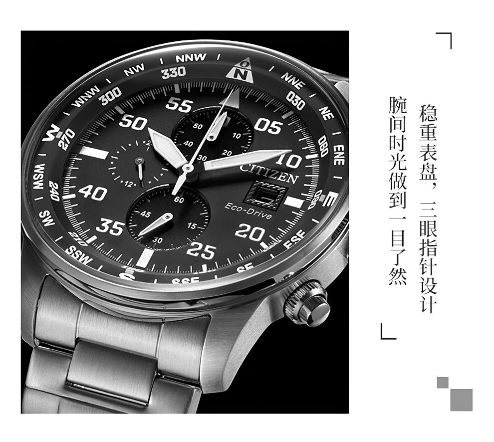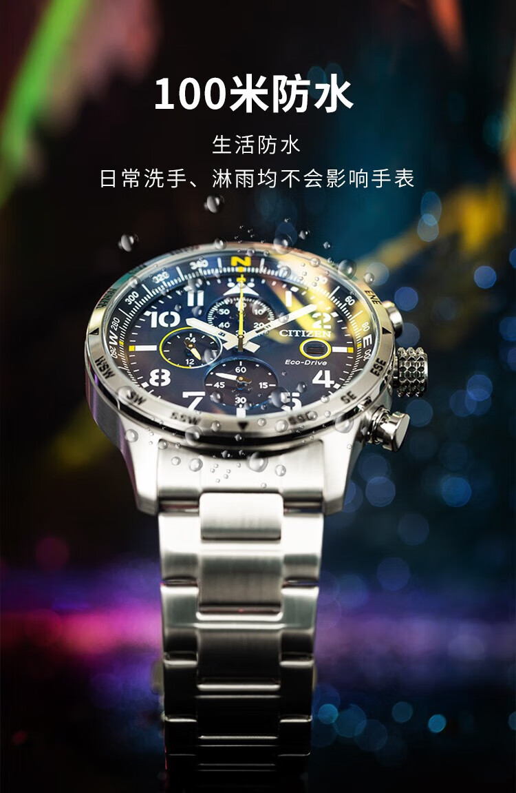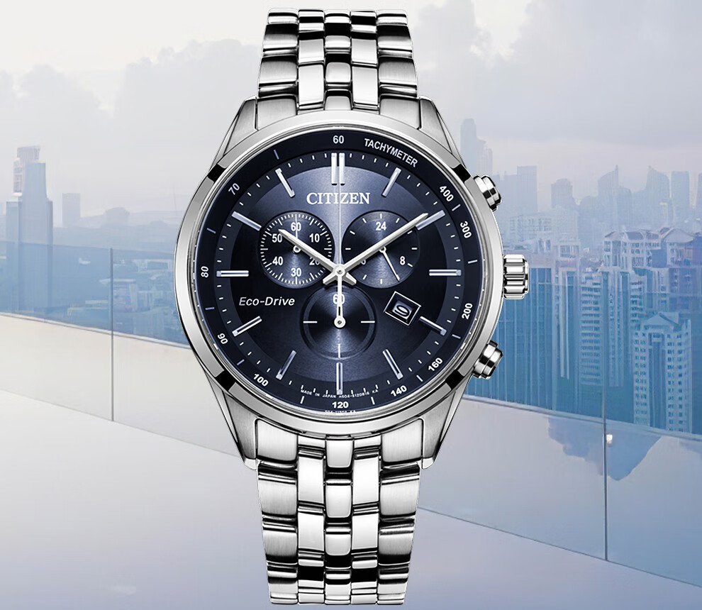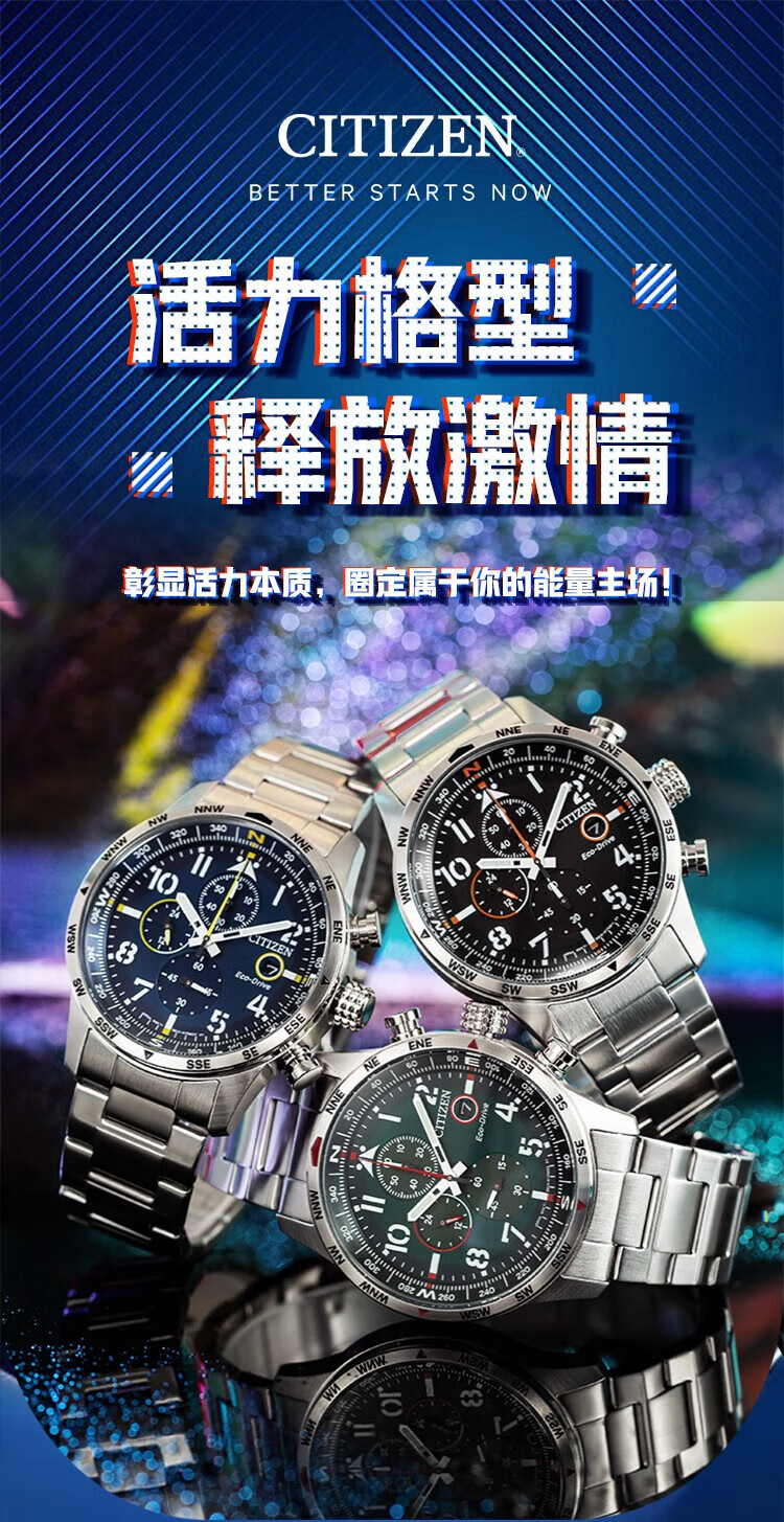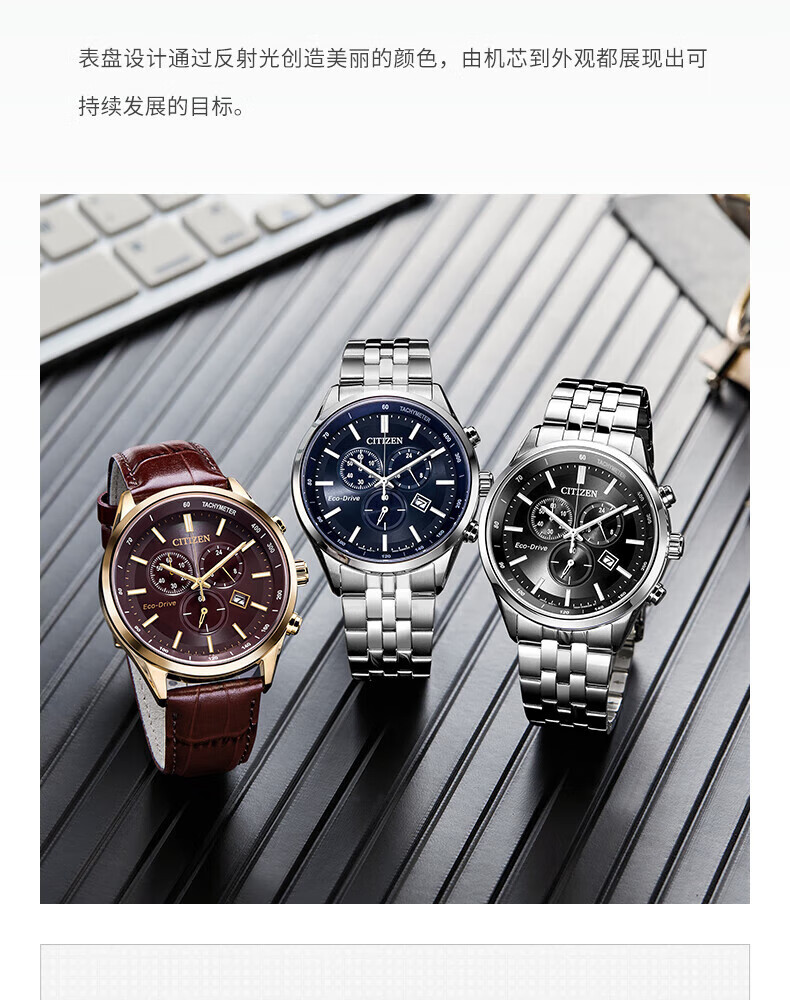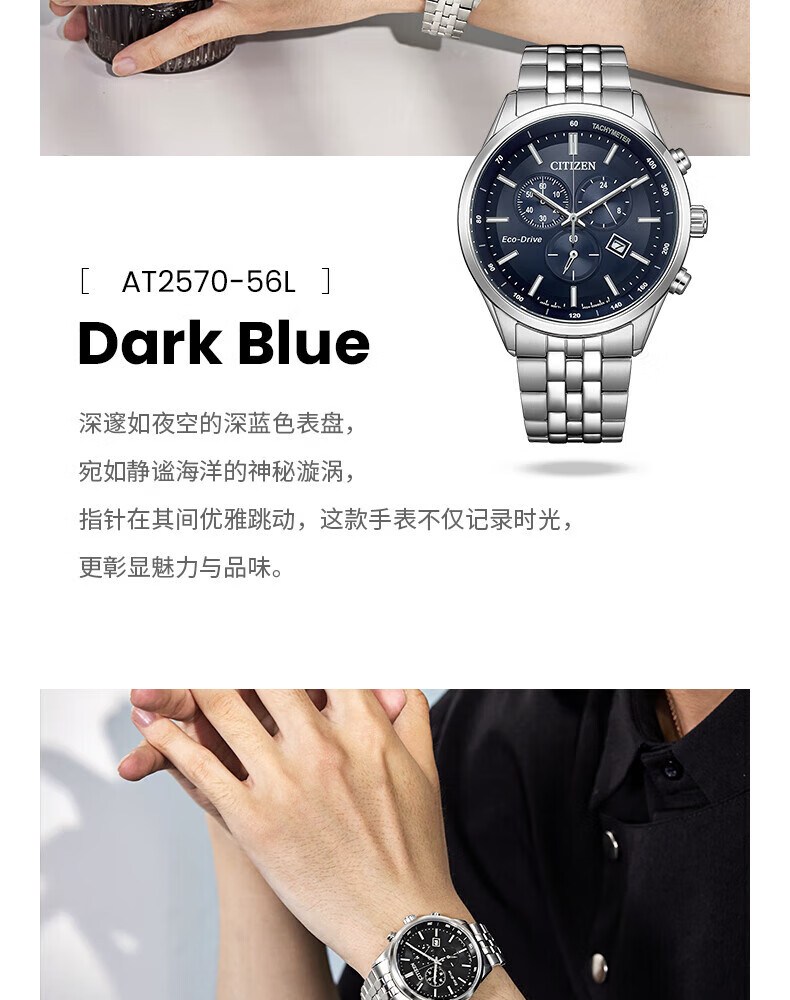 西铁城(CITIZEN)三眼计时防水光动能腕表商务运动休闲钢带/皮带男士手表 新款三眼蓝盘钢带AT2570-56L