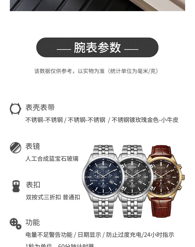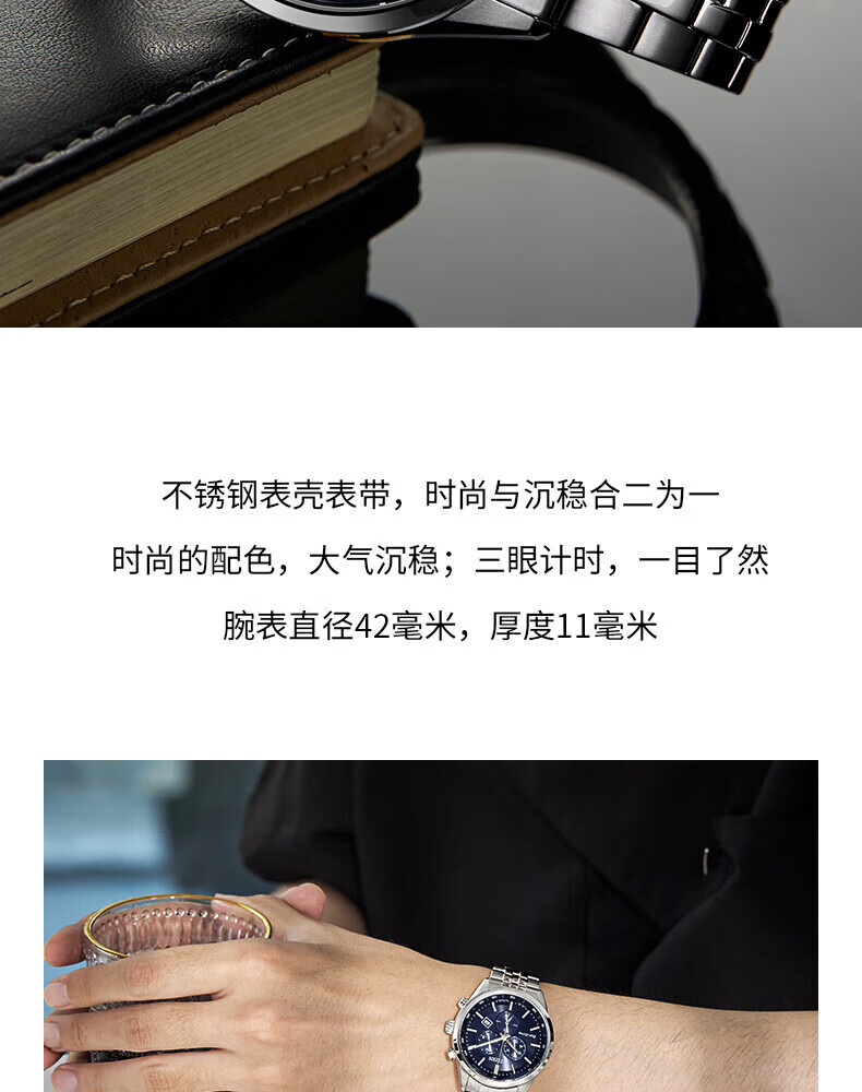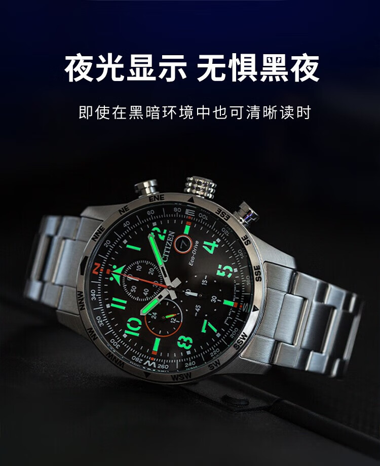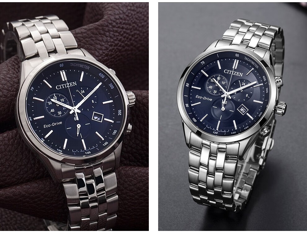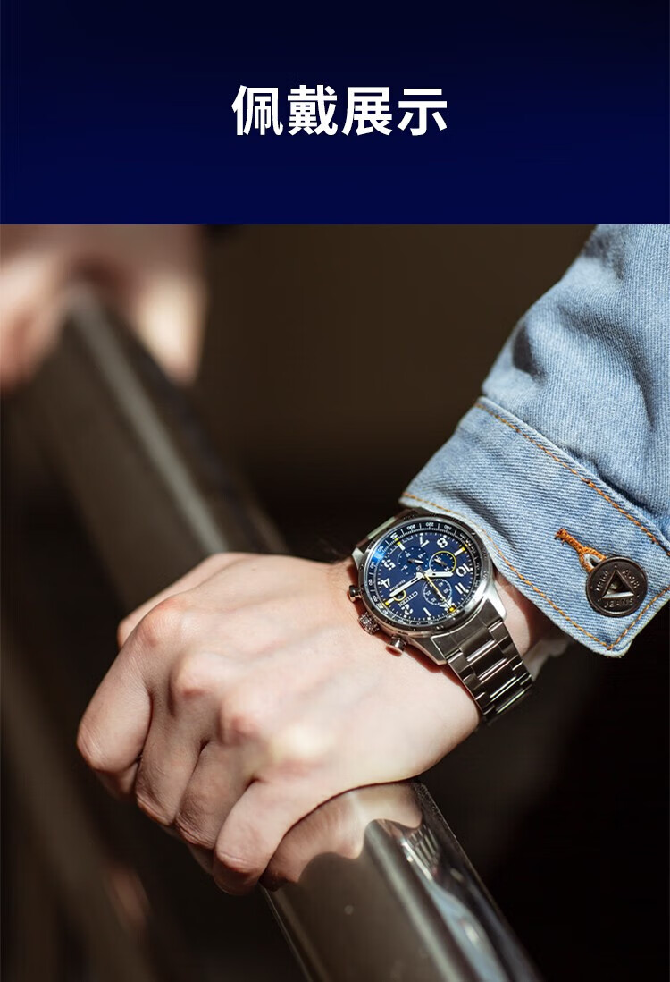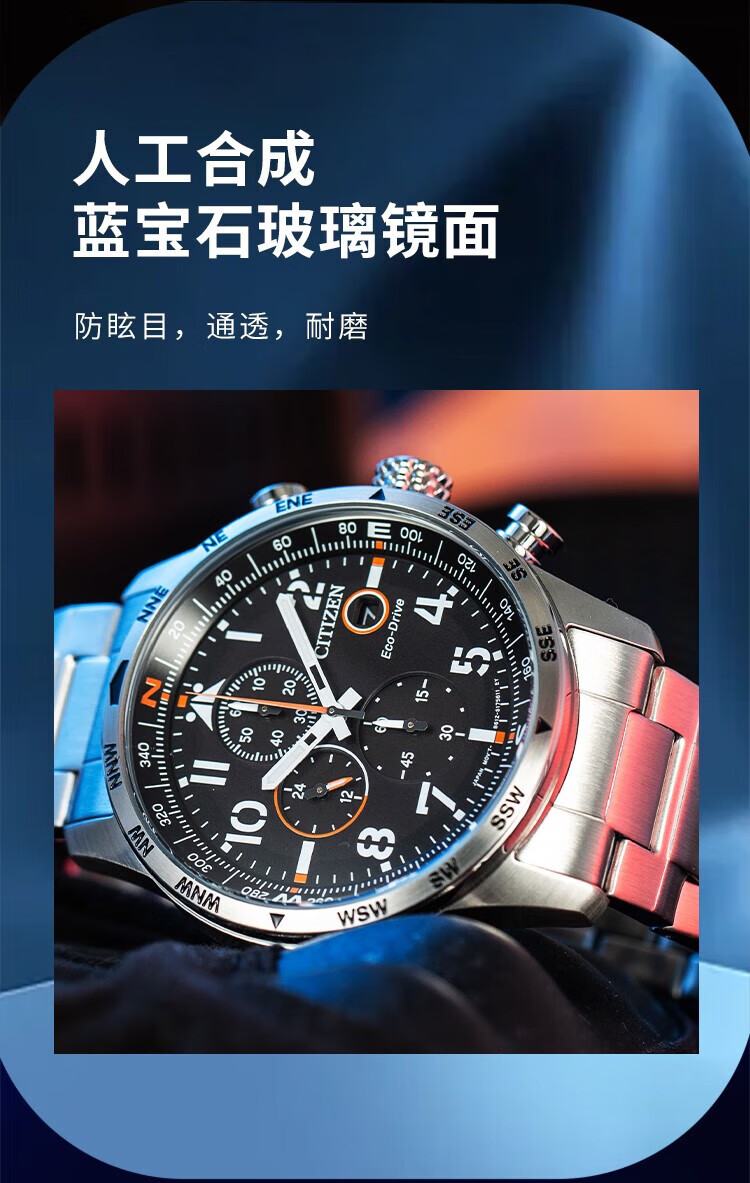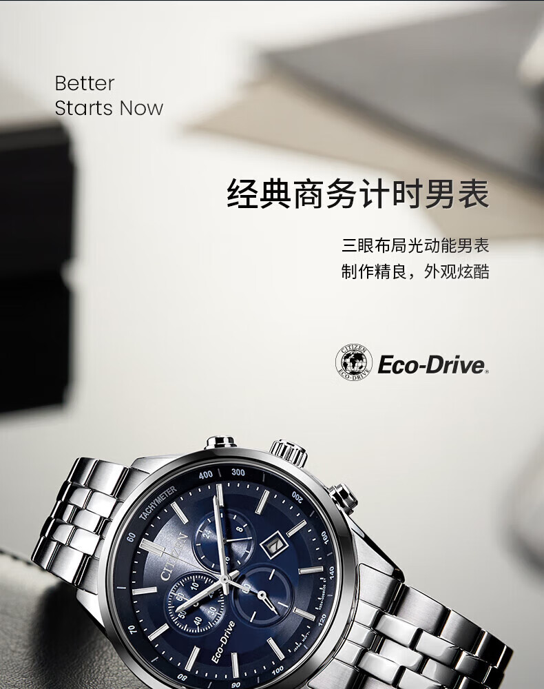 西铁城(CITIZEN)三眼计时防水光动能腕表商务运动休闲钢带/皮带男士手表 新款三眼蓝盘钢带AT2570-56L