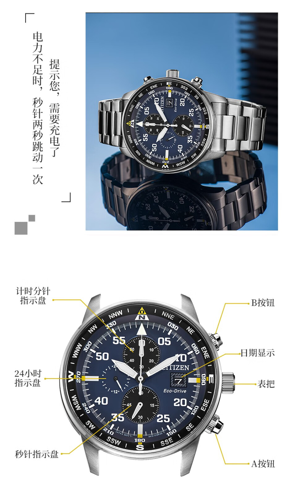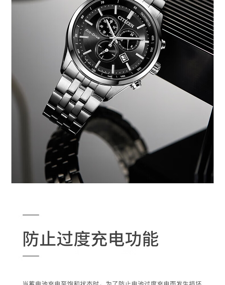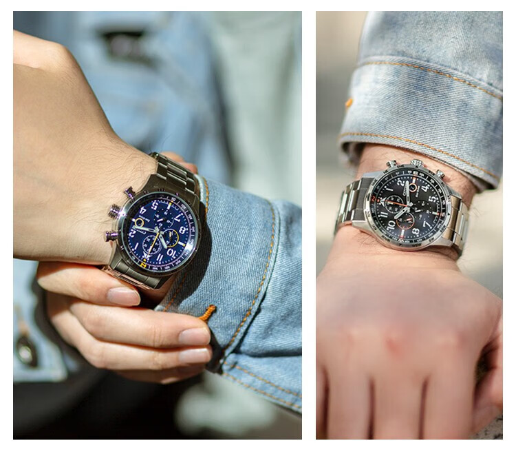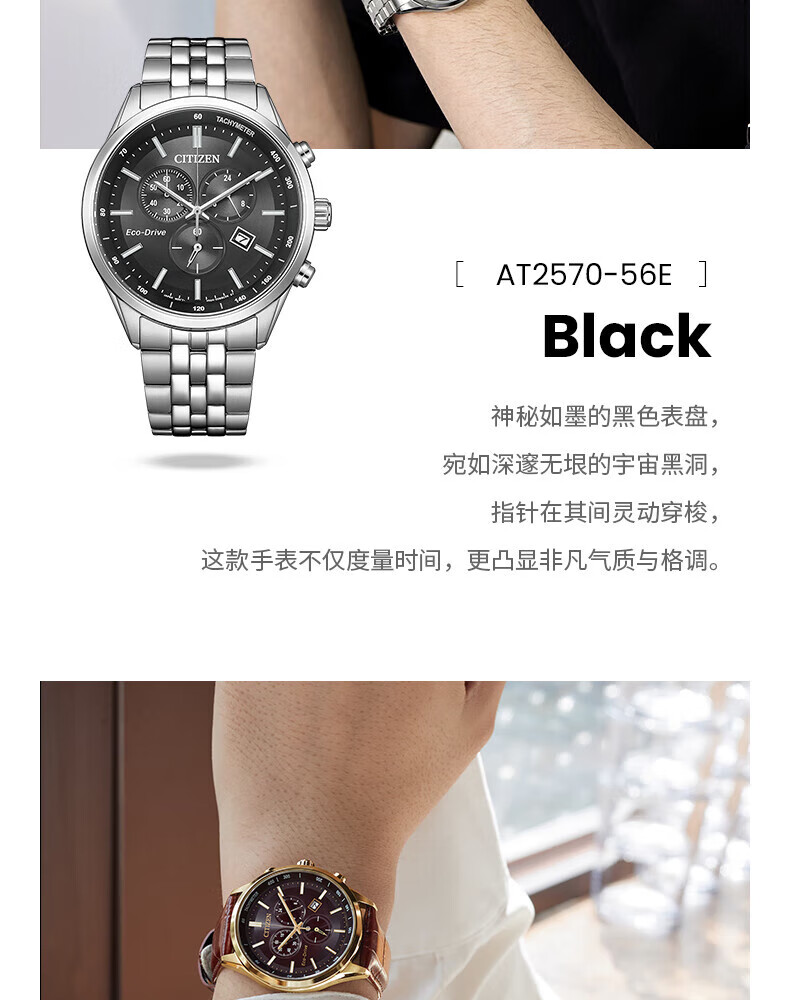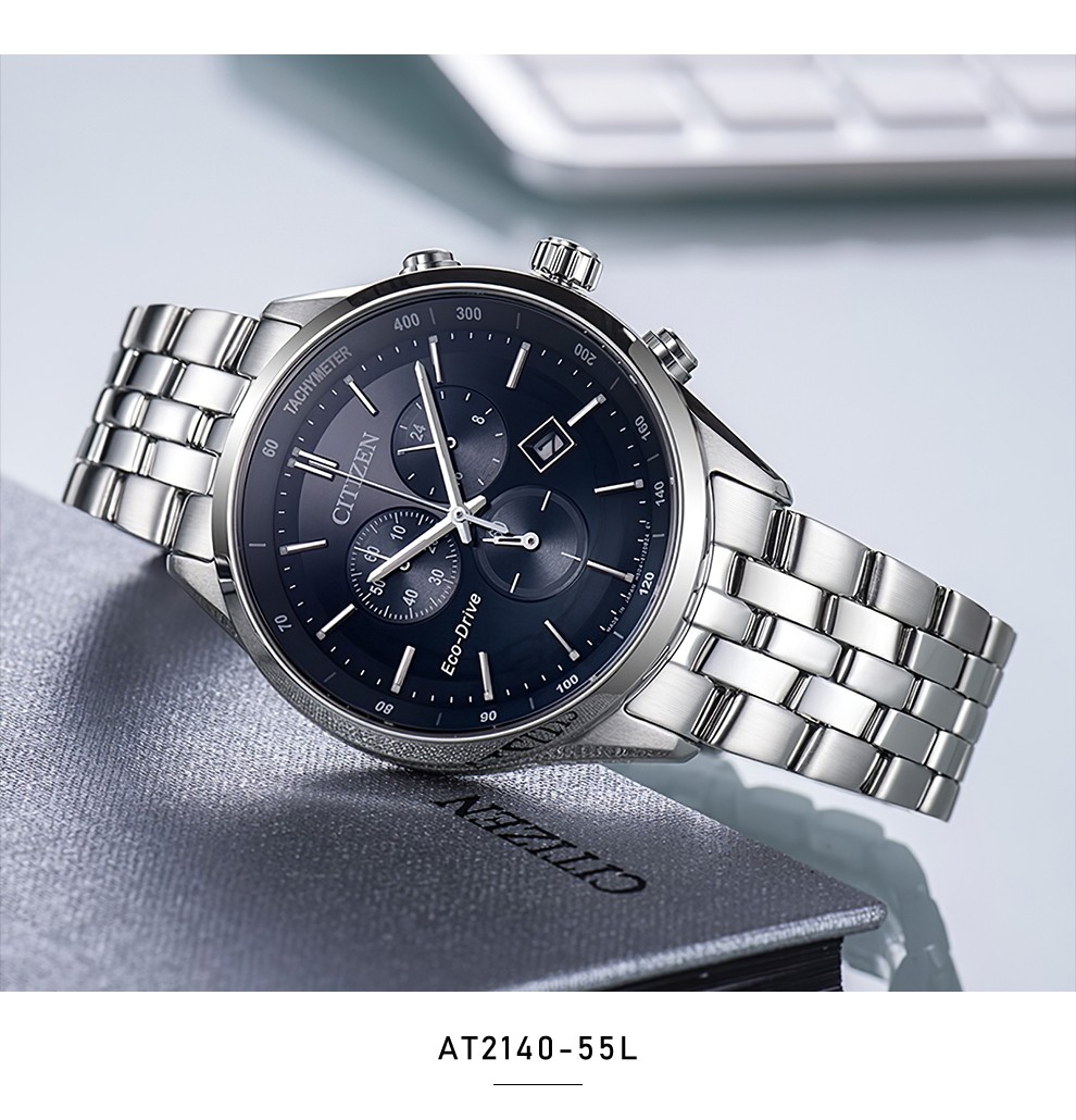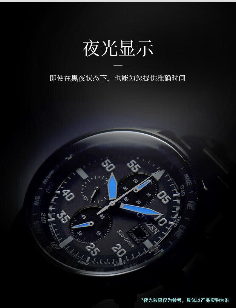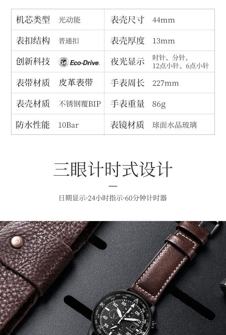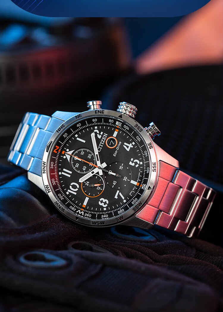 西铁城(CITIZEN)三眼计时防水光动能腕表商务运动休闲钢带/皮带男士手表 新款三眼蓝盘钢带AT2570-56L