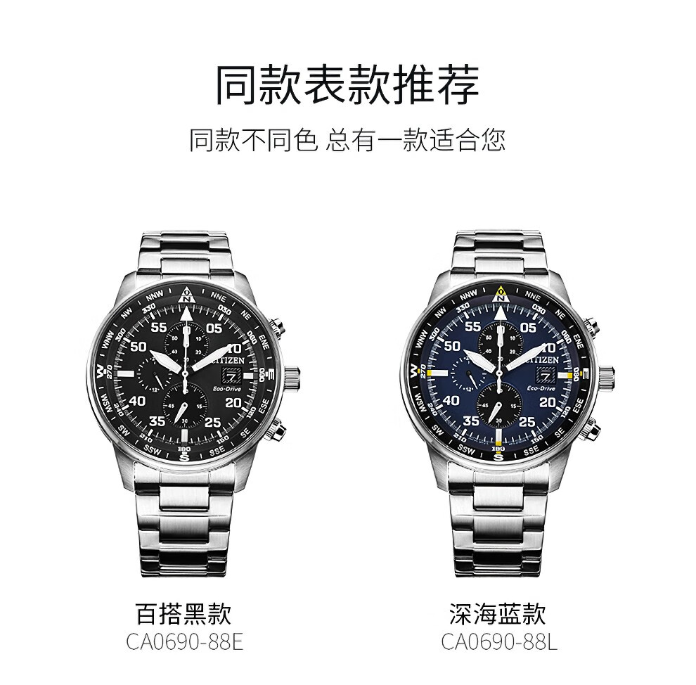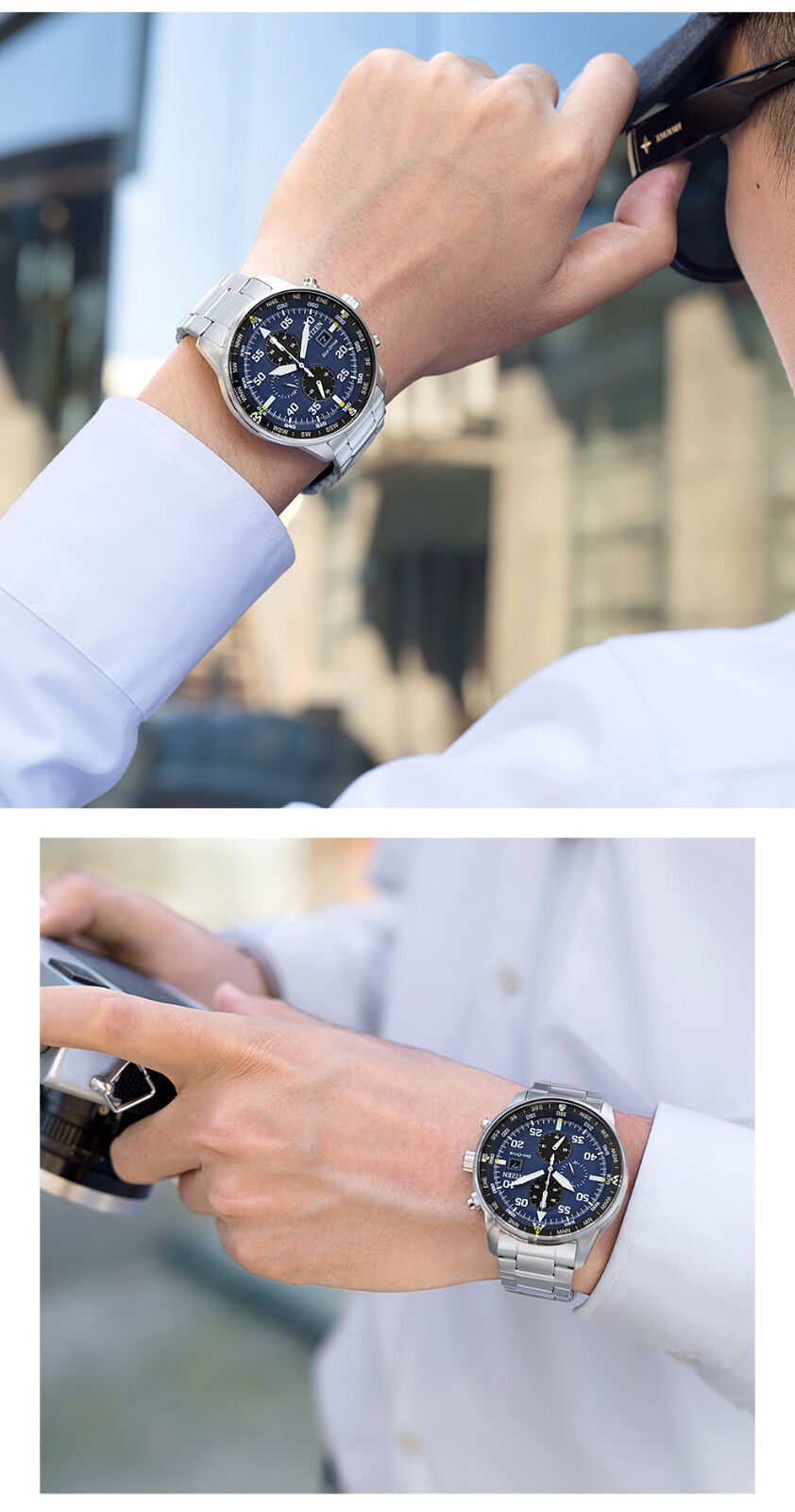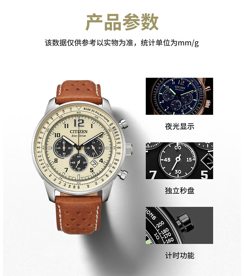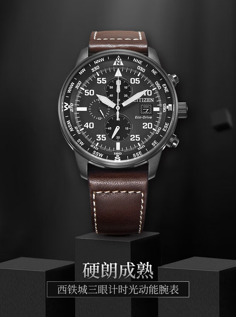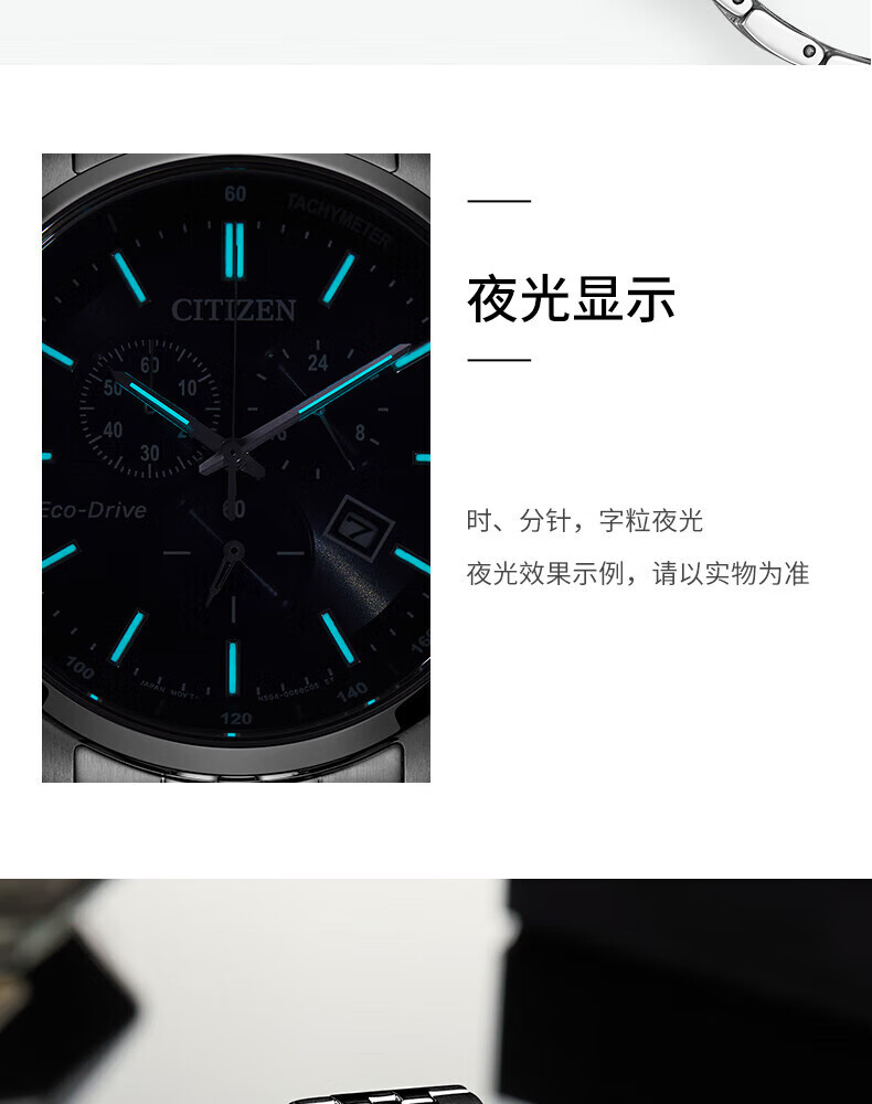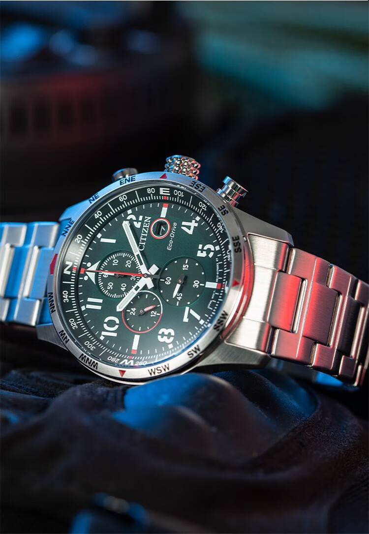 西铁城(CITIZEN)三眼计时防水光动能腕表商务运动休闲钢带/皮带男士手表 新款三眼蓝盘钢带AT2570-56L