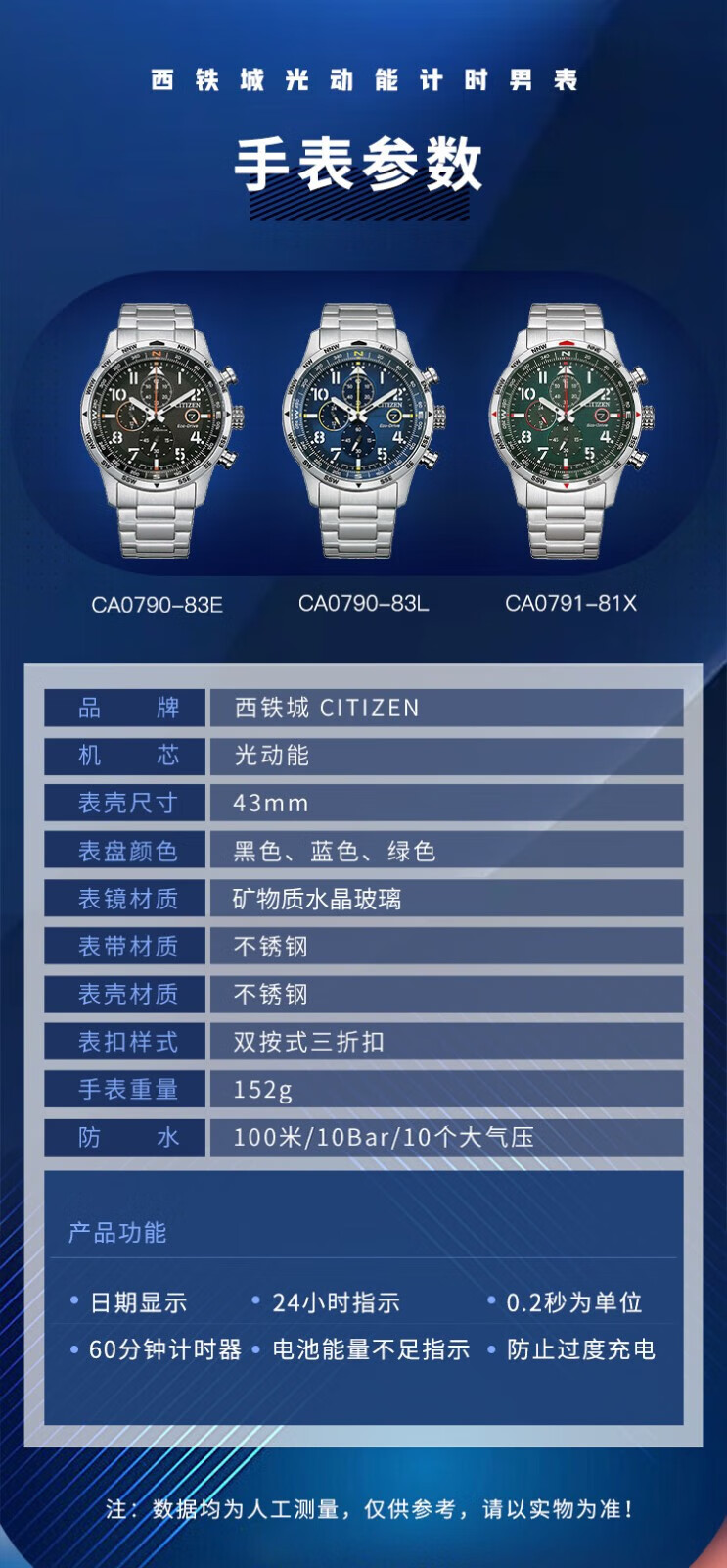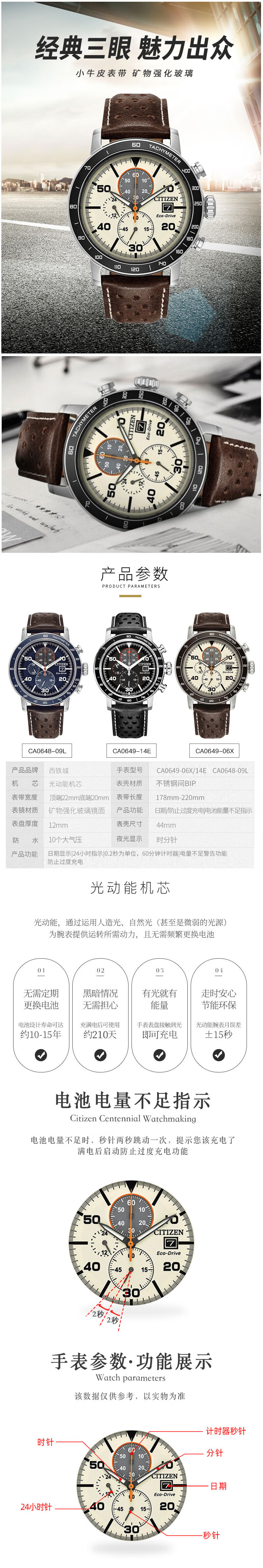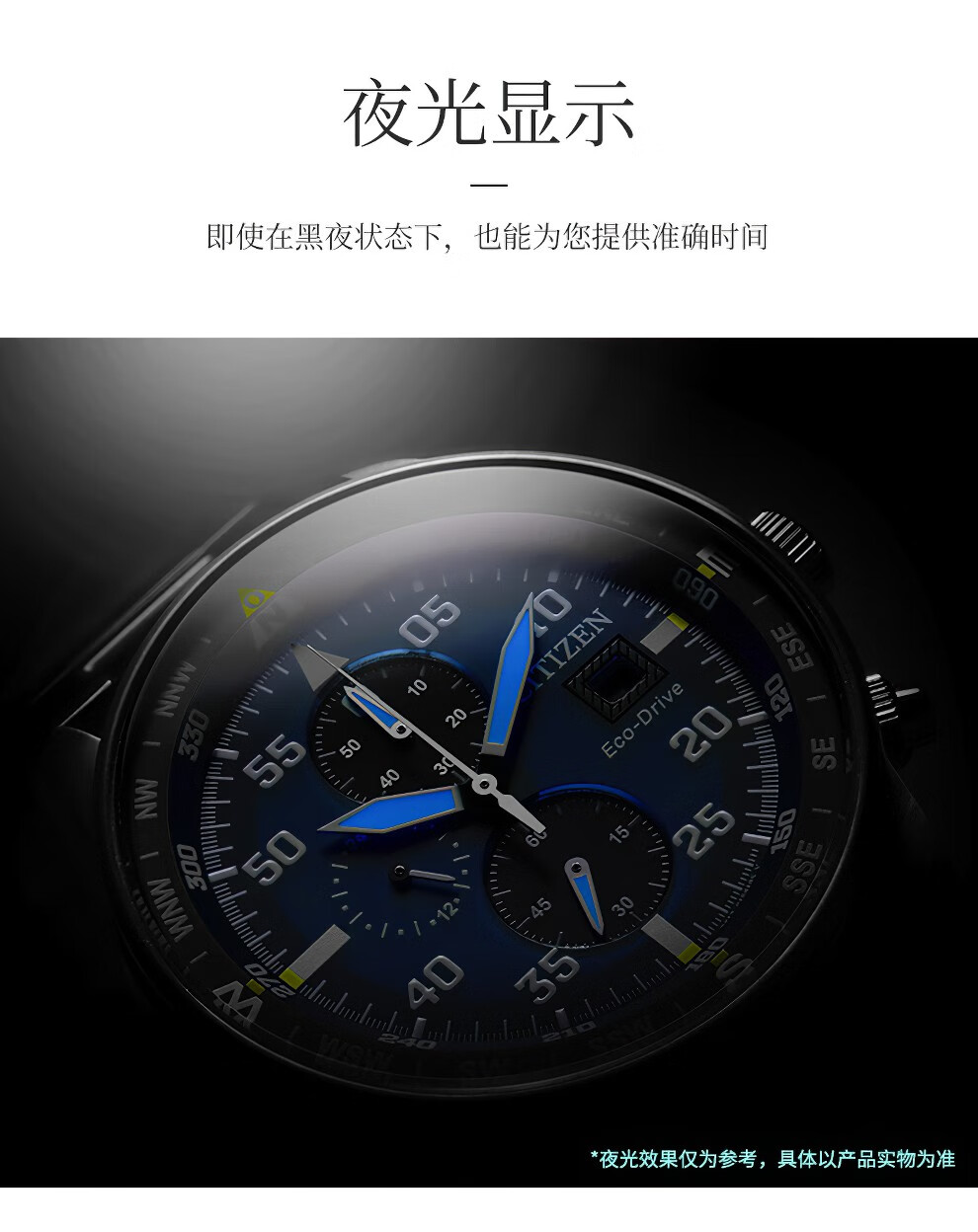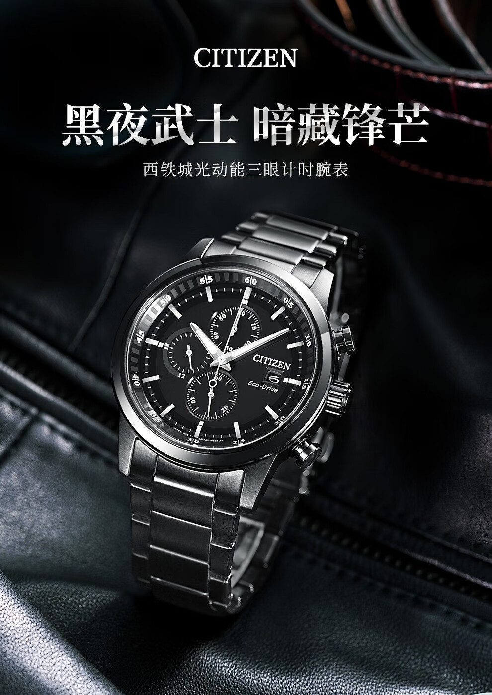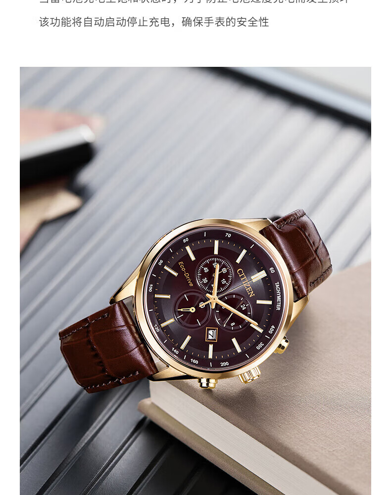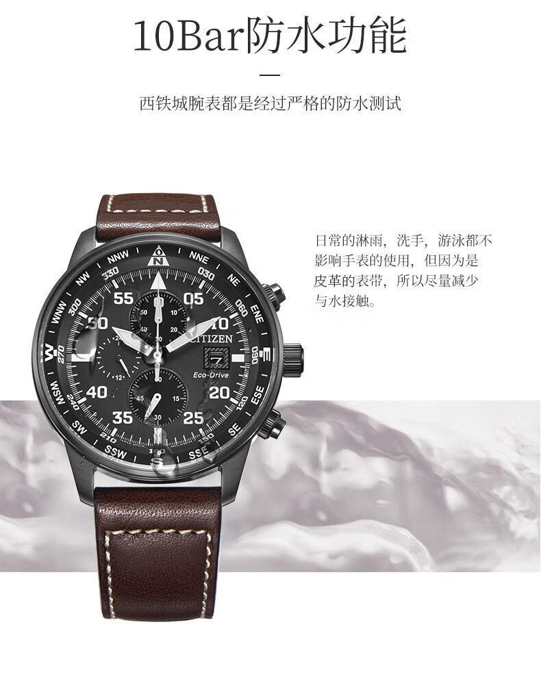 西铁城(CITIZEN)三眼计时防水光动能腕表商务运动休闲钢带/皮带男士手表 新款三眼蓝盘钢带AT2570-56L