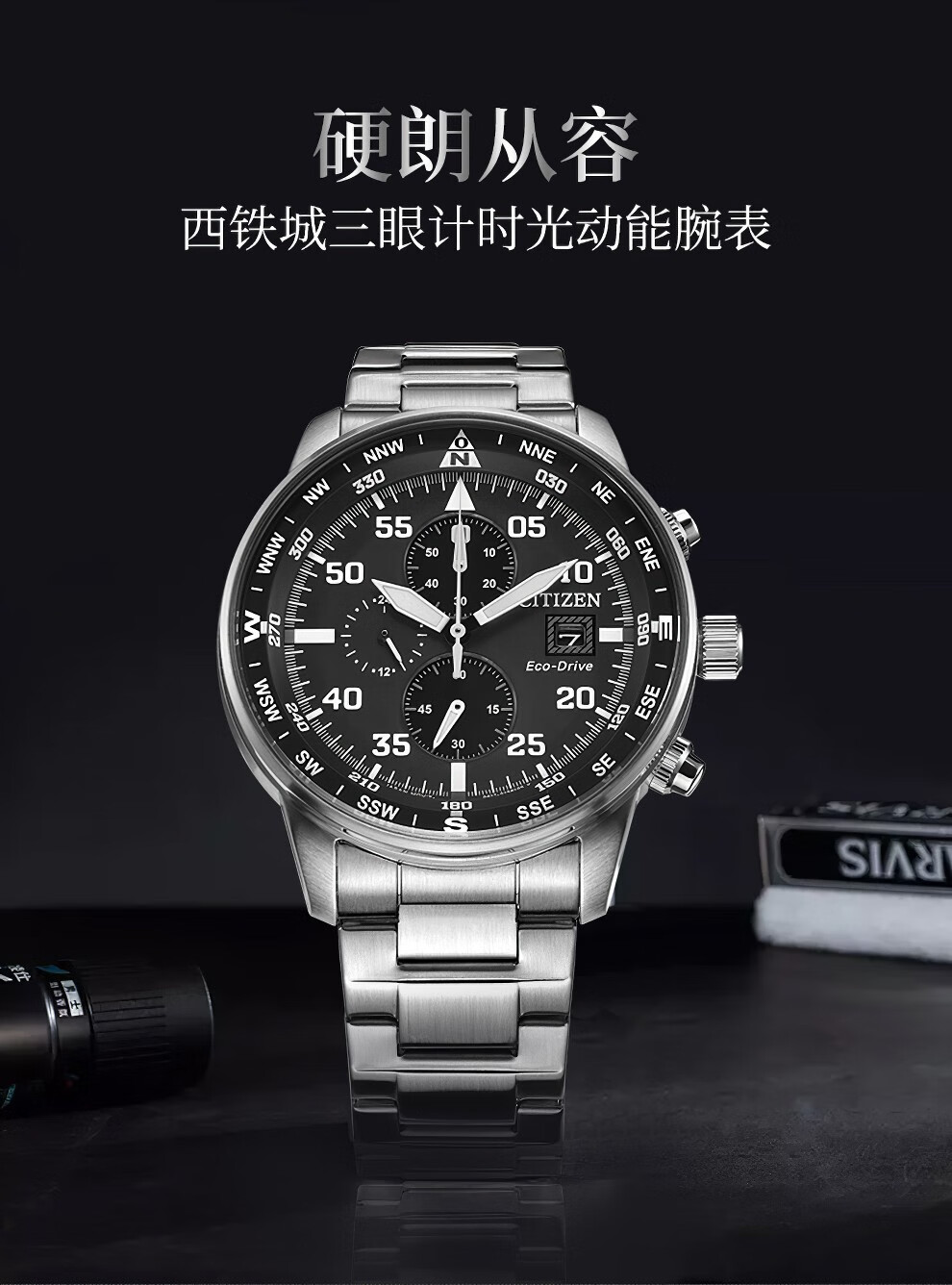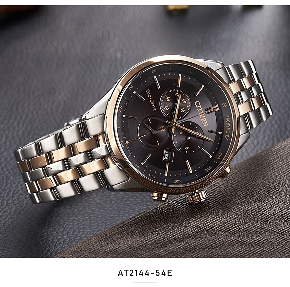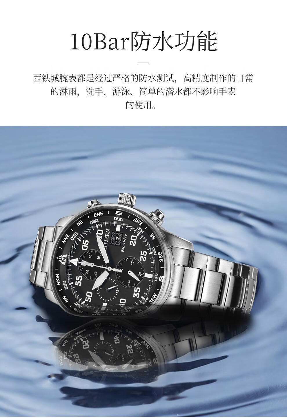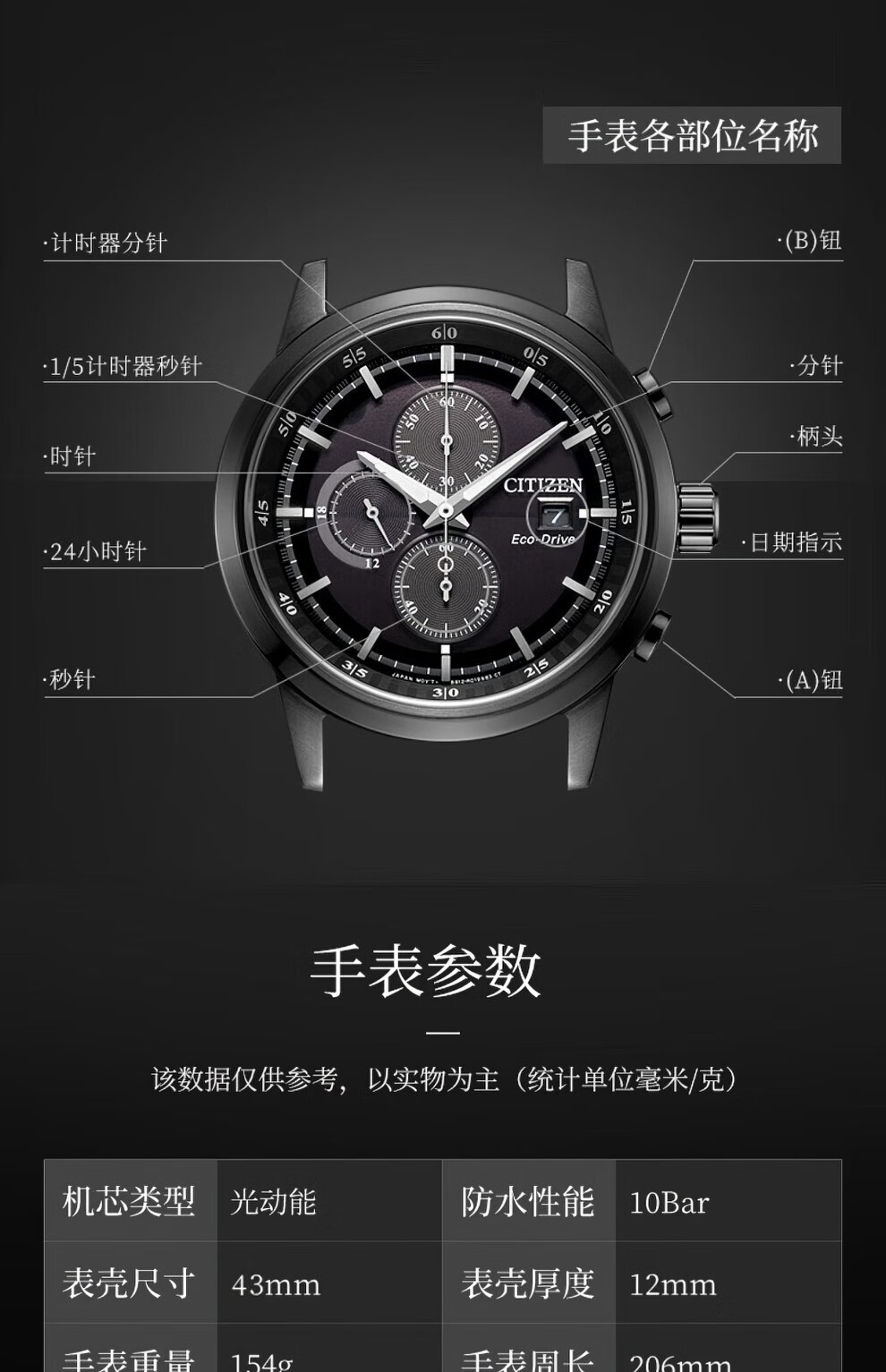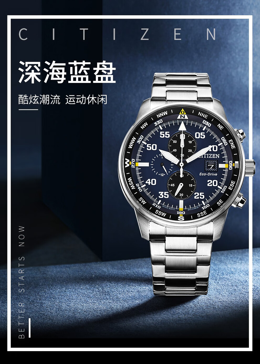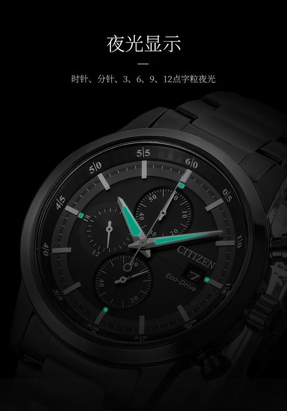 西铁城(CITIZEN)三眼计时防水光动能腕表商务运动休闲钢带/皮带男士手表 新款三眼蓝盘钢带AT2570-56L
