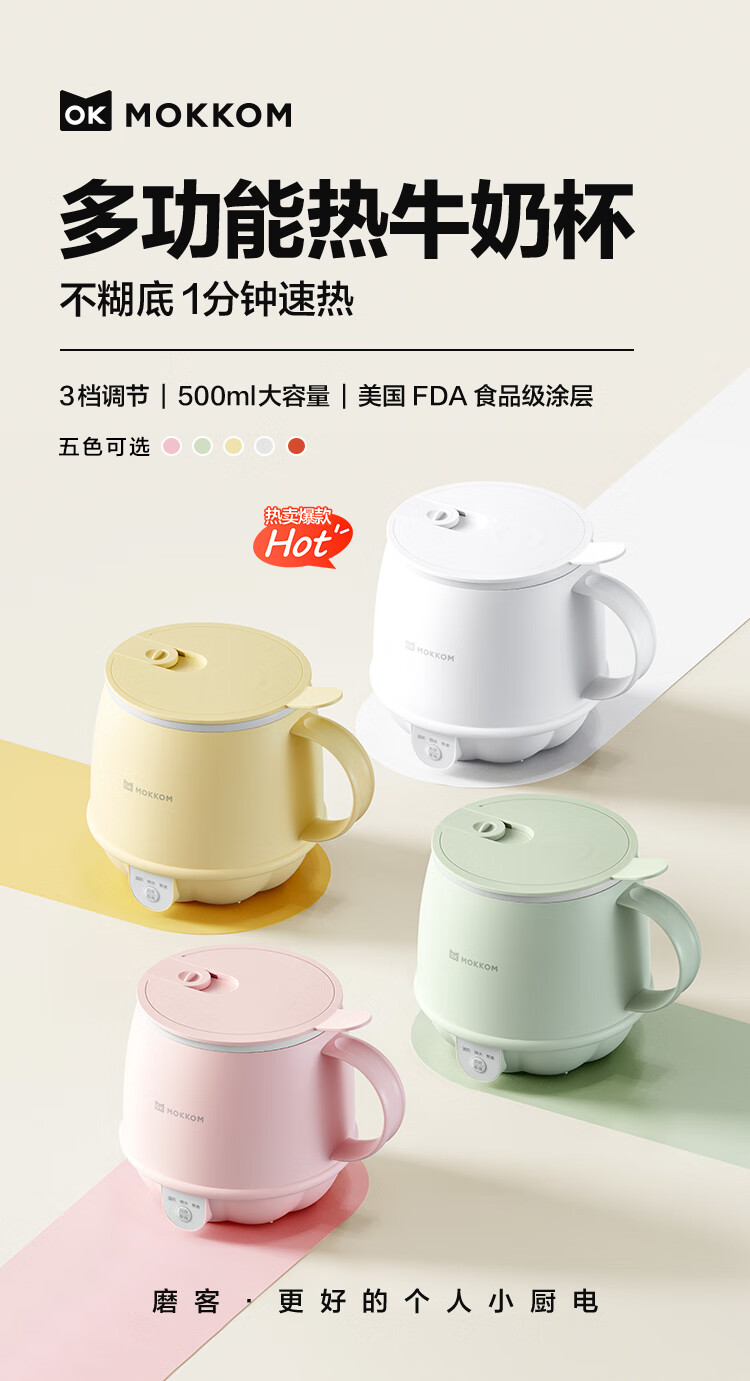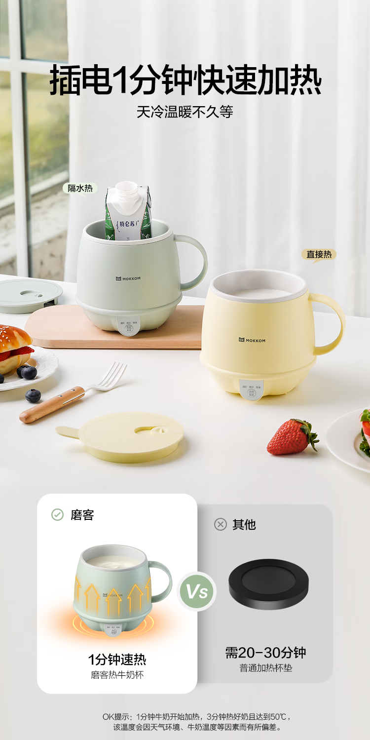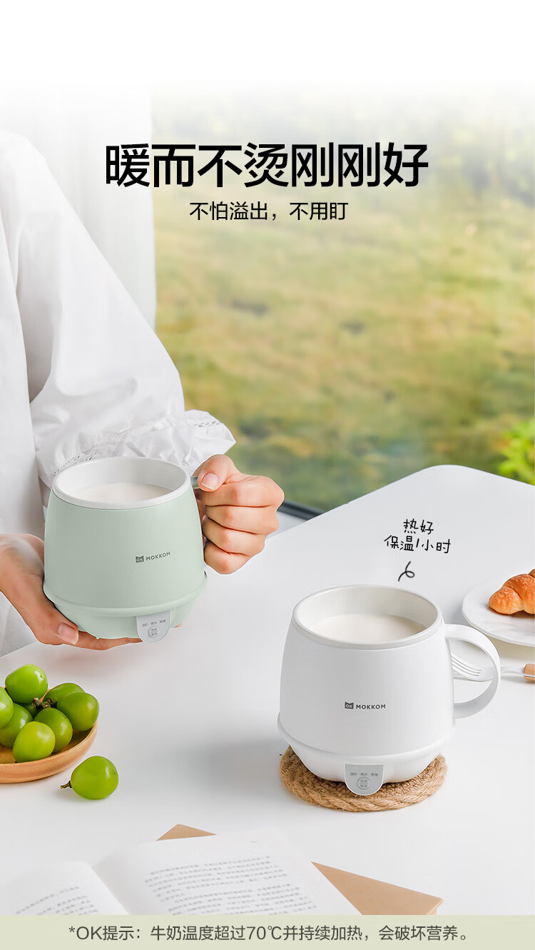 mokkom磨客养生壶 热牛奶杯 办公静音养生杯0.5L 煮茶花茶银耳 热牛奶神器烧水壶办公室烧水杯 热奶杯 浅杉绿 0.5L (送勺子)