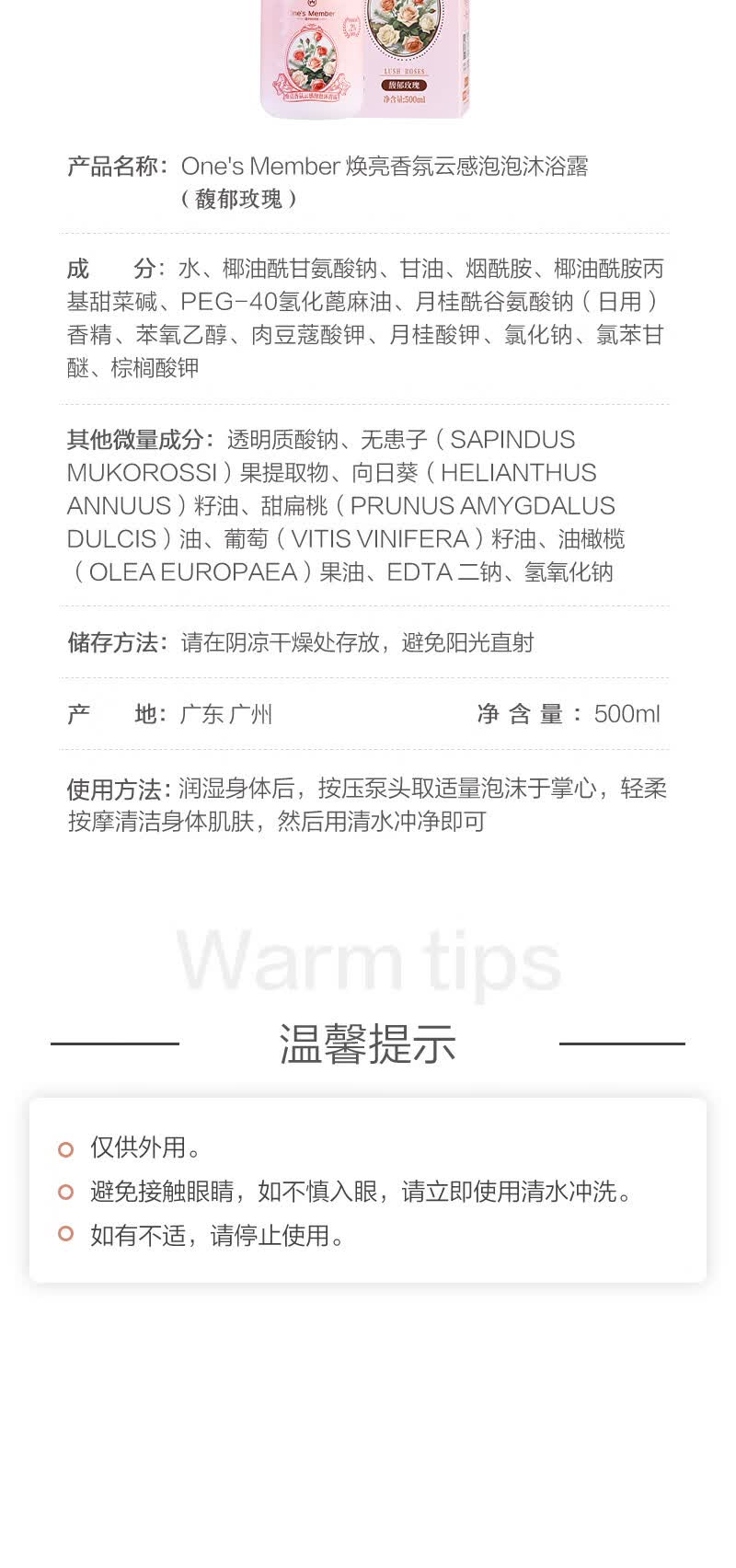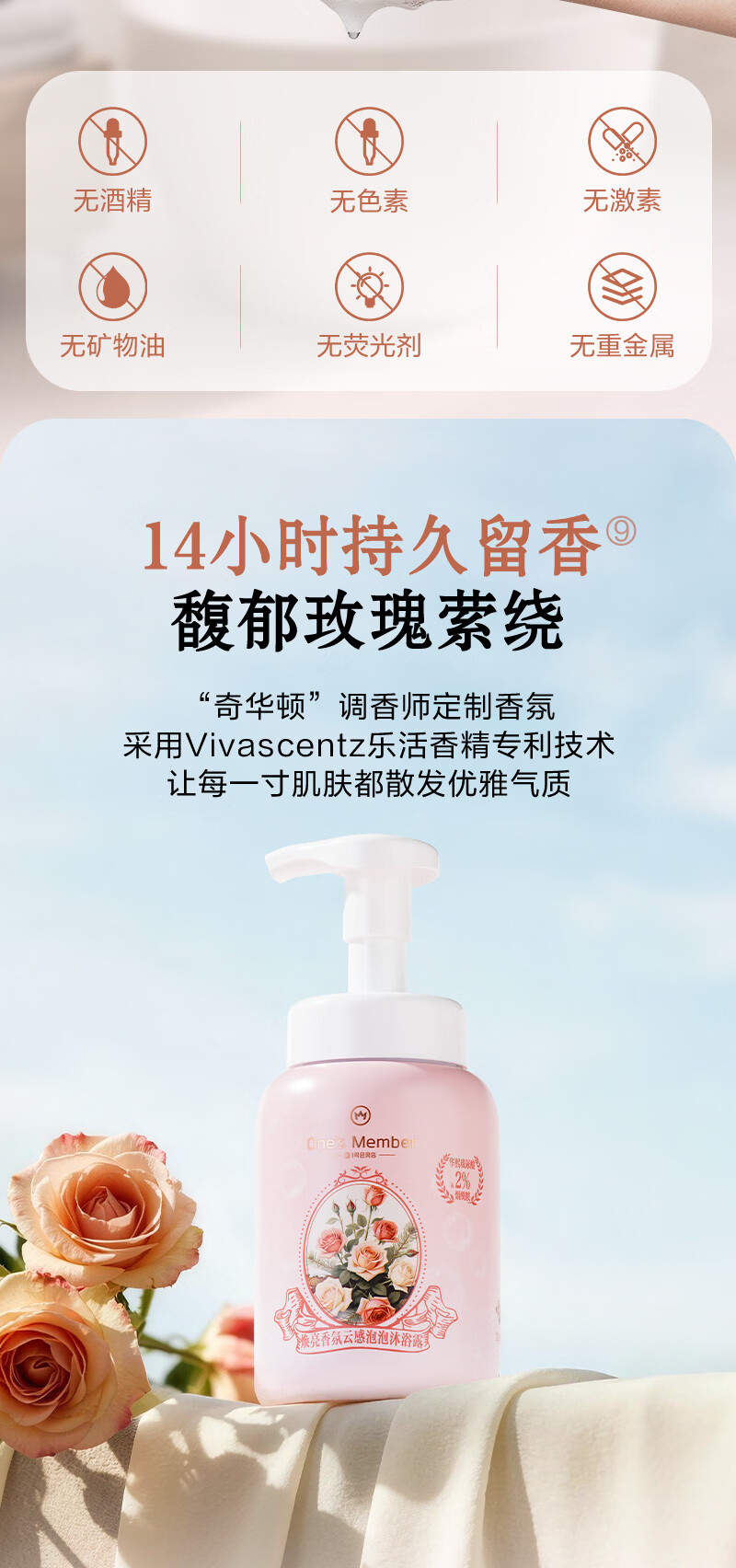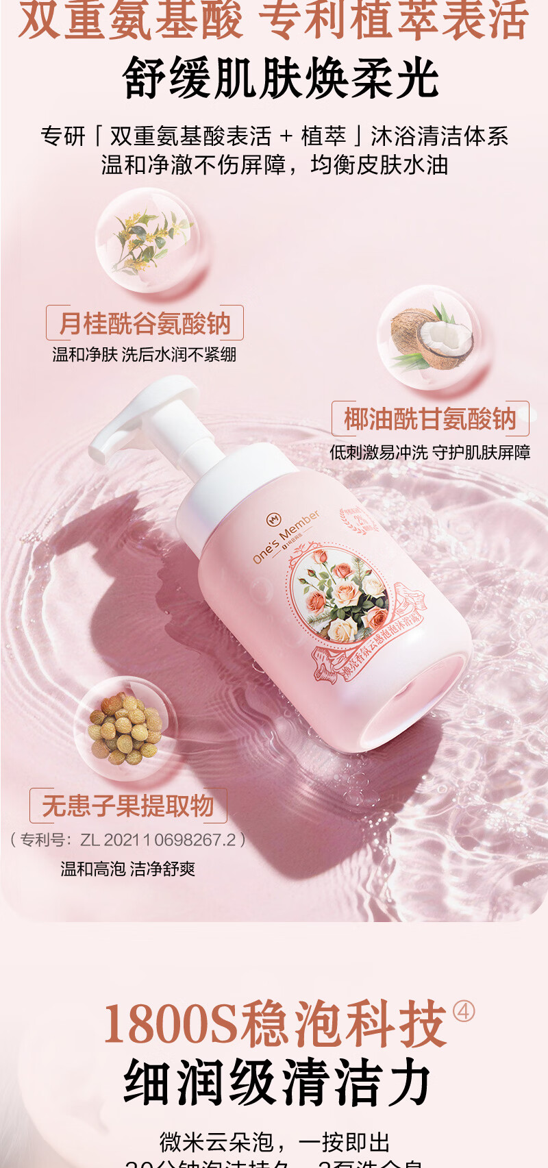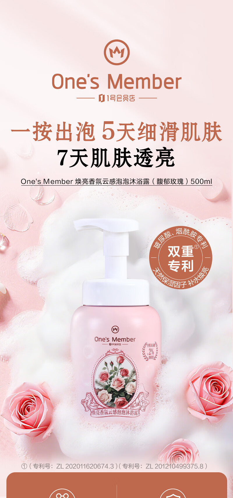1号会员店(One's Member)焕亮香氛云感泡泡沐浴露 馥郁玫瑰香500ml滋润水嫩京东自有品牌