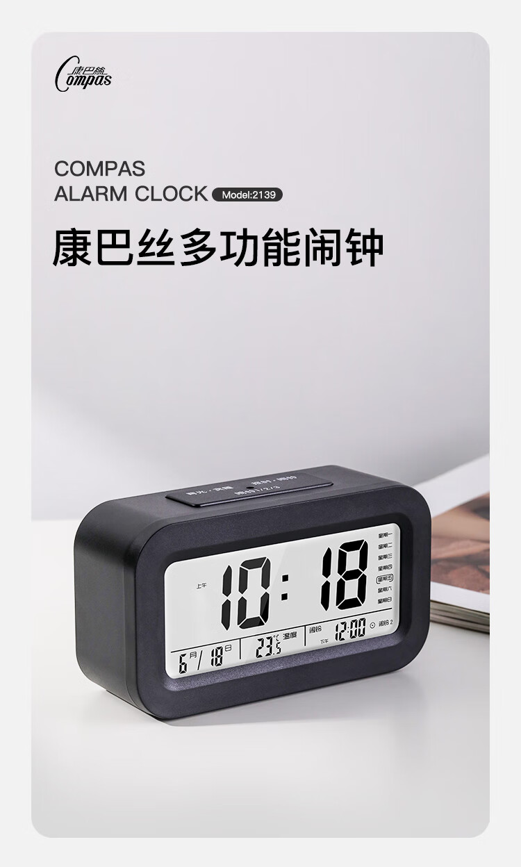 康巴丝(Compas)电子闹钟夜光智能语音报时起床神器闹铃强力叫醒儿童学生床头钟开学必备 2139 白色 开学季