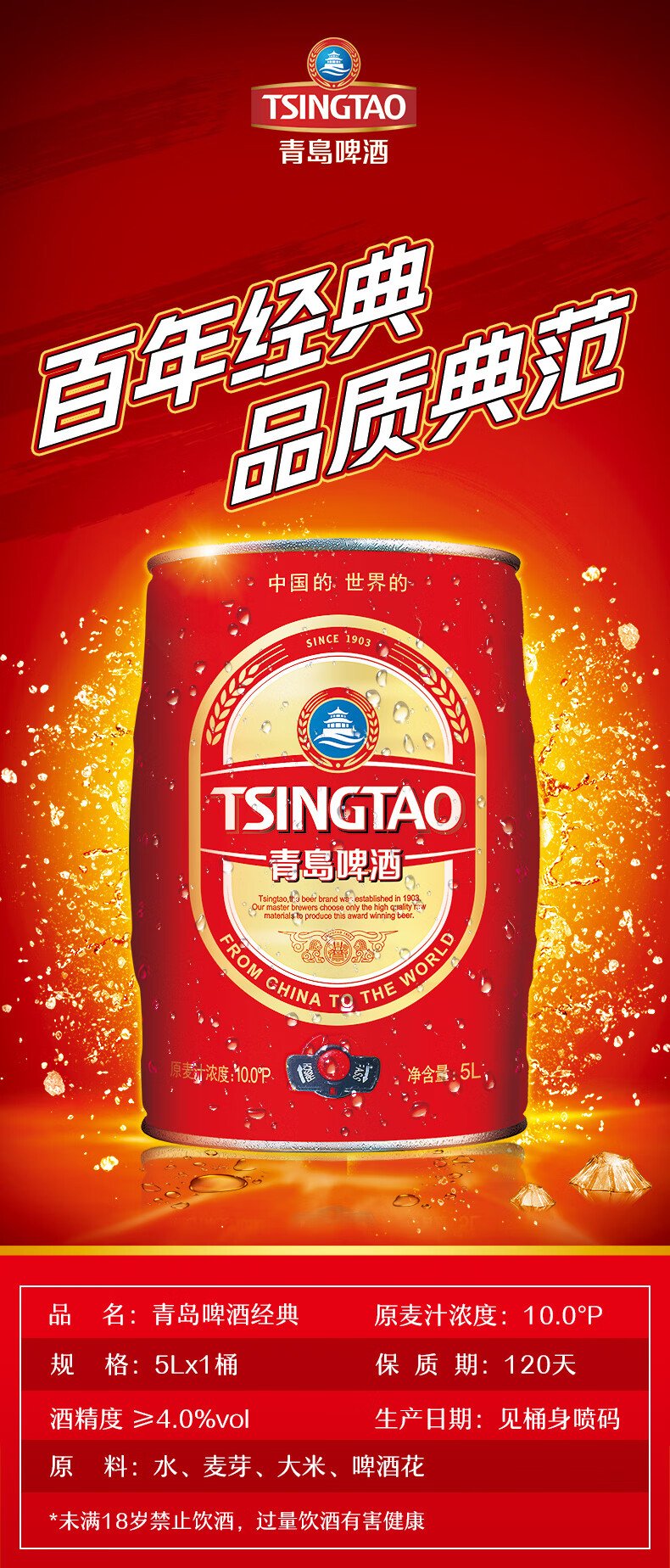 青岛啤酒经典礼盒装桶装啤酒 红金啤酒 原麦汁浓度10°P 5L 1桶