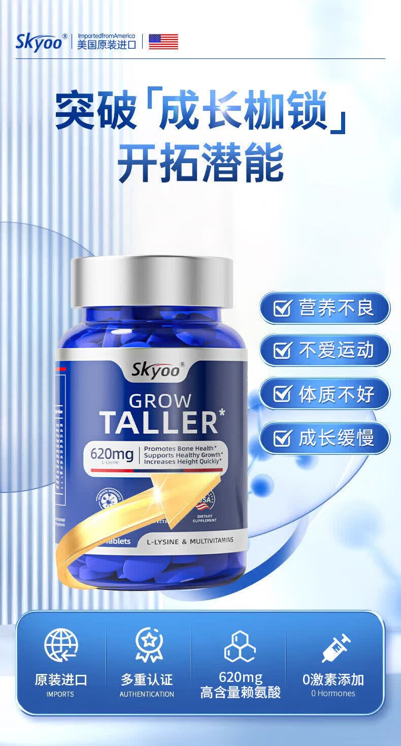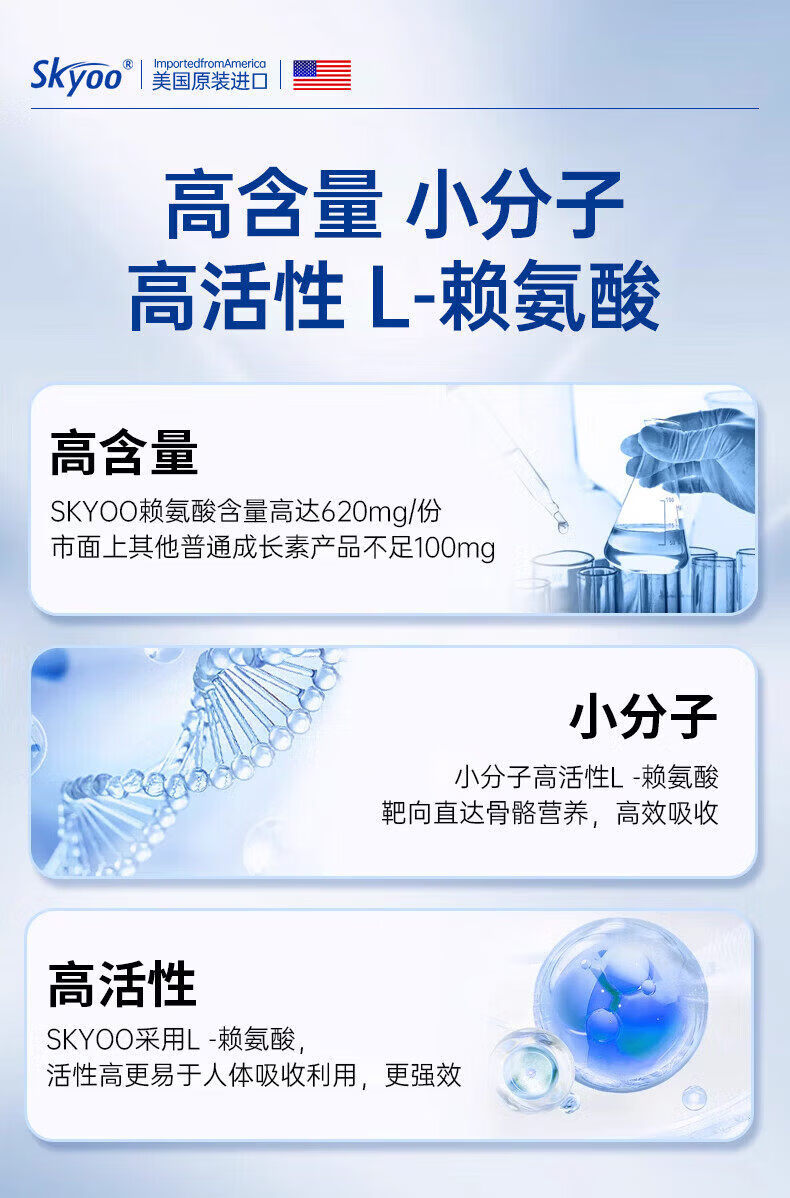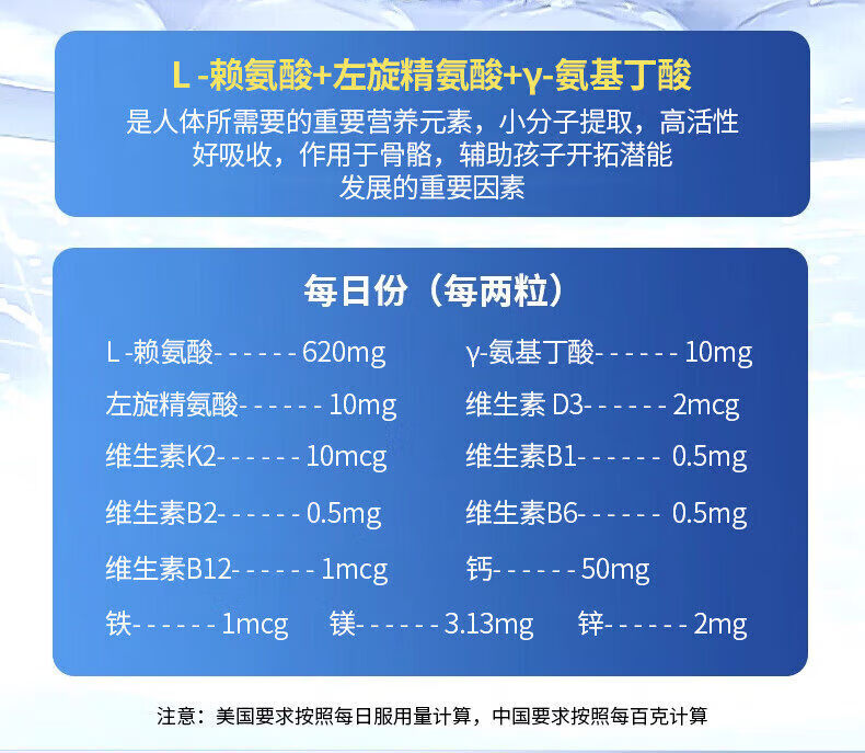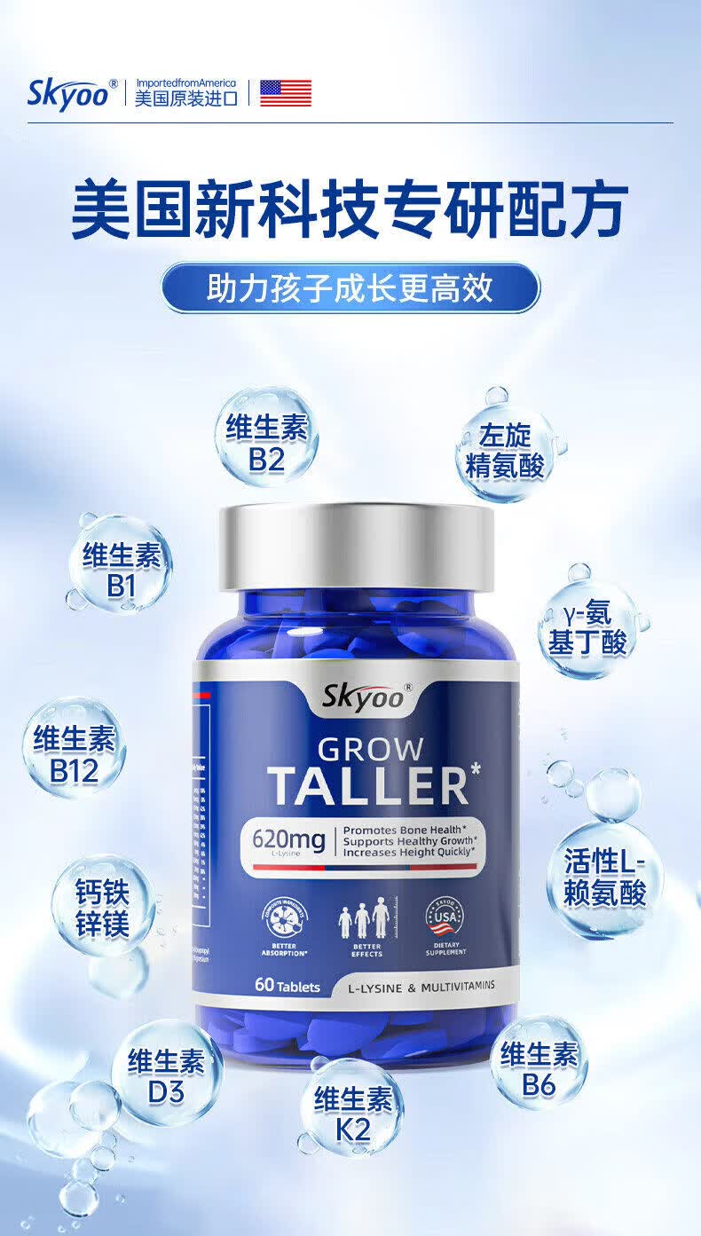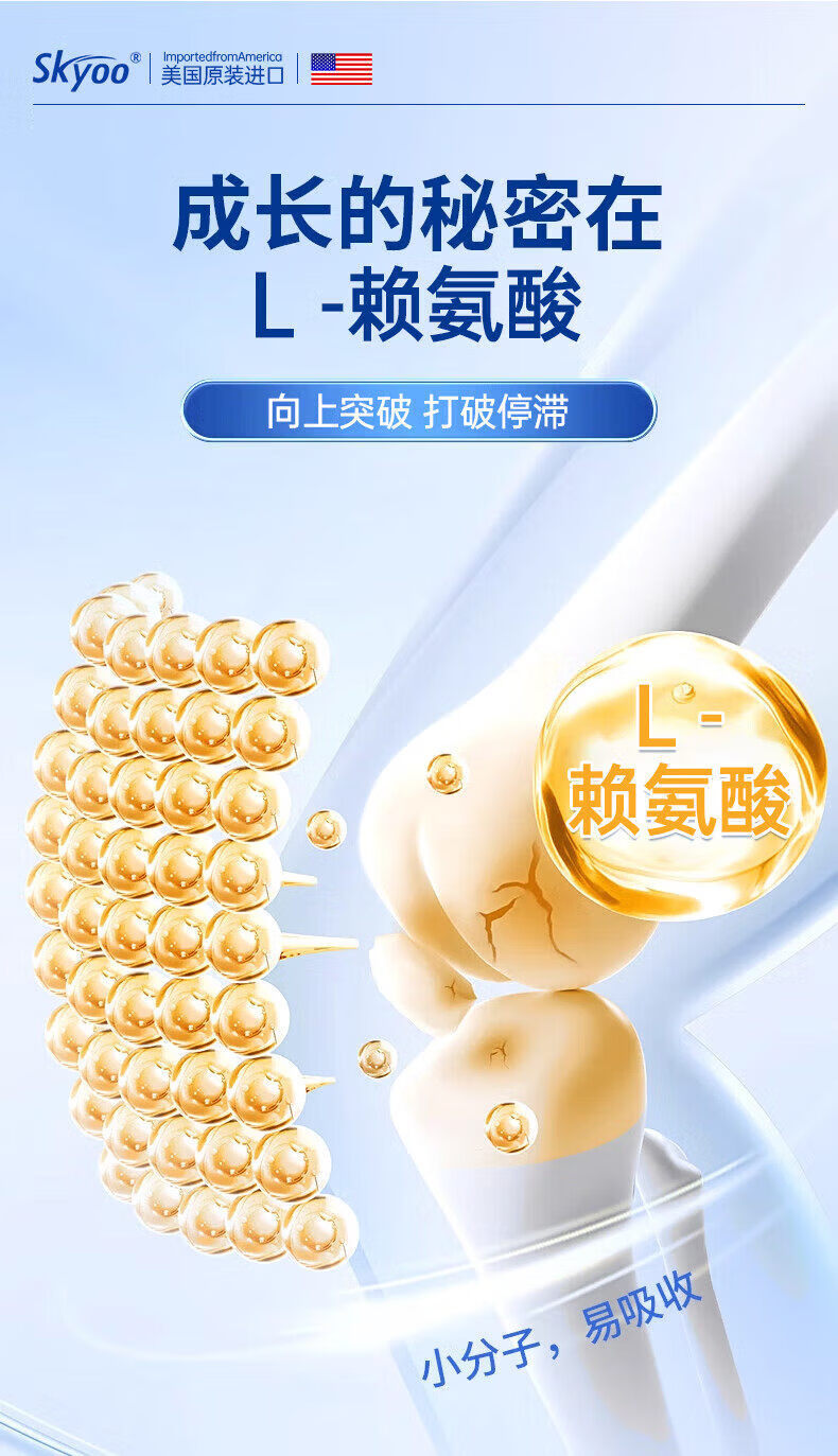 Skyoo美国进口赖氨酸钙片青少年补钙助长维生素k2d3氨基丁酸生长 1瓶【体验装】 1瓶*1瓶