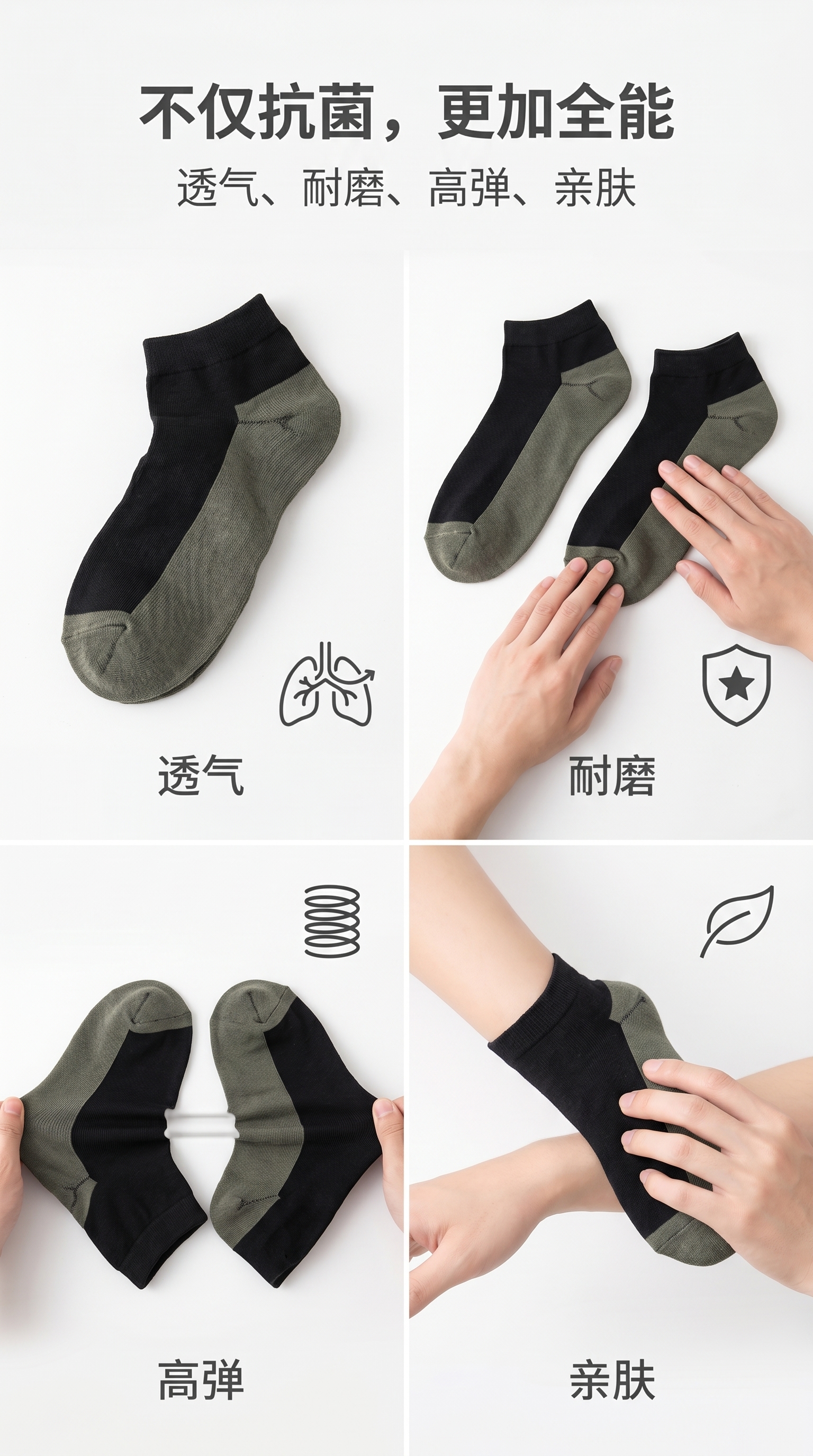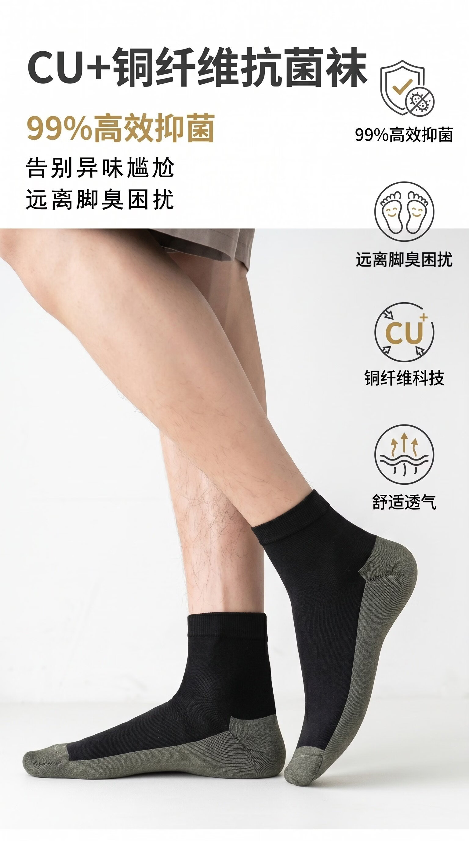 雅鹿CU+铜纤维抗菌袜 99%抑菌防臭中筒袜 吸汗透气商务休闲竹纤维男袜 【短筒】黑灰色双拼 薄款 均码 35-45【10双】