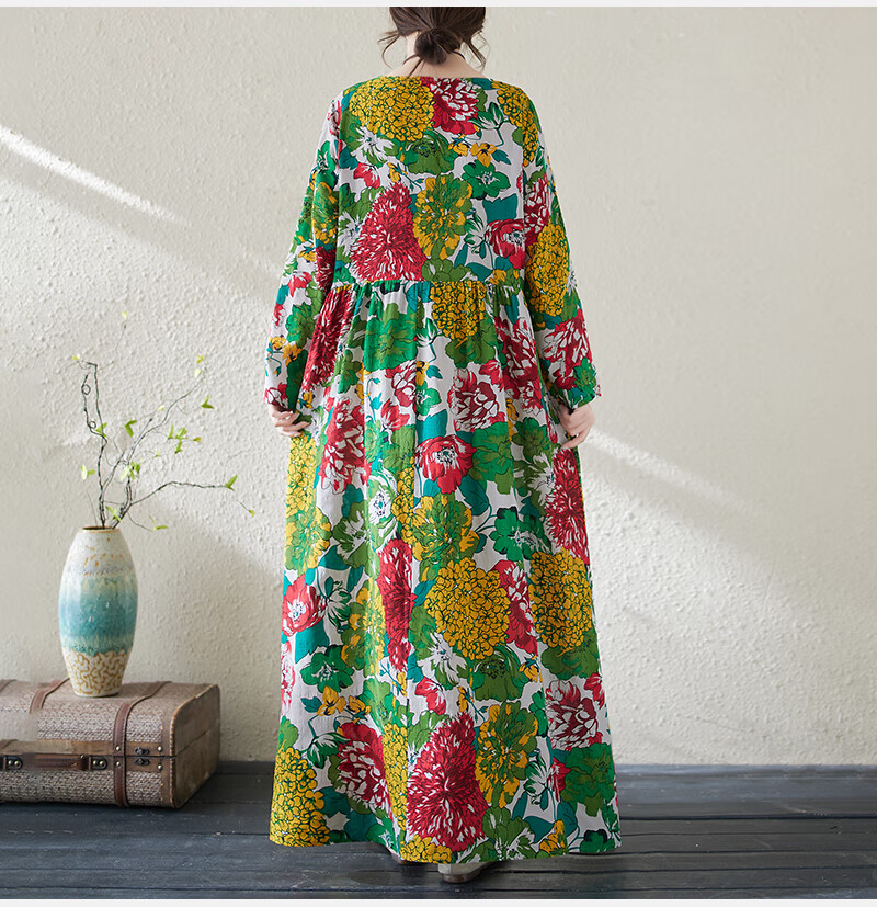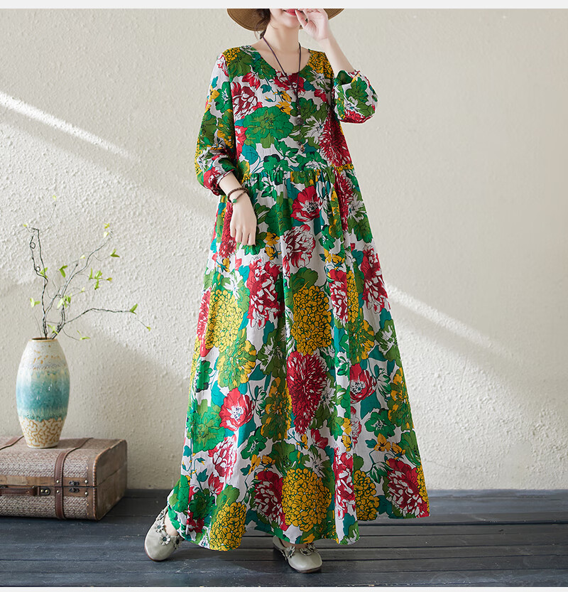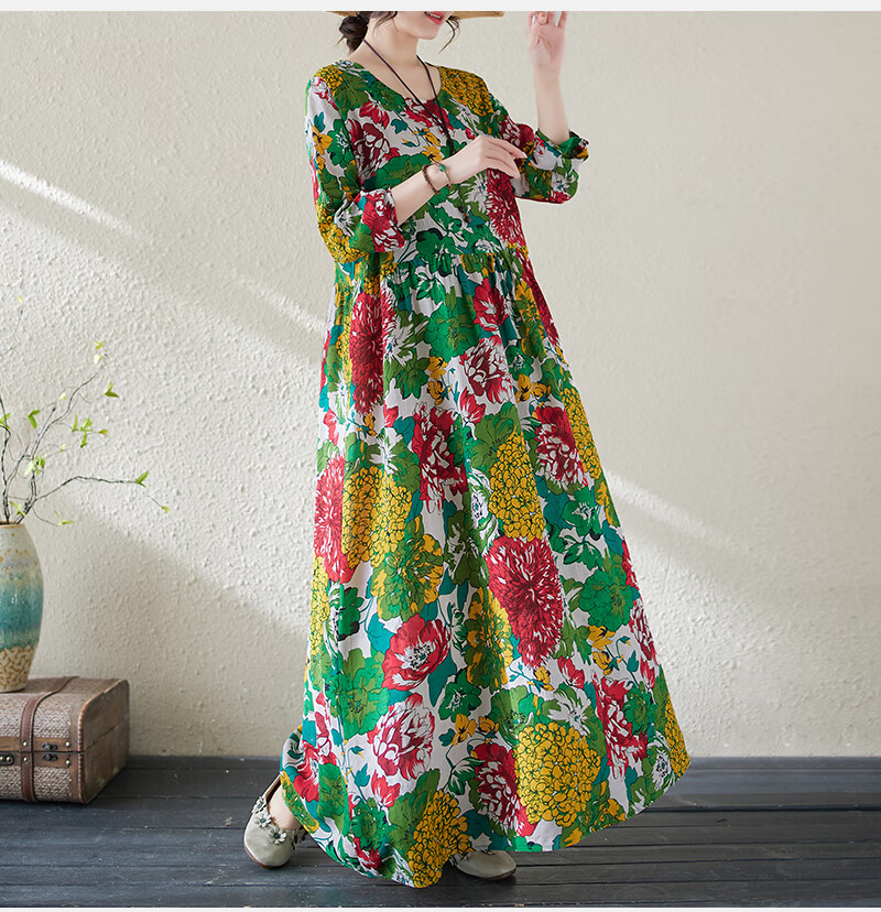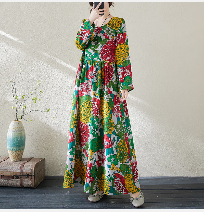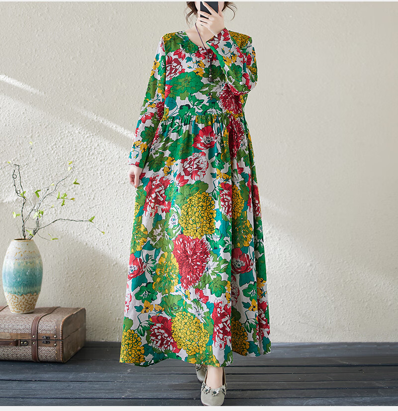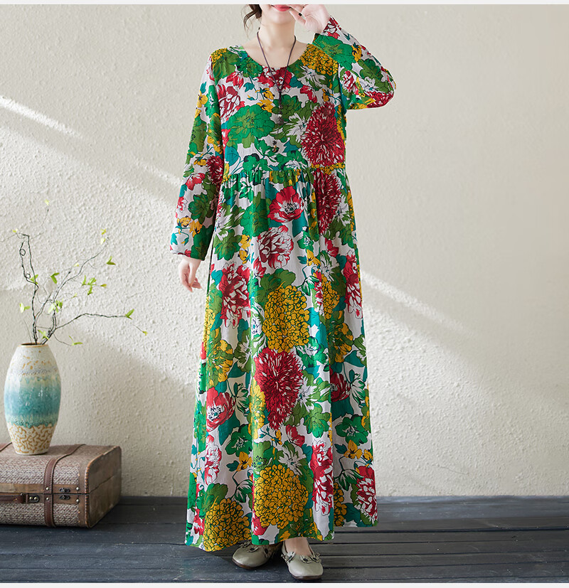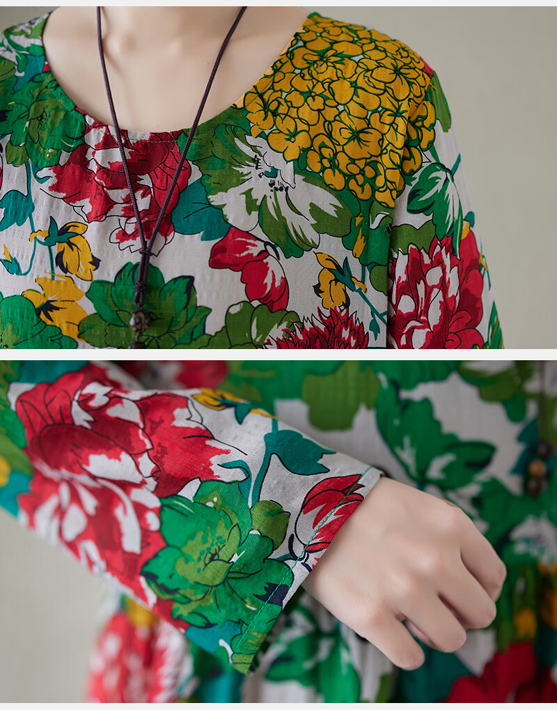 简当(JIANDANG)大码女装春季胖MM花色度假风旅游圆领复古气质长裙遮肉连衣裙1018 绿色大花-1018 L 【120-140斤】