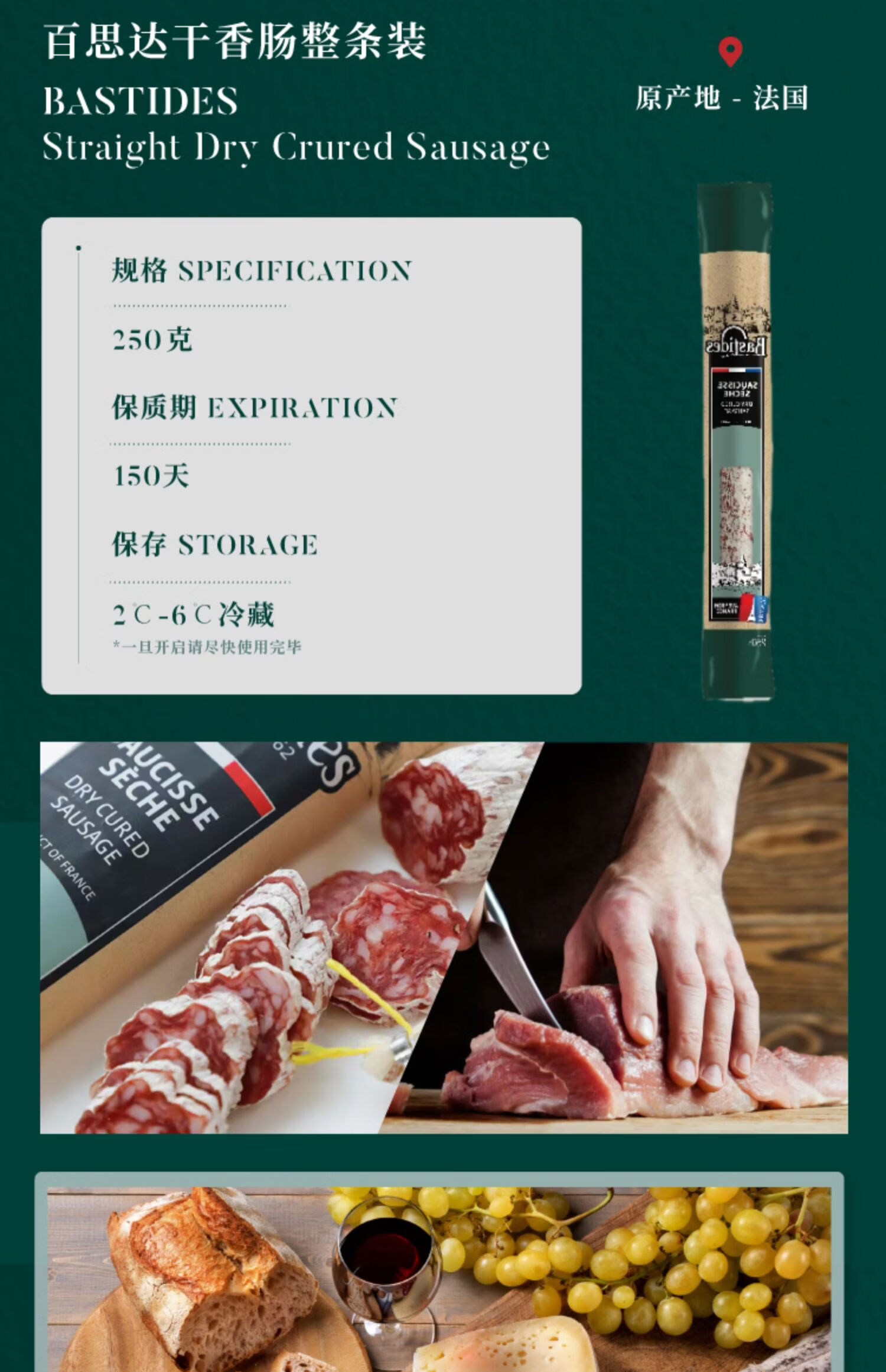 百思达(Bastides)法国原装进口风干萨拉米香肠 原味腊肠烤肠法式香肠即食肉枣香肠 蓝纹萨拉米250g/整根