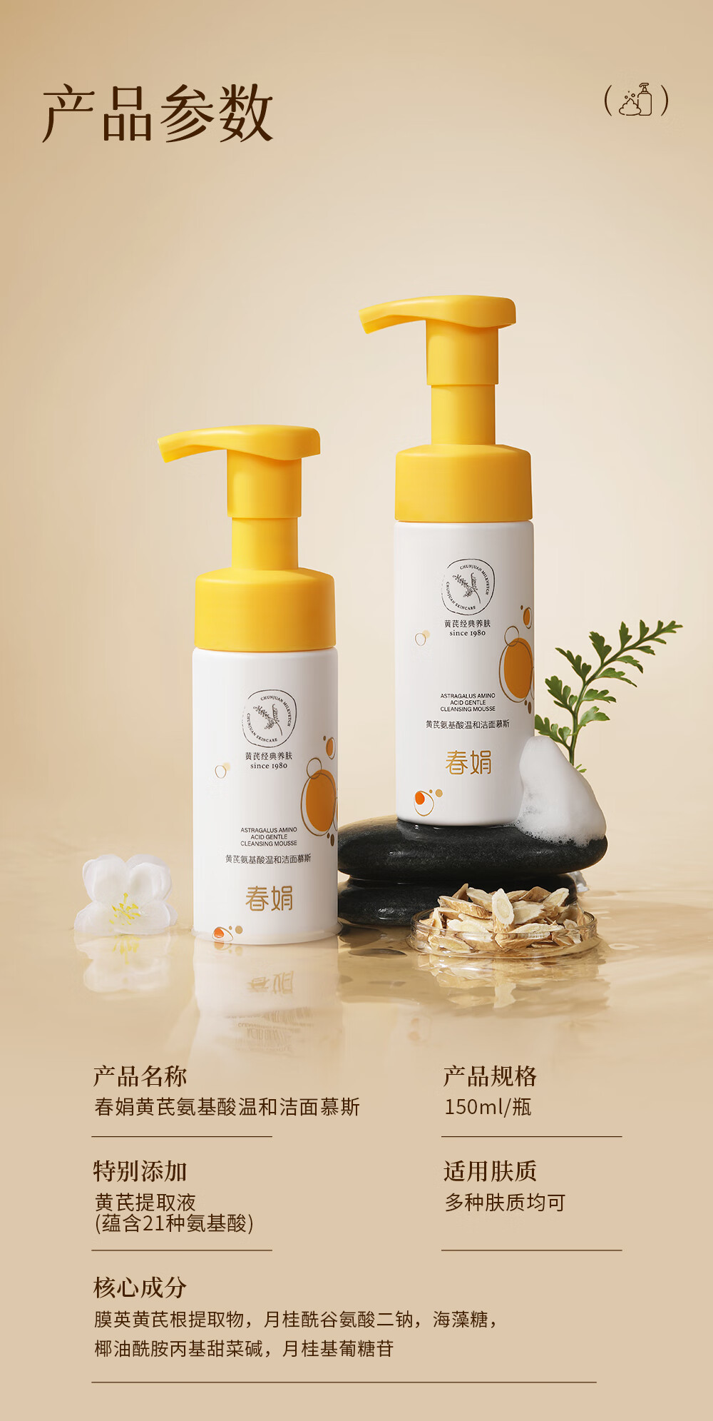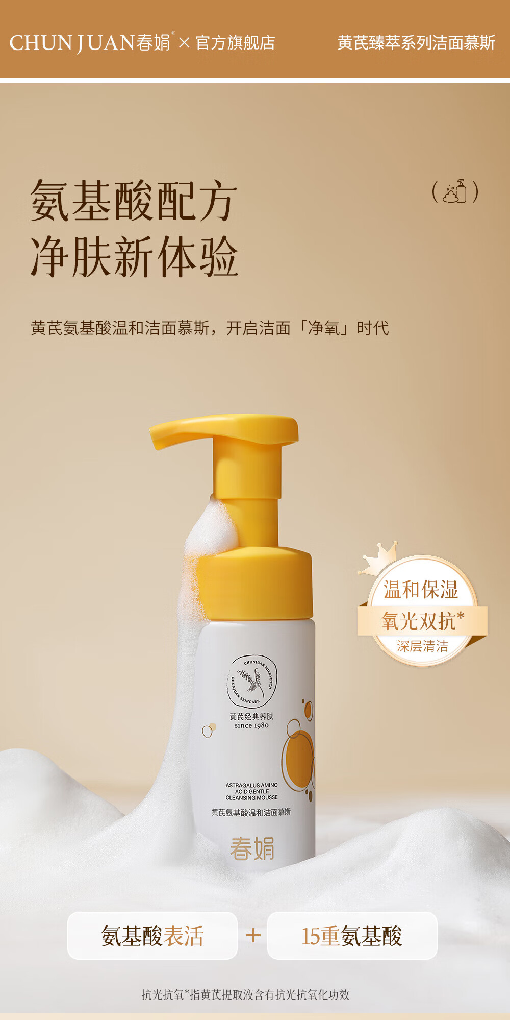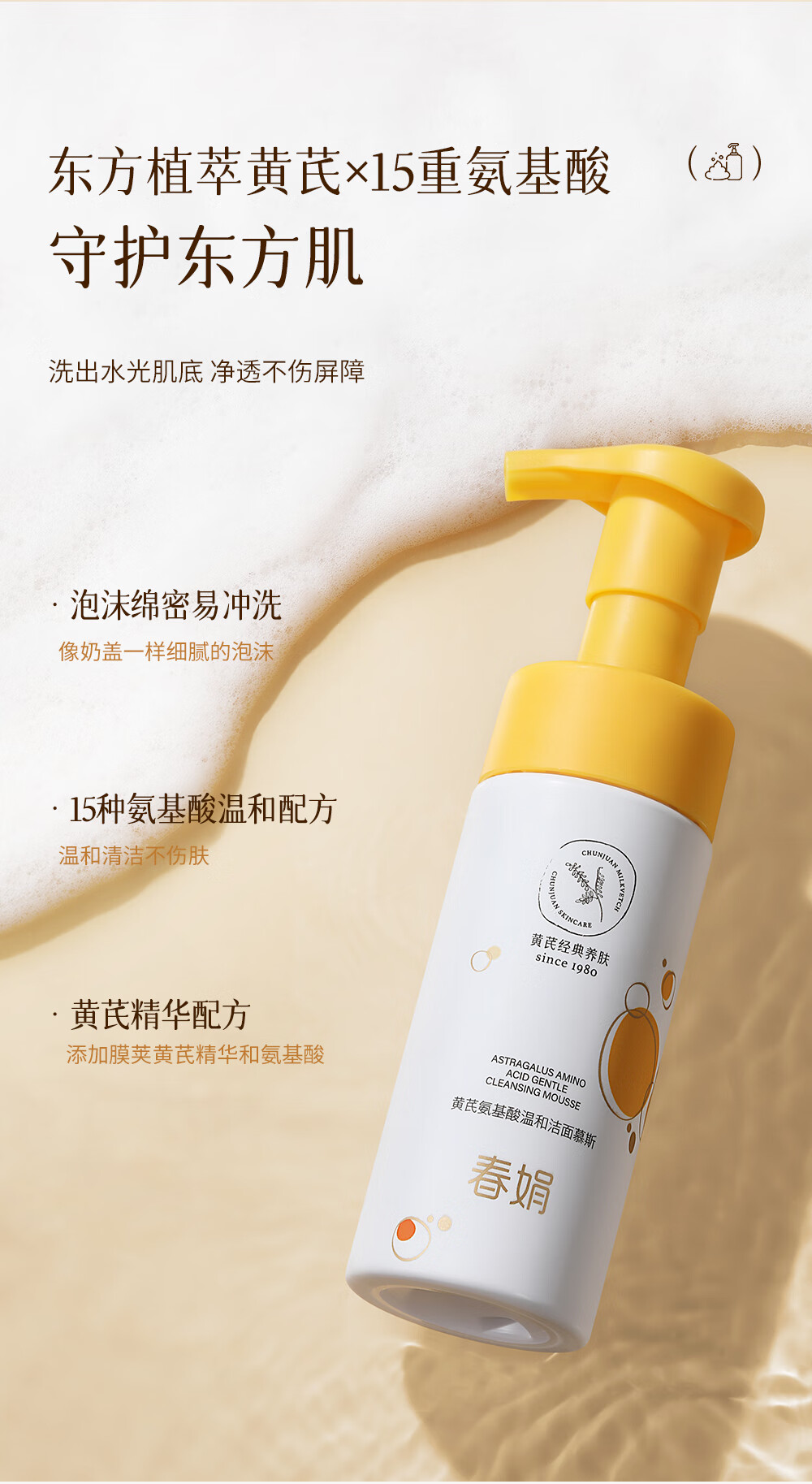 春娟黄芪氨基酸温和洁面慕斯150ml 古植清洁洗面奶绵密泡沫学生 洁面慕斯150ml