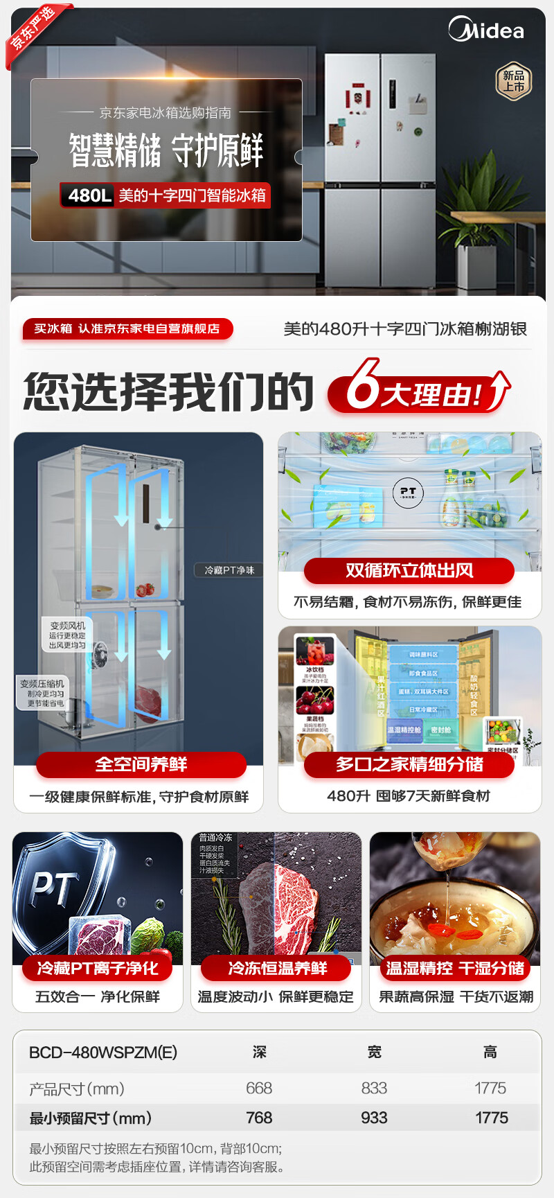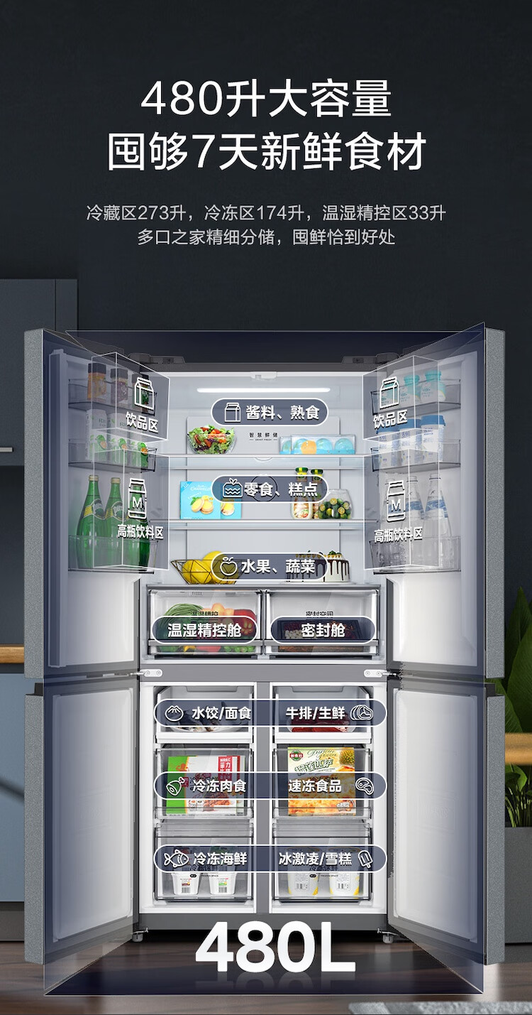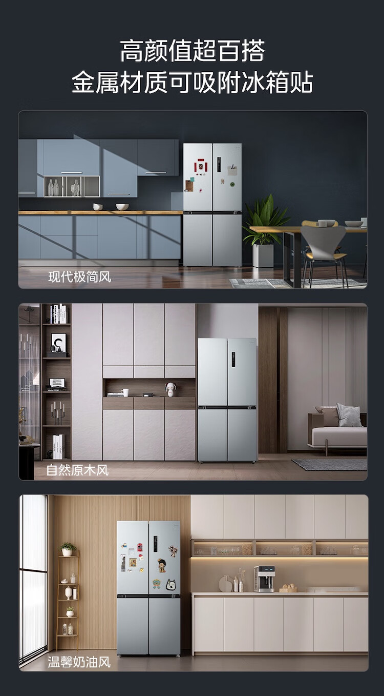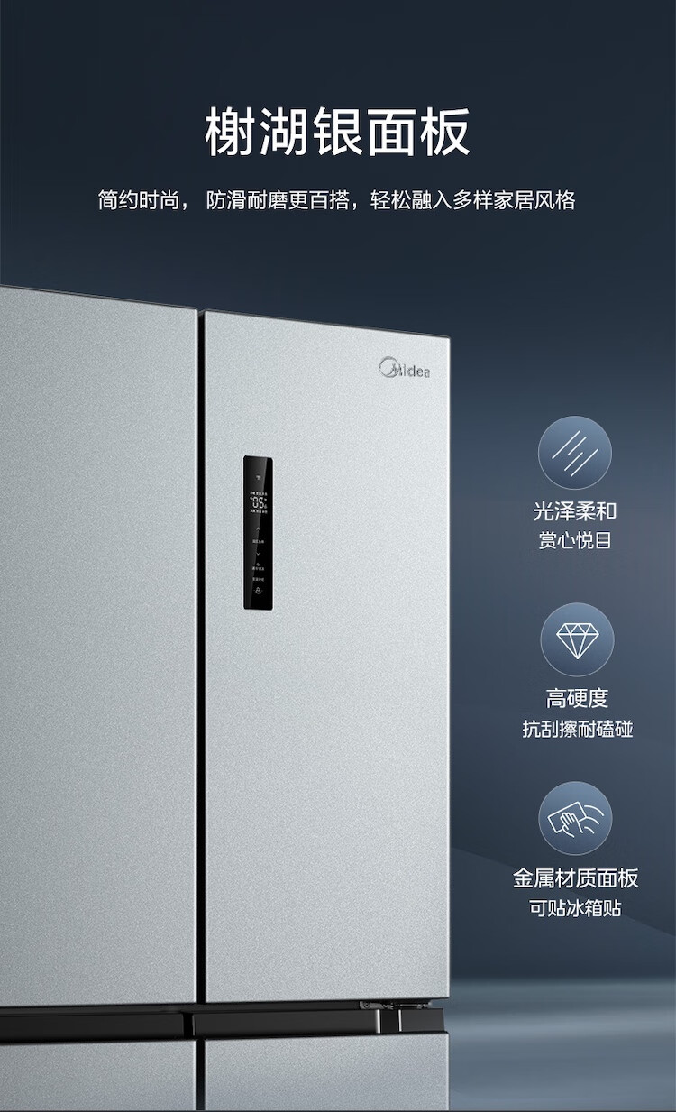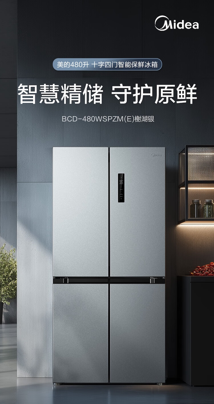美的冰箱480升十字四开门慧鲜系列双循环双变频三挡变温净味一级能效风冷无霜BCD-480WSPZM(E)国家补贴