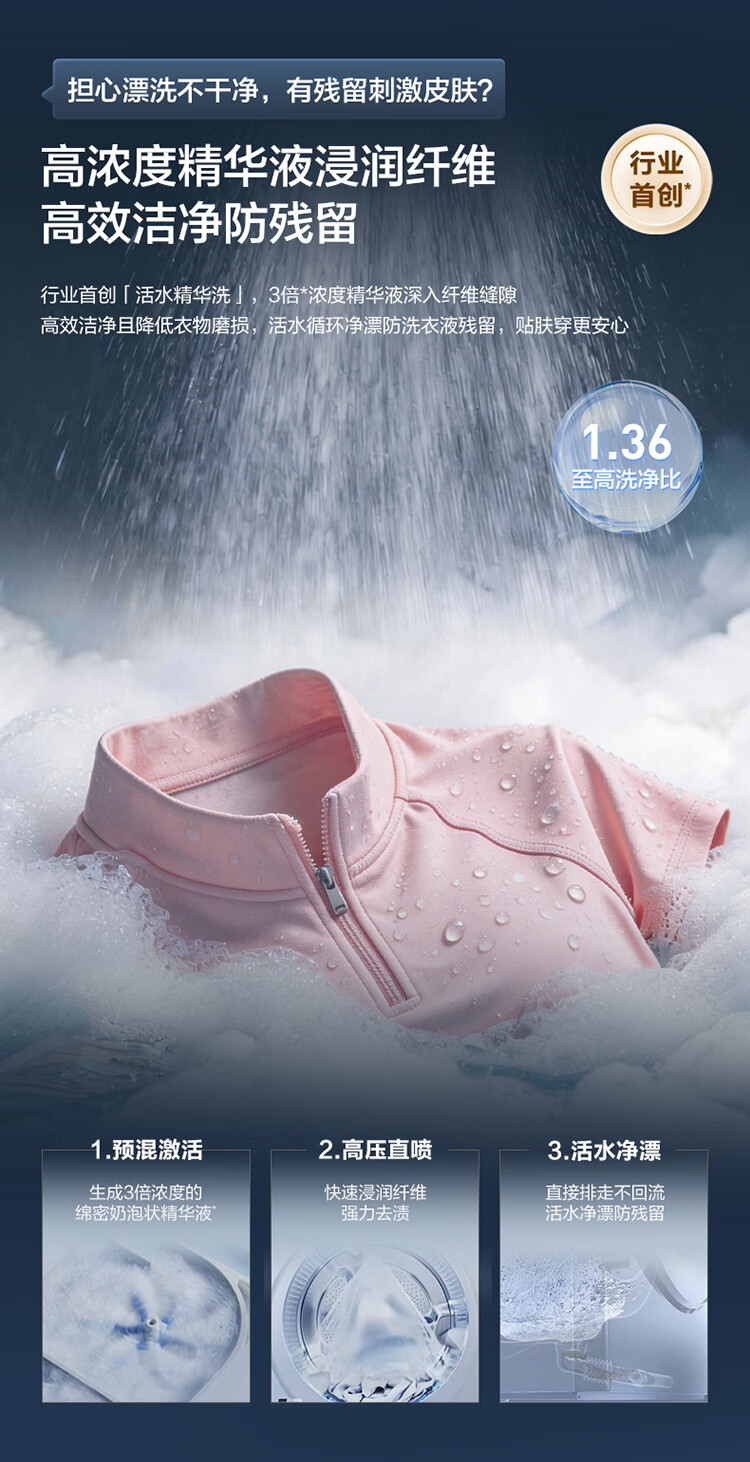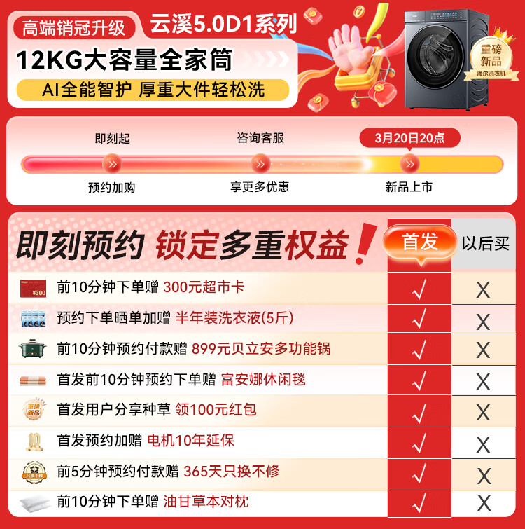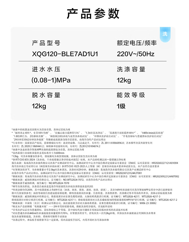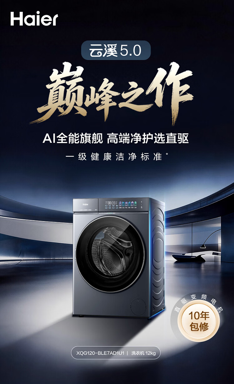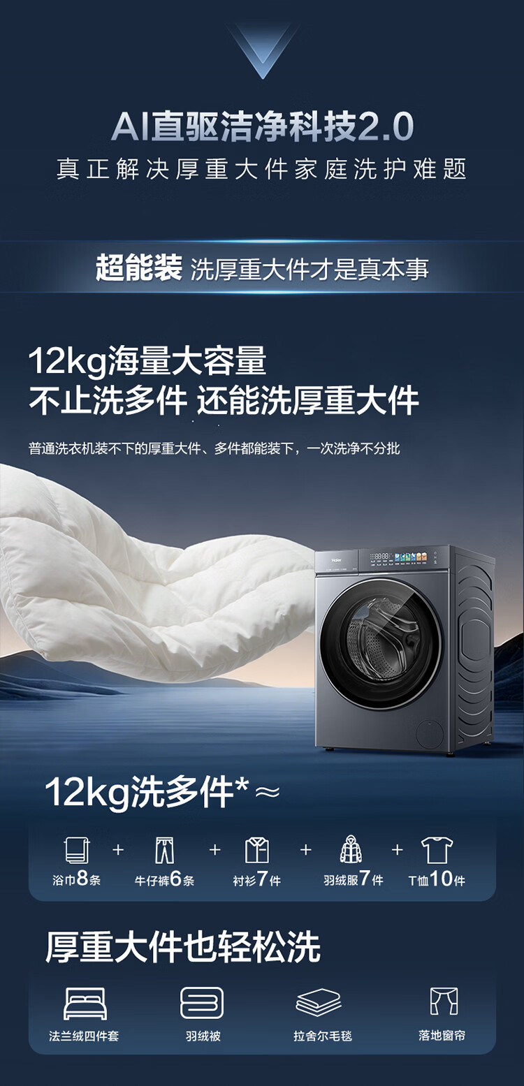 海尔(Haier)云溪5.0 D1 全自动滚筒洗衣机AWE同款12KG 家用大容量全家筒AI直驱洁净双效除菌 XQG120-BLE7AD1U1 12KG 单洗 首创雨沐洗+AI直驱+1.36高洗净比